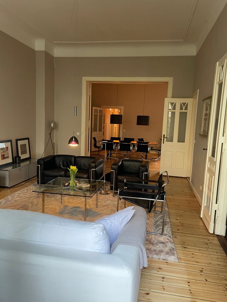 Größe 180 qm, 5 Zimmer, 2. Stock Vorderhaus, hochwertig renoviert, lichtdurchflutet, Holzboden (Parkett, Dielen), große Flügeltüren, Originalstuck, glattgeputzte Wände (Deckenhöhe: ca. 3,85 m) große offene Küche, Balkon, Altbau Gründerzeit, Fahrstuhl vorhanden