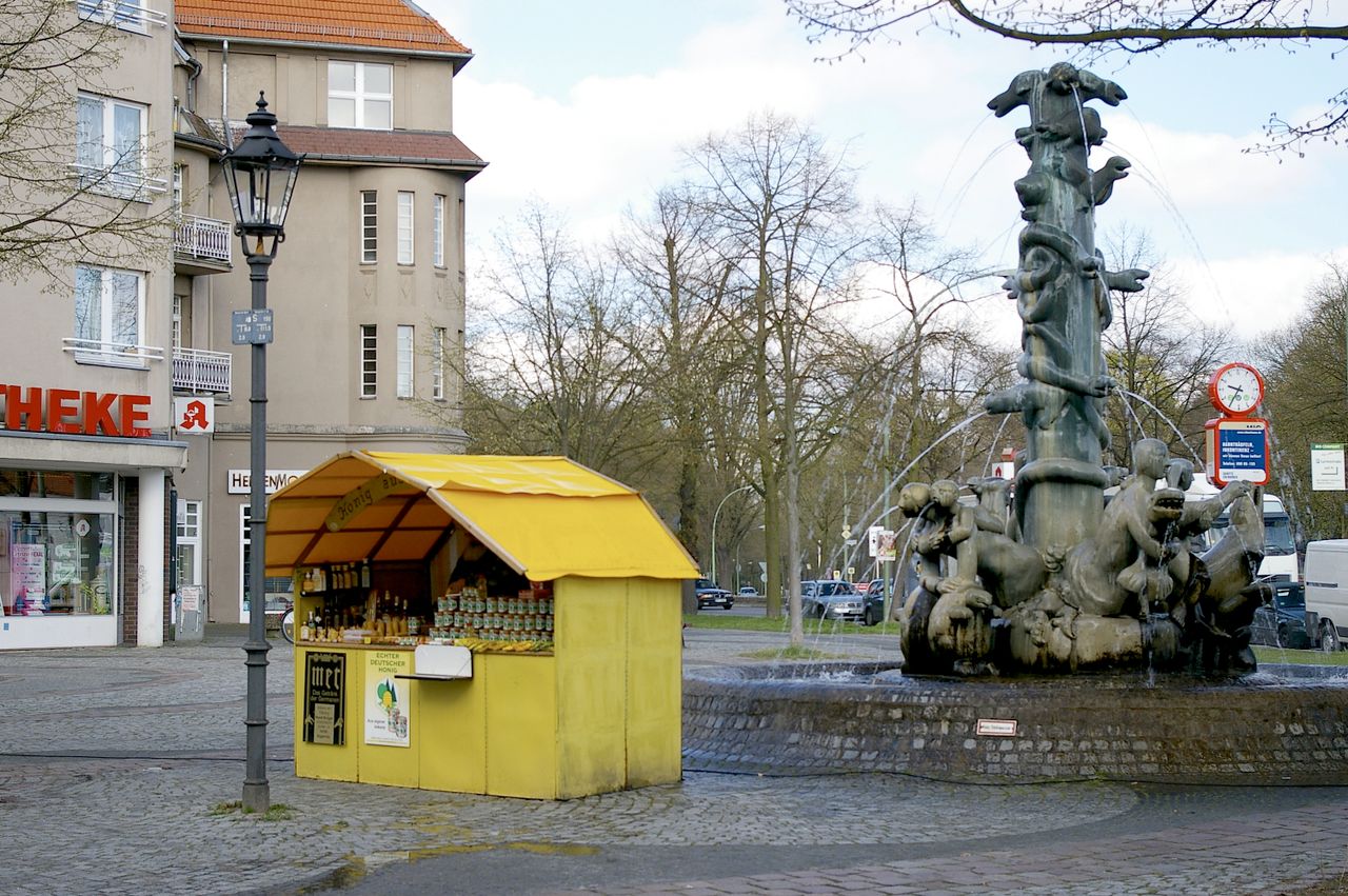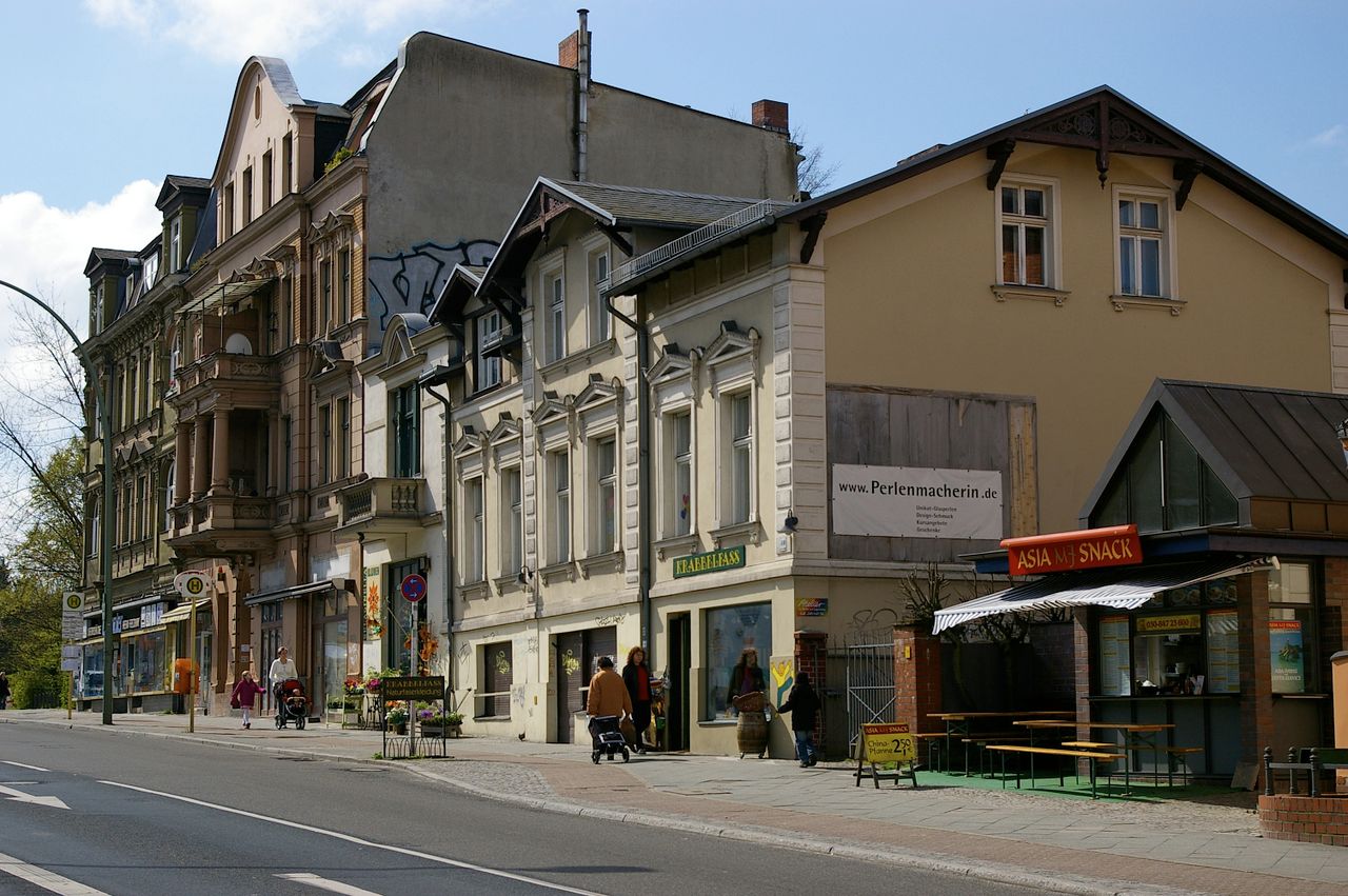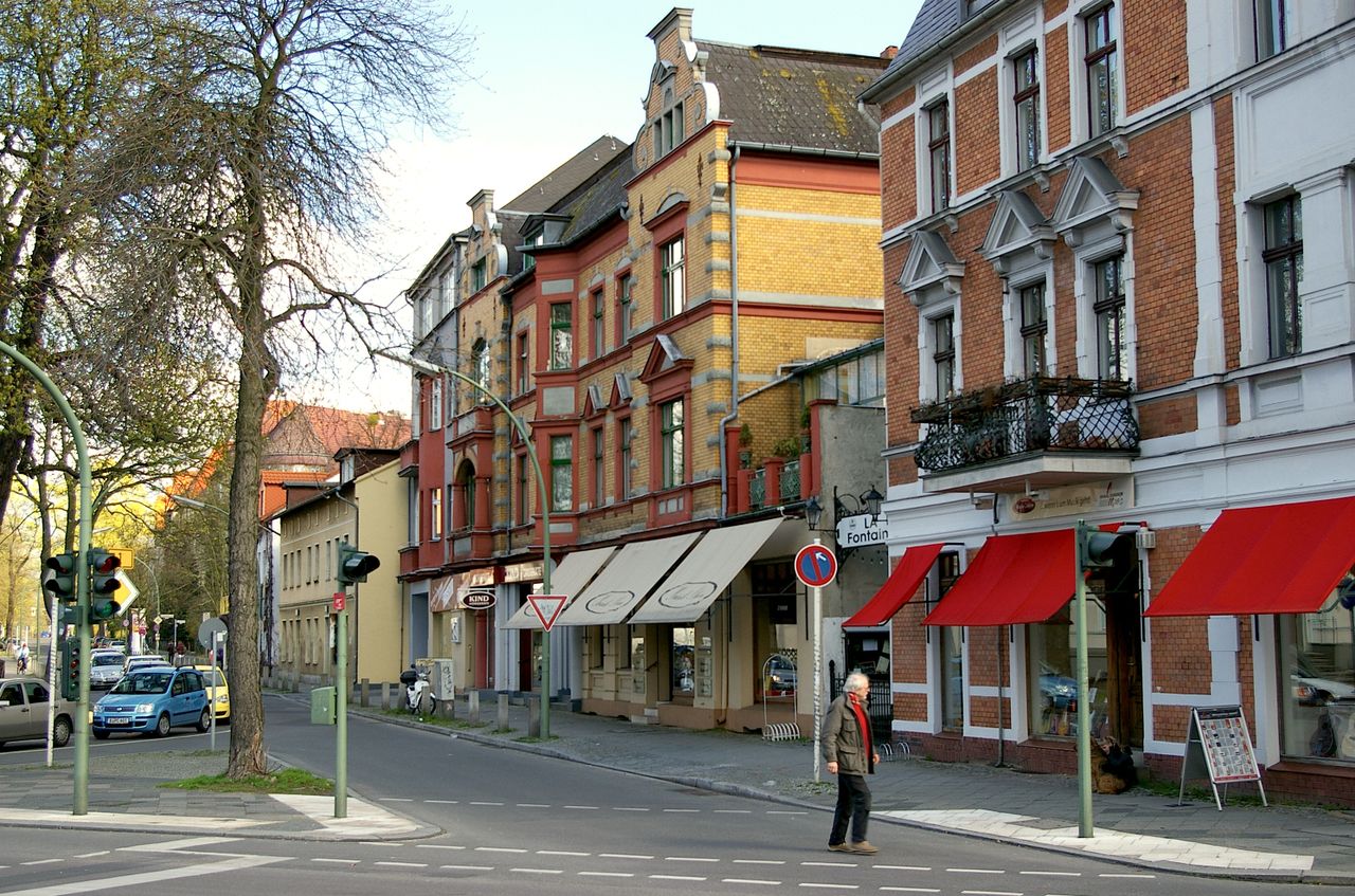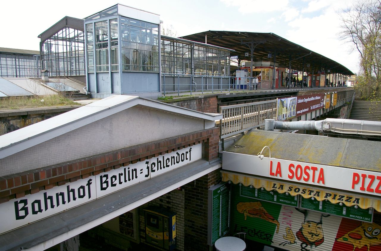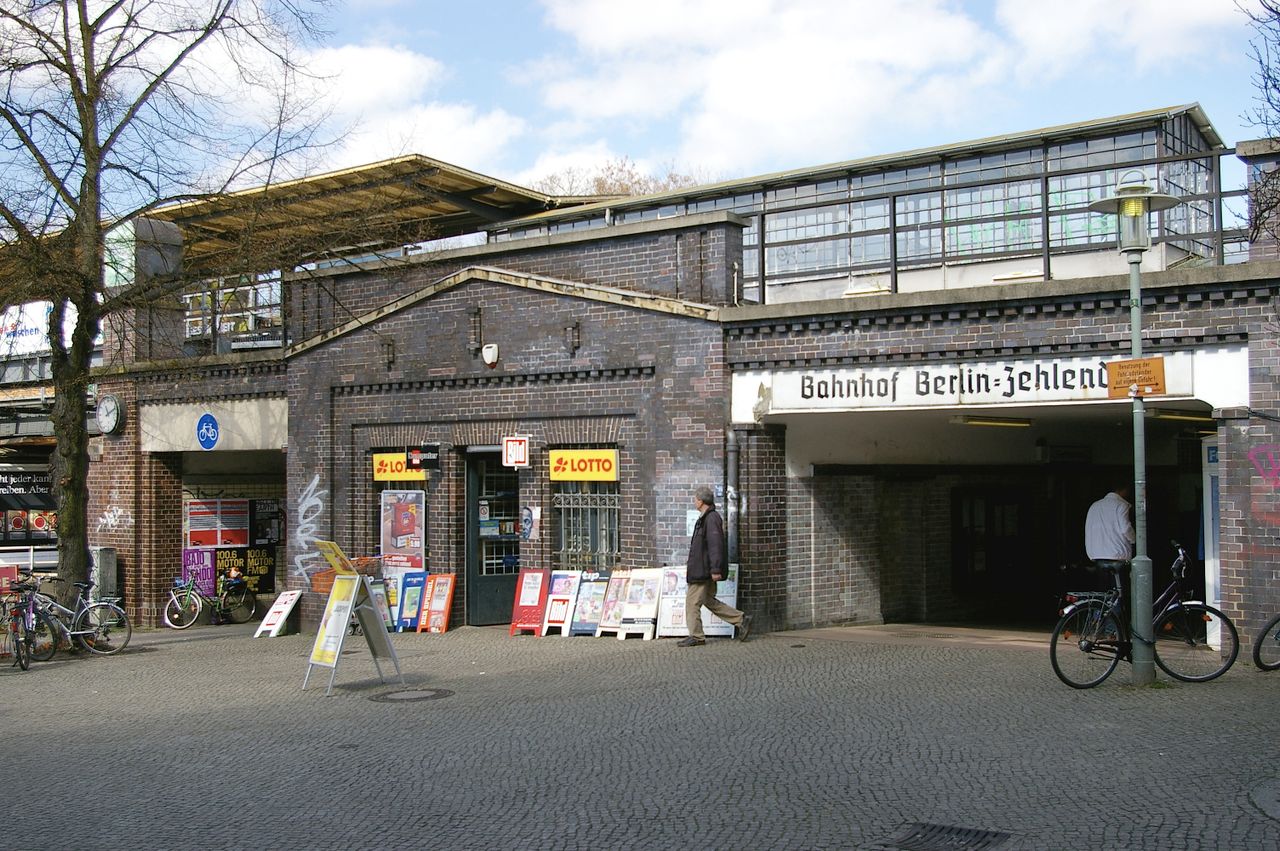 Große, sehr stark befahrene Ampelkreuzung von Potsdamer Strasse und Clayallee, S-Bahnhof, Marktständer, Gebäude aus fast allen Stilepochen