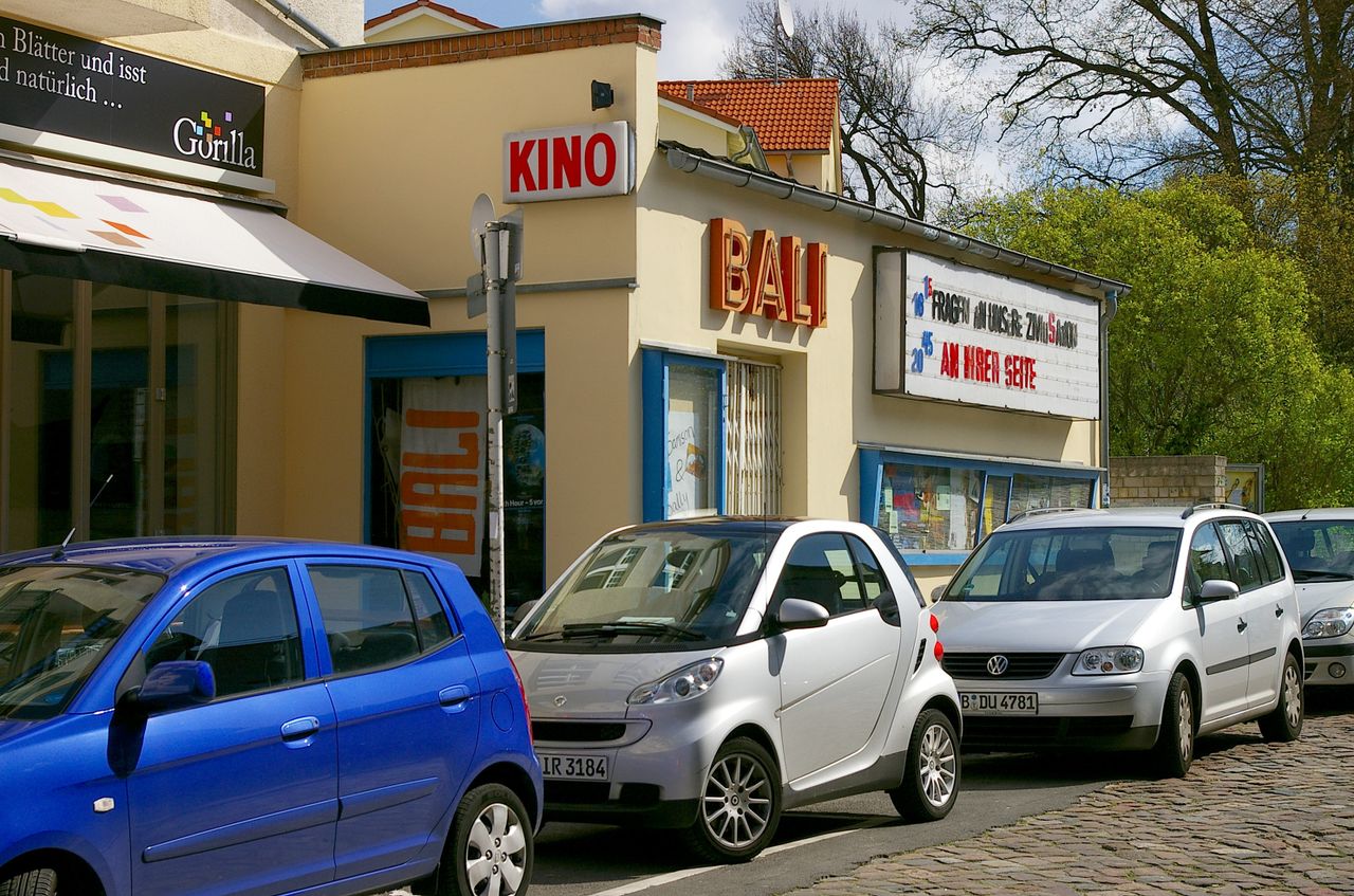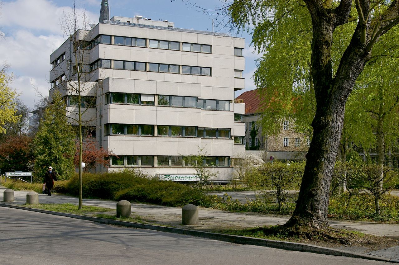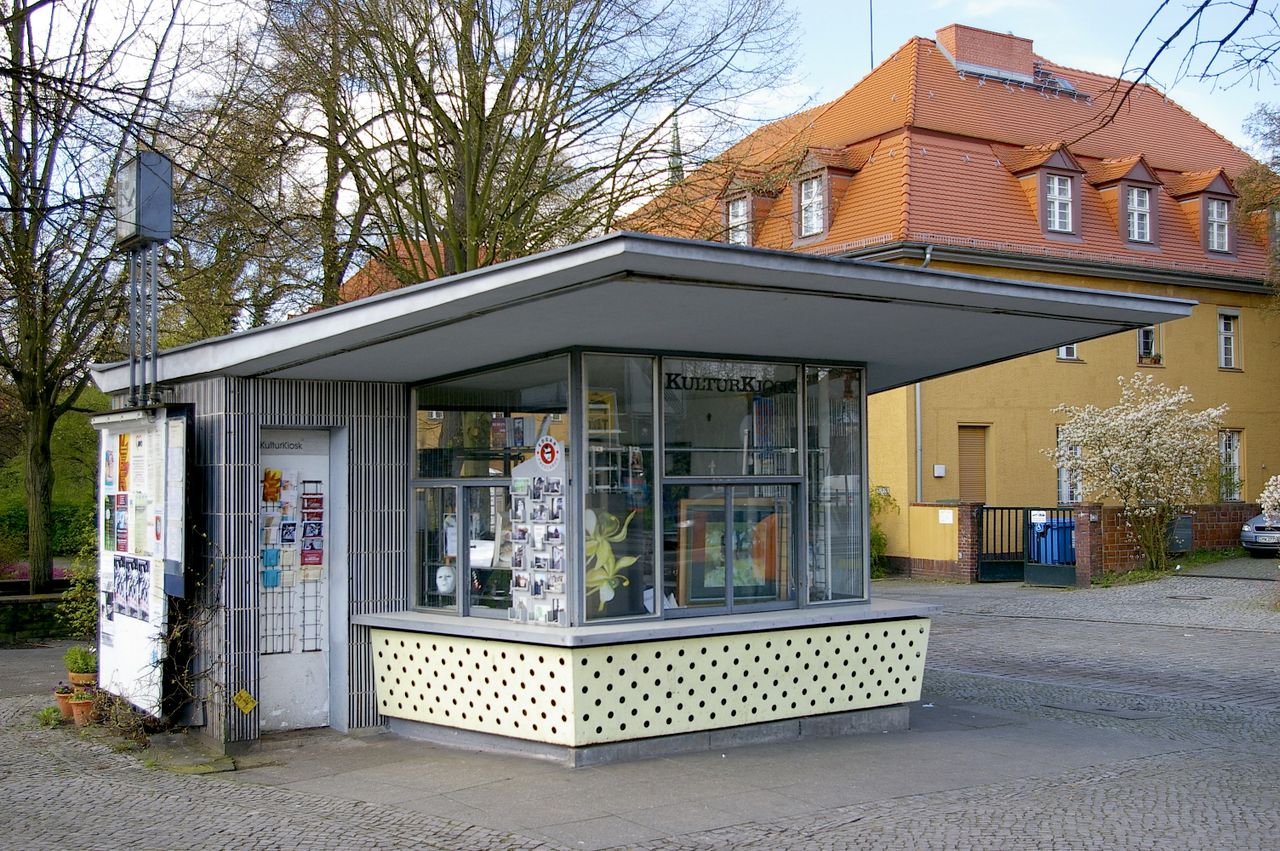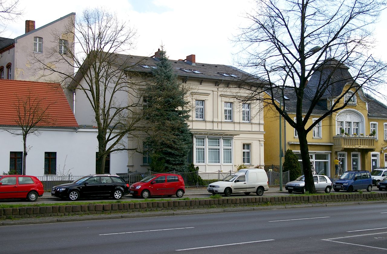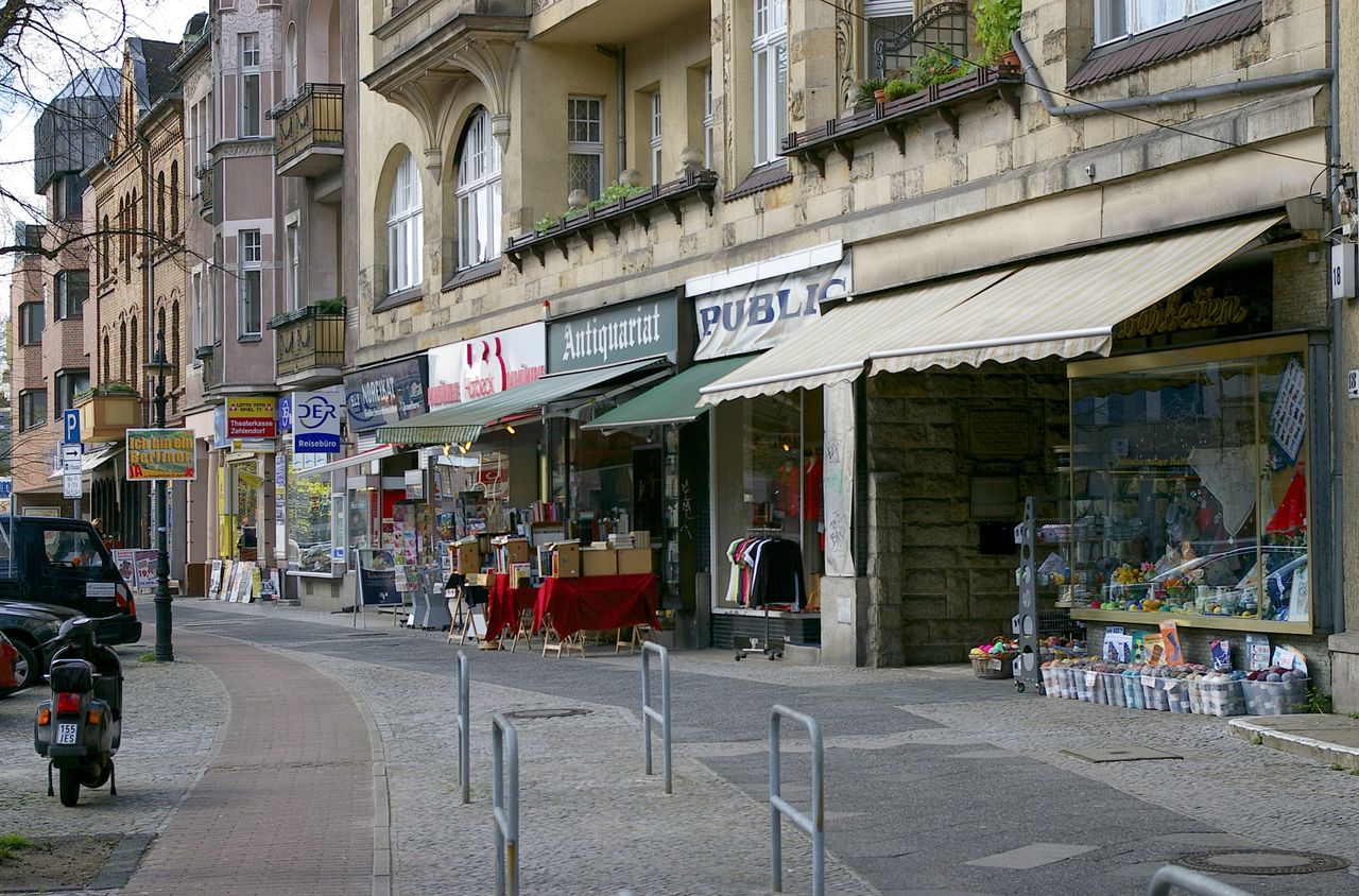 Große, sehr stark befahrene Ampelkreuzung von Potsdamer Strasse und Clayallee, S-Bahnhof, Marktständer, Gebäude aus fast allen Stilepochen
