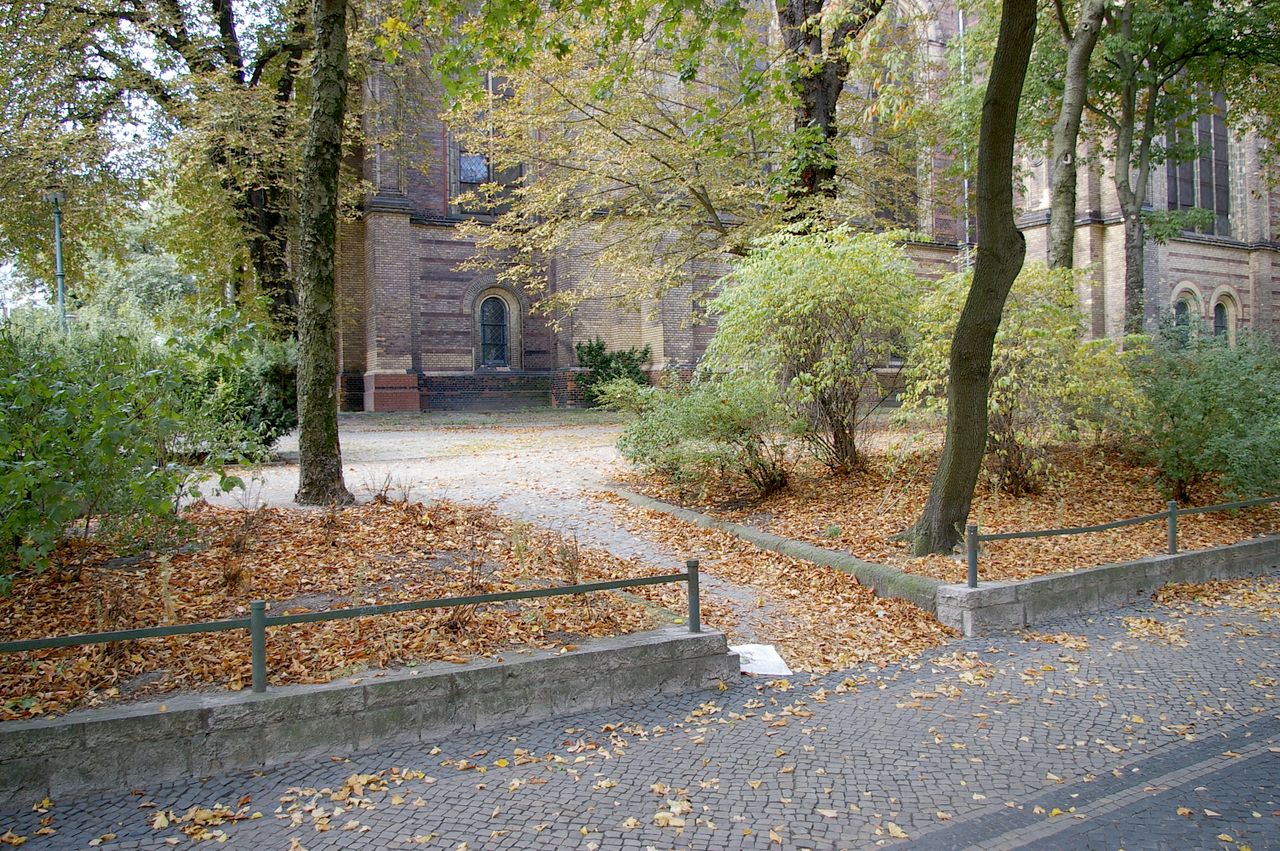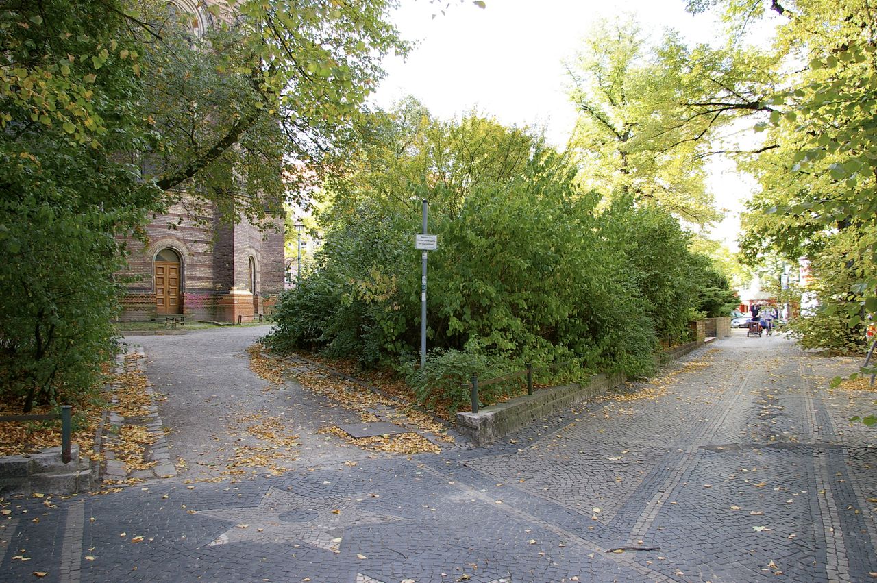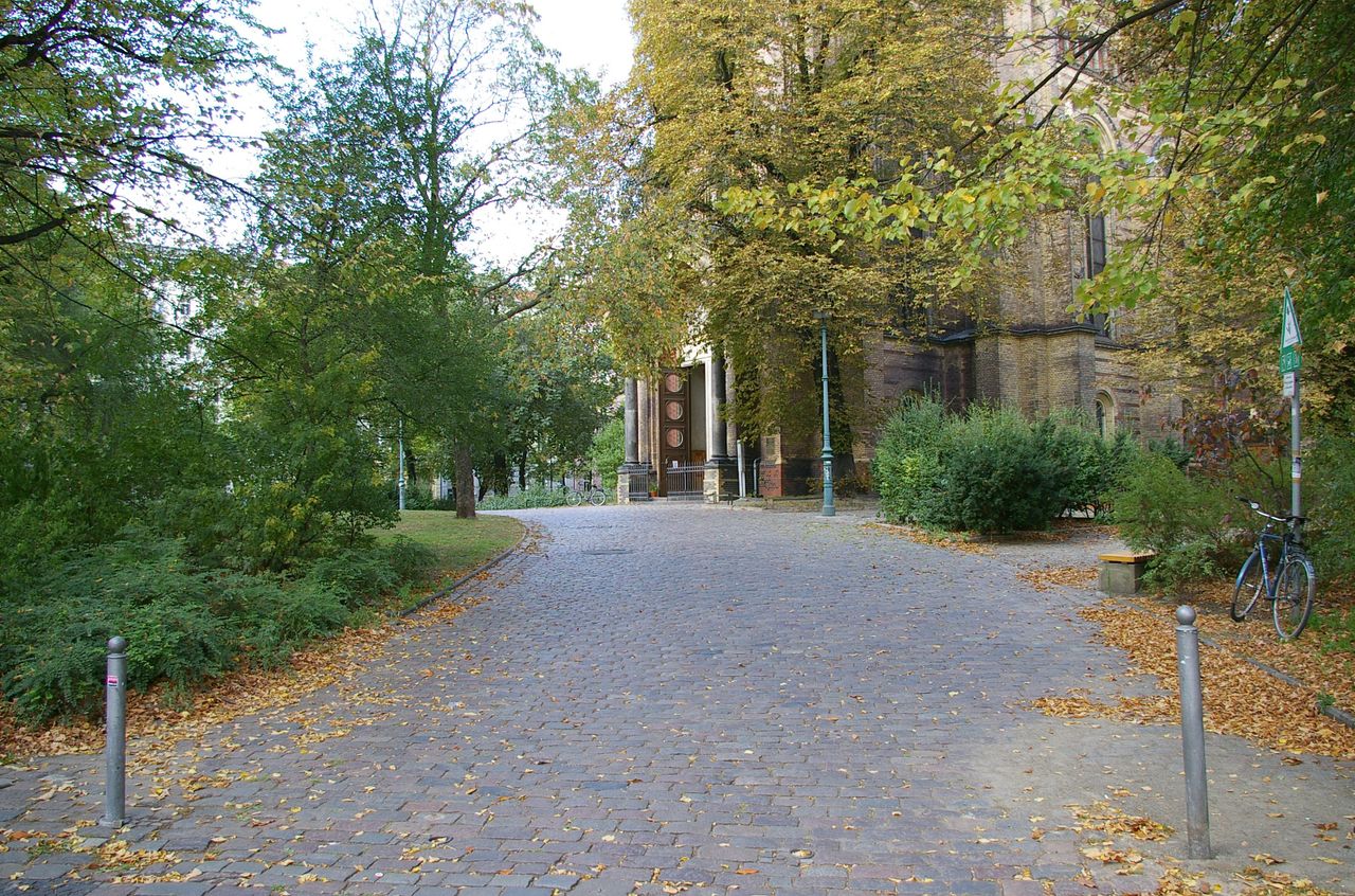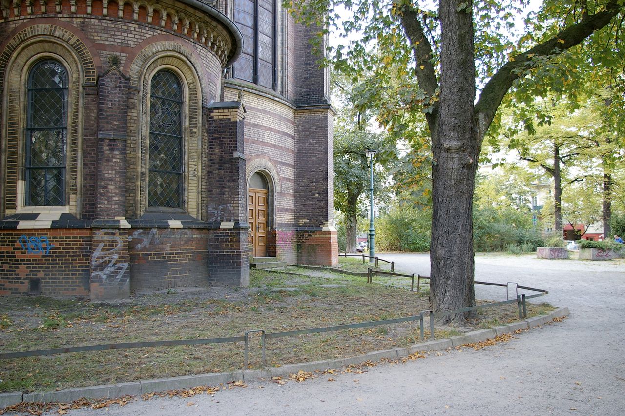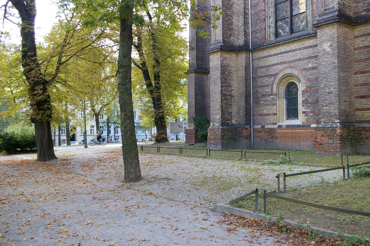 Kleiner begrünter, hügeliger Platz mit Kirche (Zionskirche).