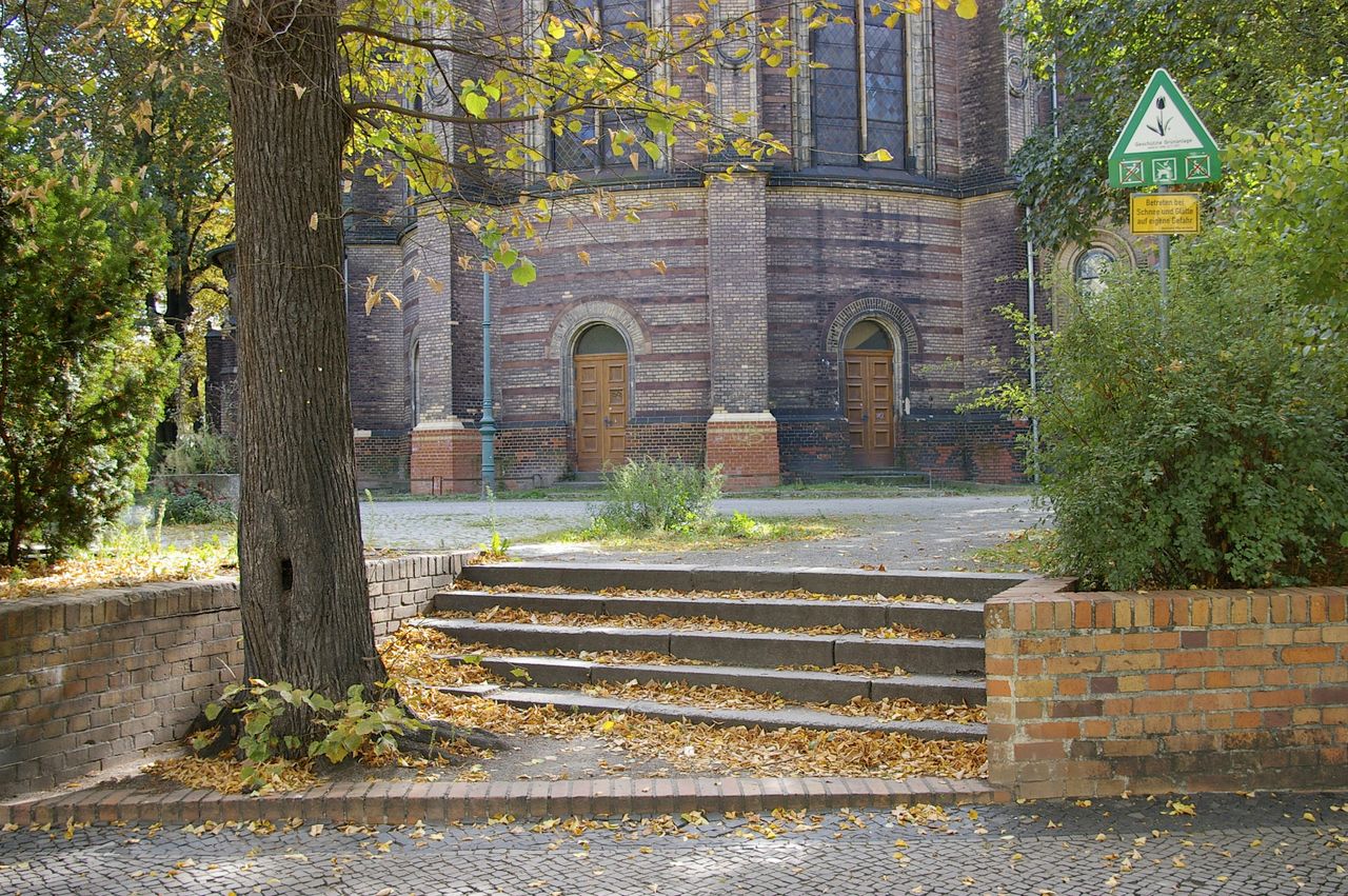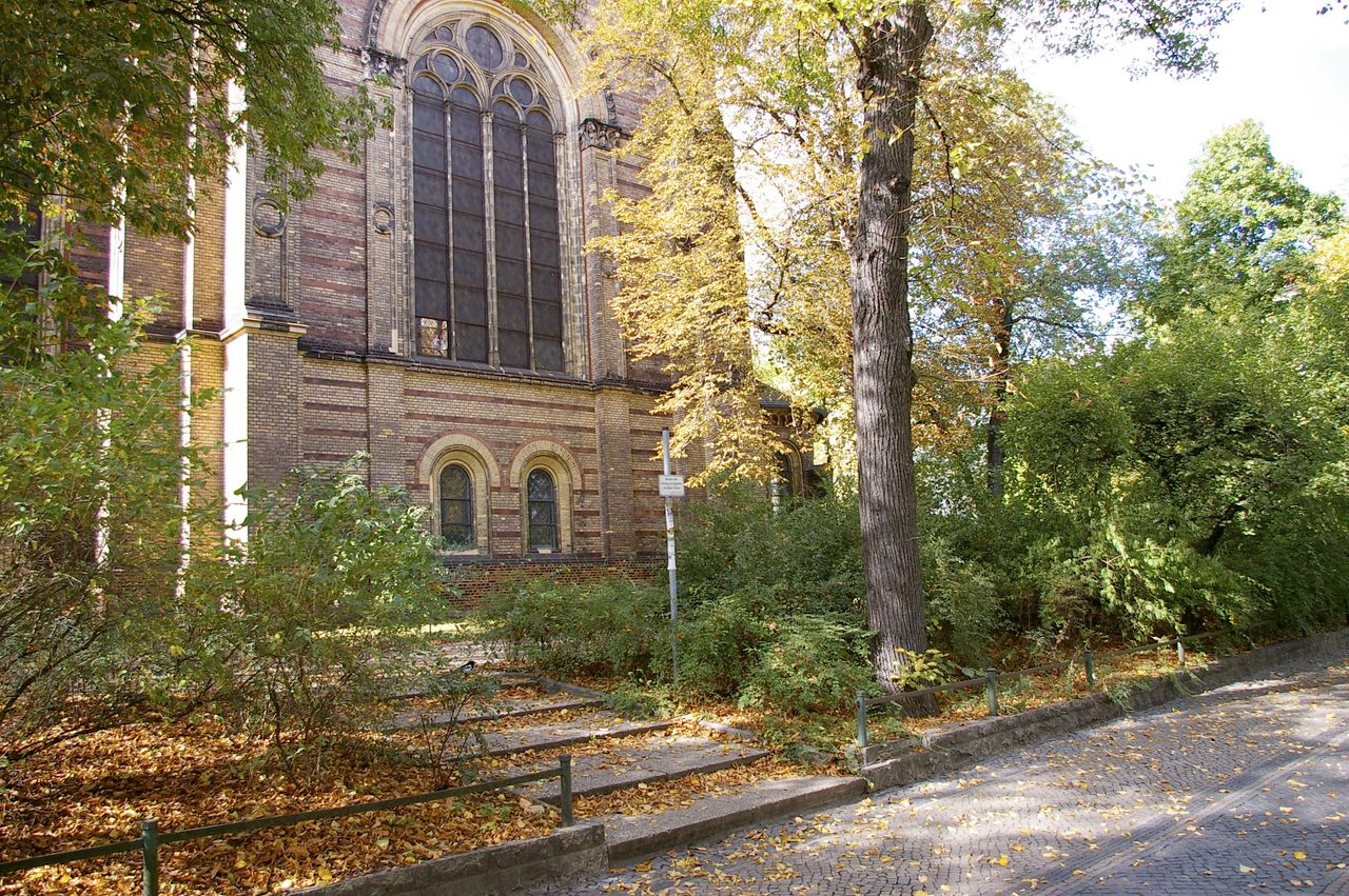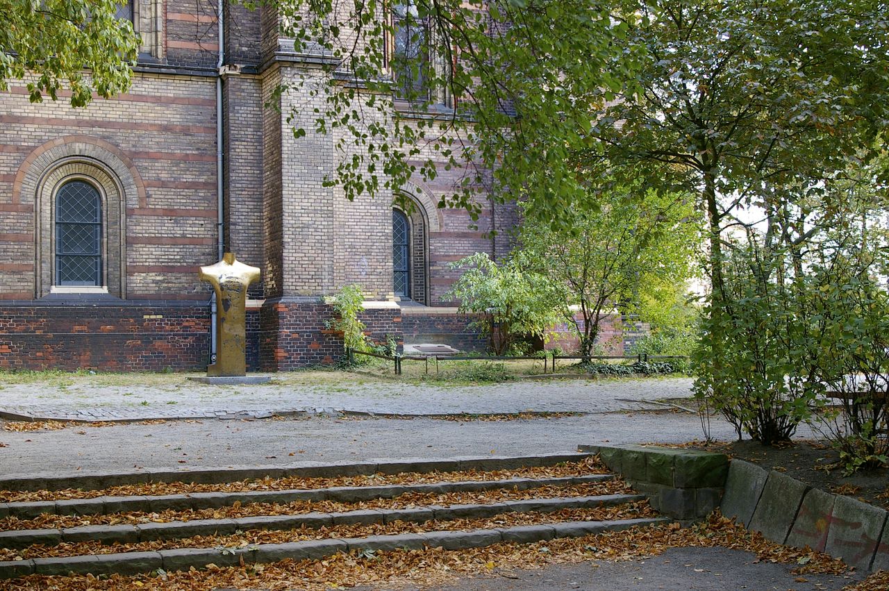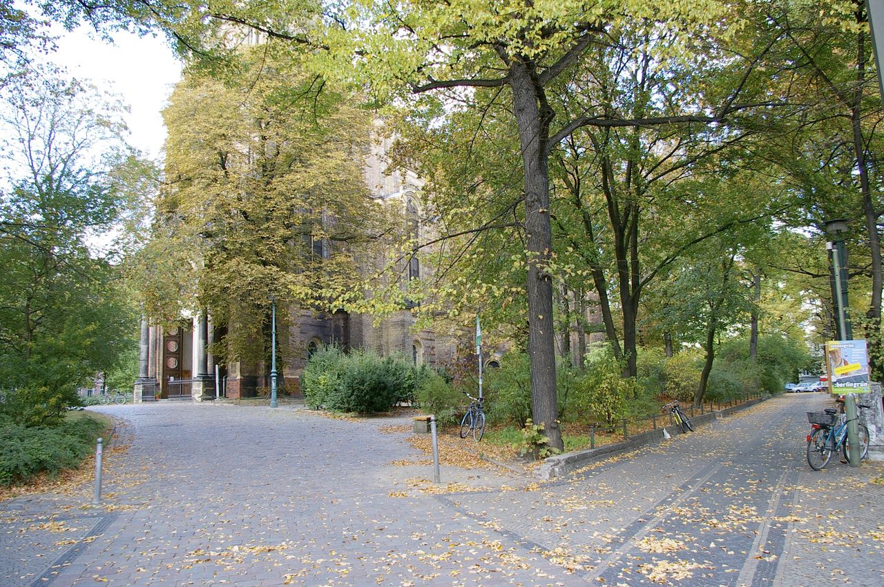 Kleiner begrünter, hügeliger Platz mit Kirche (Zionskirche).