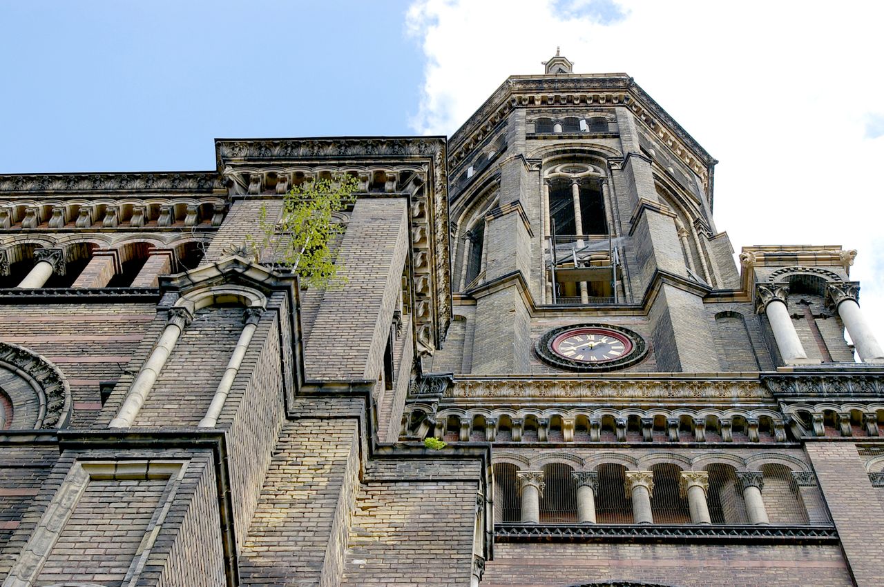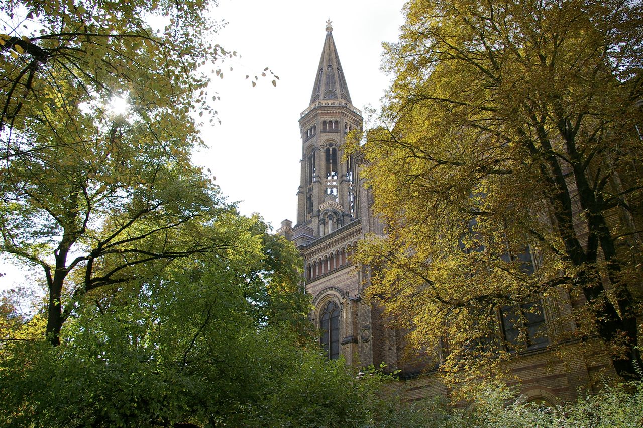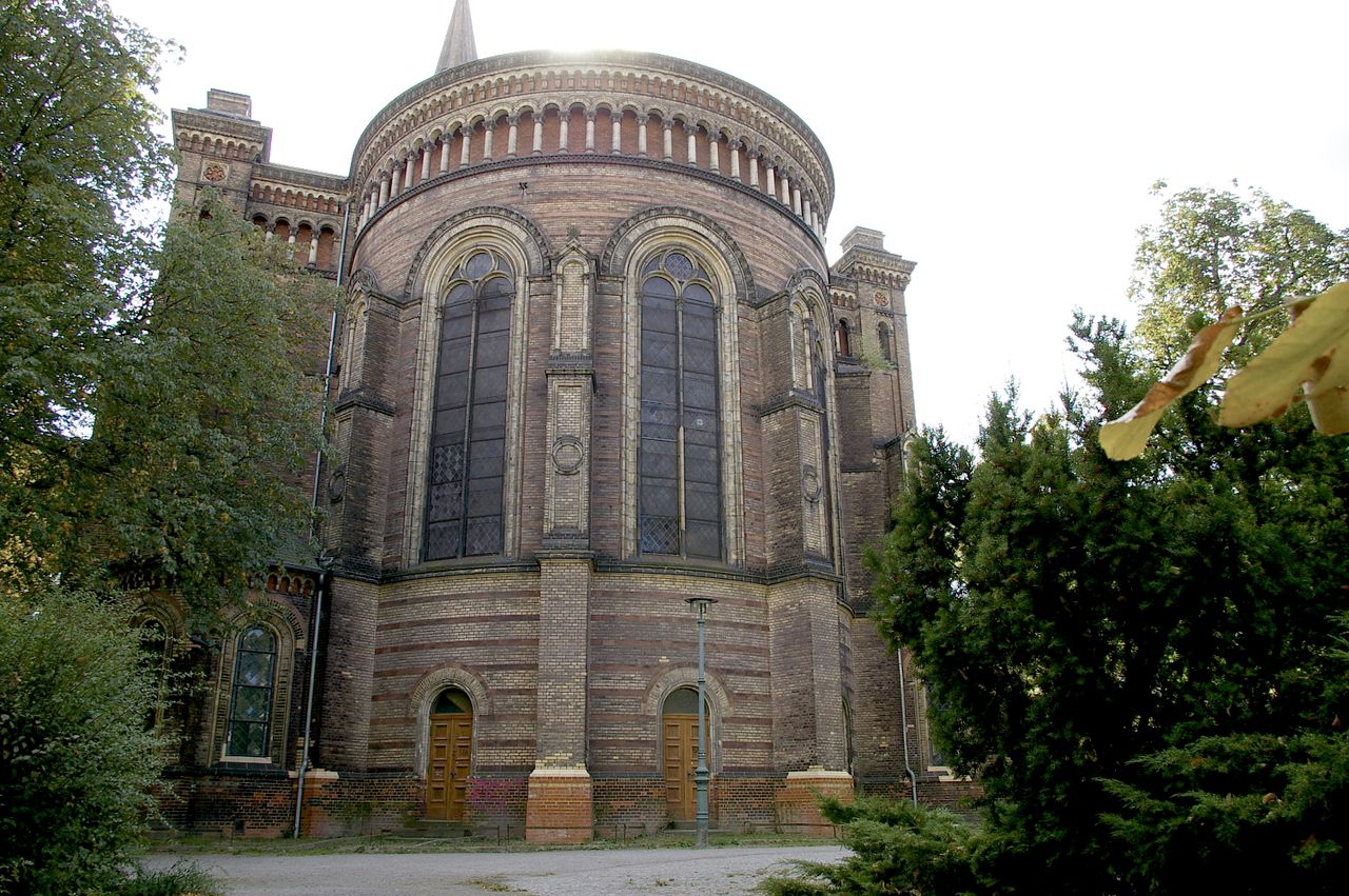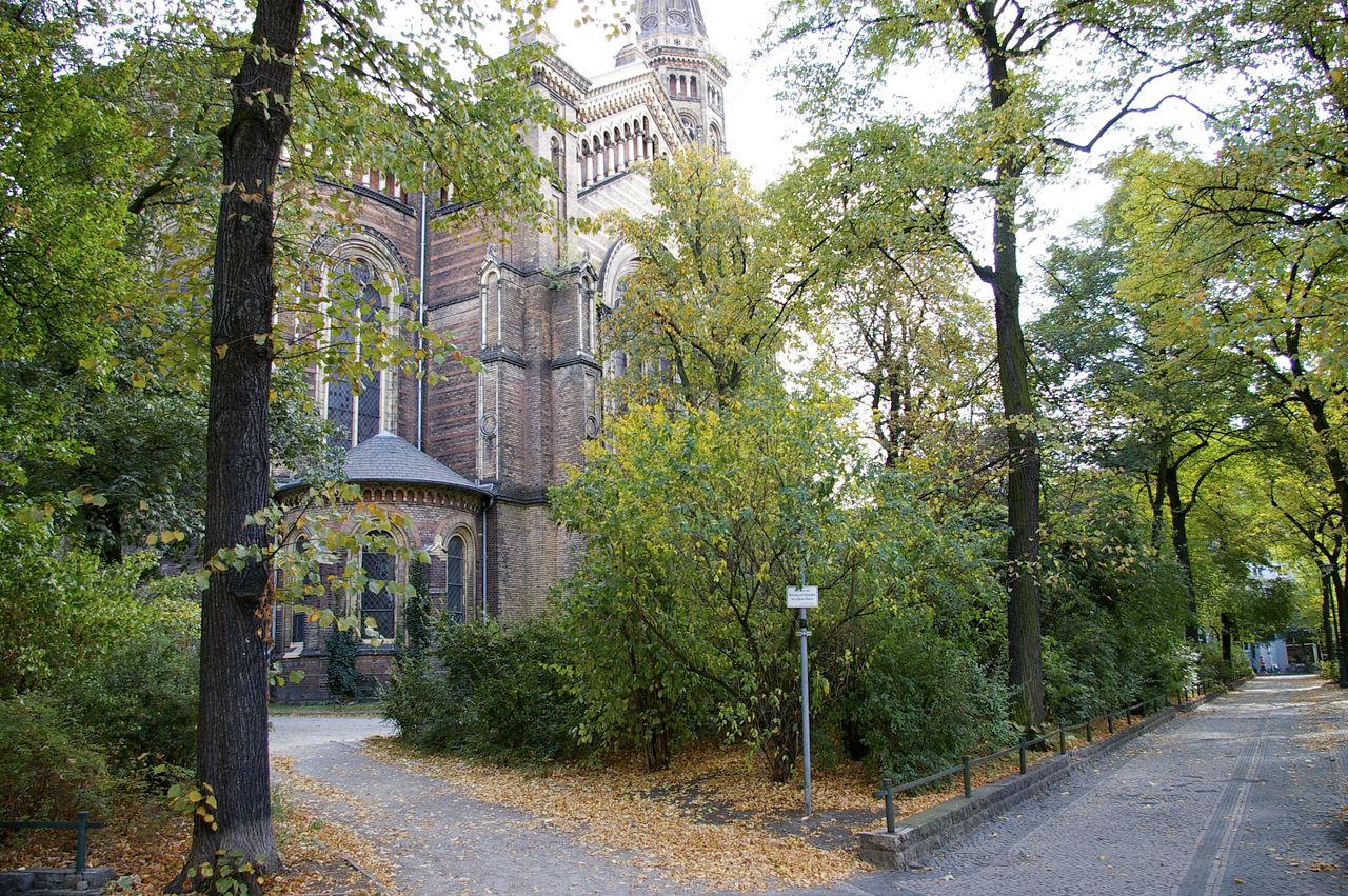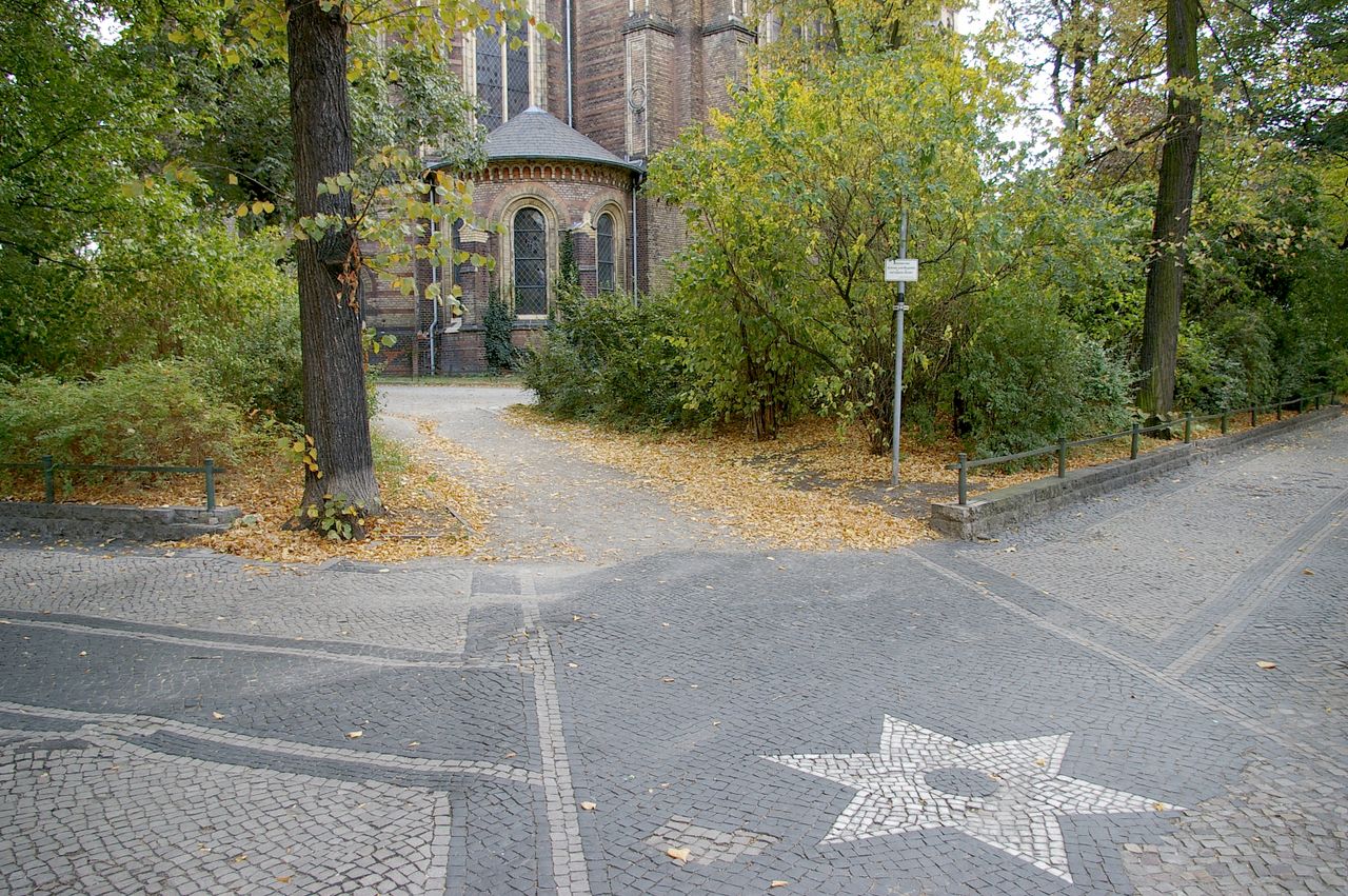 Kleiner begrünter, hügeliger Platz mit Kirche (Zionskirche).