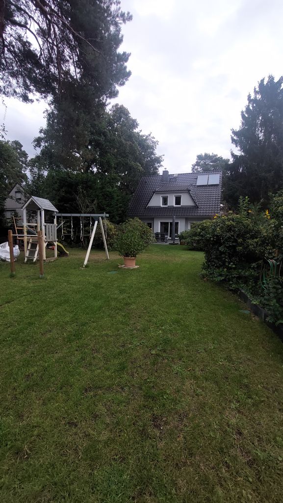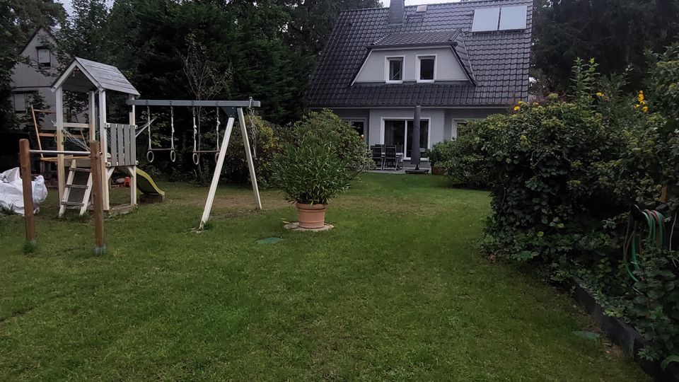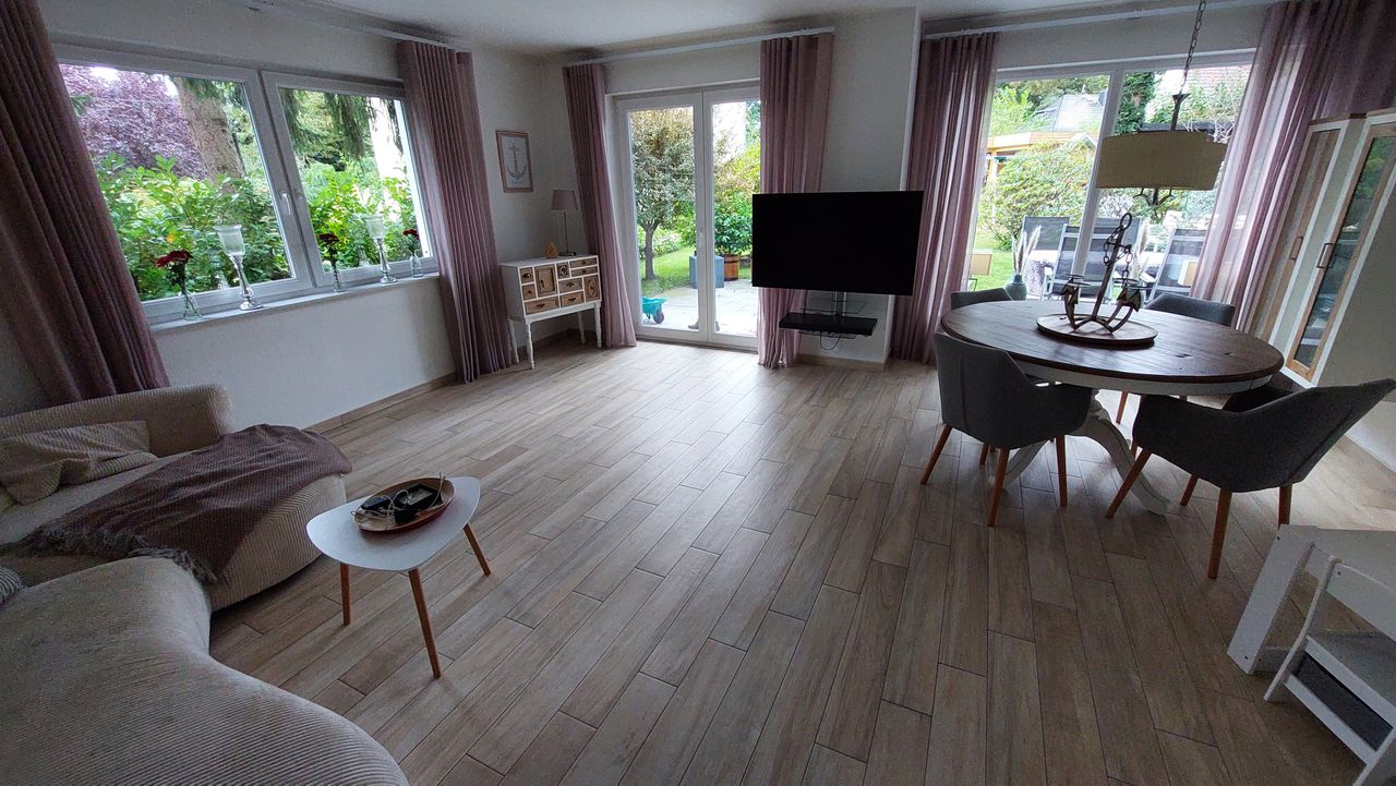 Der offene Wohn- und Essbereich besticht durch natürliche Materialien, helle Fensterflächen und eine harmonische Farbwelt – ideal für stimmungsvolle Aufnahmen. Vom Wohnzimmer aus eröffnet sich der Blick in den grünen Garten mit hauseigenem Spielplatz – perfekt für Szenen, die Lebendigkeit und Wohlfühlatmosphäre transportieren.