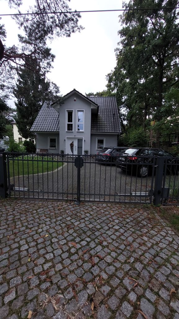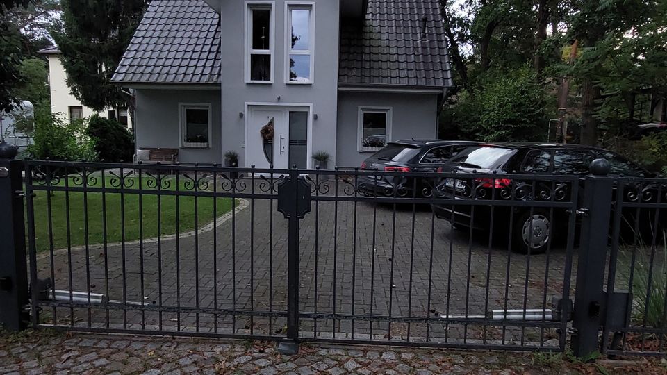 Auf dem Grundstück stehen, hinter einem elektronischen Tor, zwei private Parkplätze zur Verfügung. Die Anfahrt ist bequem und bietet genug Platz für Fahrzeuge von Crew oder Produktion.