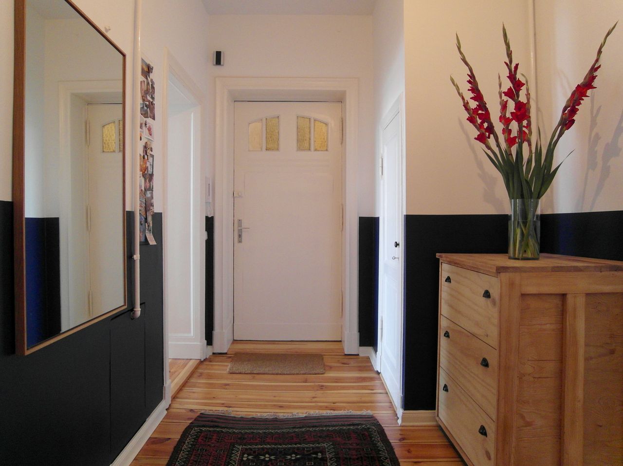 Jedes Zimmer hat farblich gestaltete Wände. Küche: mintgrün (eine Wand), Wohnzimmer: hellgrau (komplett), Arbeitszimmer: rosé (eine Wand), Schlafzimmer: taubenblau (komplett), Flur: dunkelblauer Sockel.