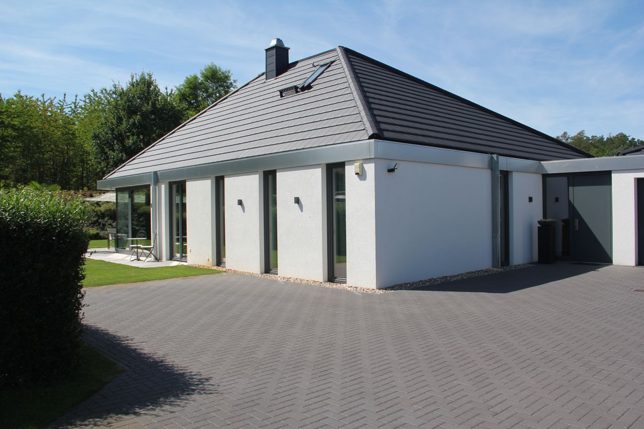 Architektenhaus, welches als Bungalow mit einer Raumhöhe von bis zu 6,60m ausgebaut ist. Die großzügige und offene Architektur innen + außen bietet ausreichend Platz für Crew, Bild- und Tontechnik. Das Ambiente ist geprägt von einer modernen, minimalistischen Inneneinrichtung sowie einem weiträumigen, gepflegten Garten. Großzügige Auffahrt mit ausreichend PKW- und LKW-Stellplätzen.