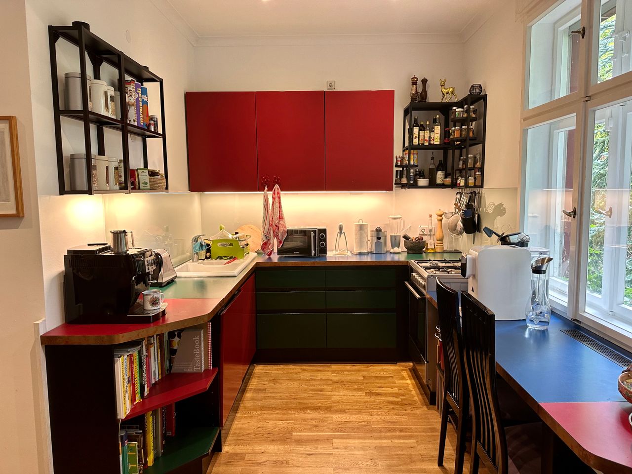 • Küche: Ein Highlight des Hauses ist die Küche, in der kontrastreiche Farben wie Rot, Grün und Blau dominieren. Diese ungewöhnliche Farbgebung macht die Küche zu einem besonderen Motiv für Aufnahmen.