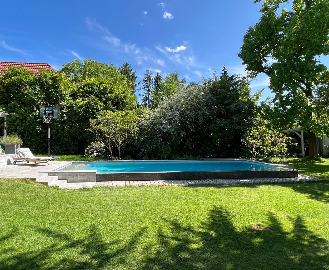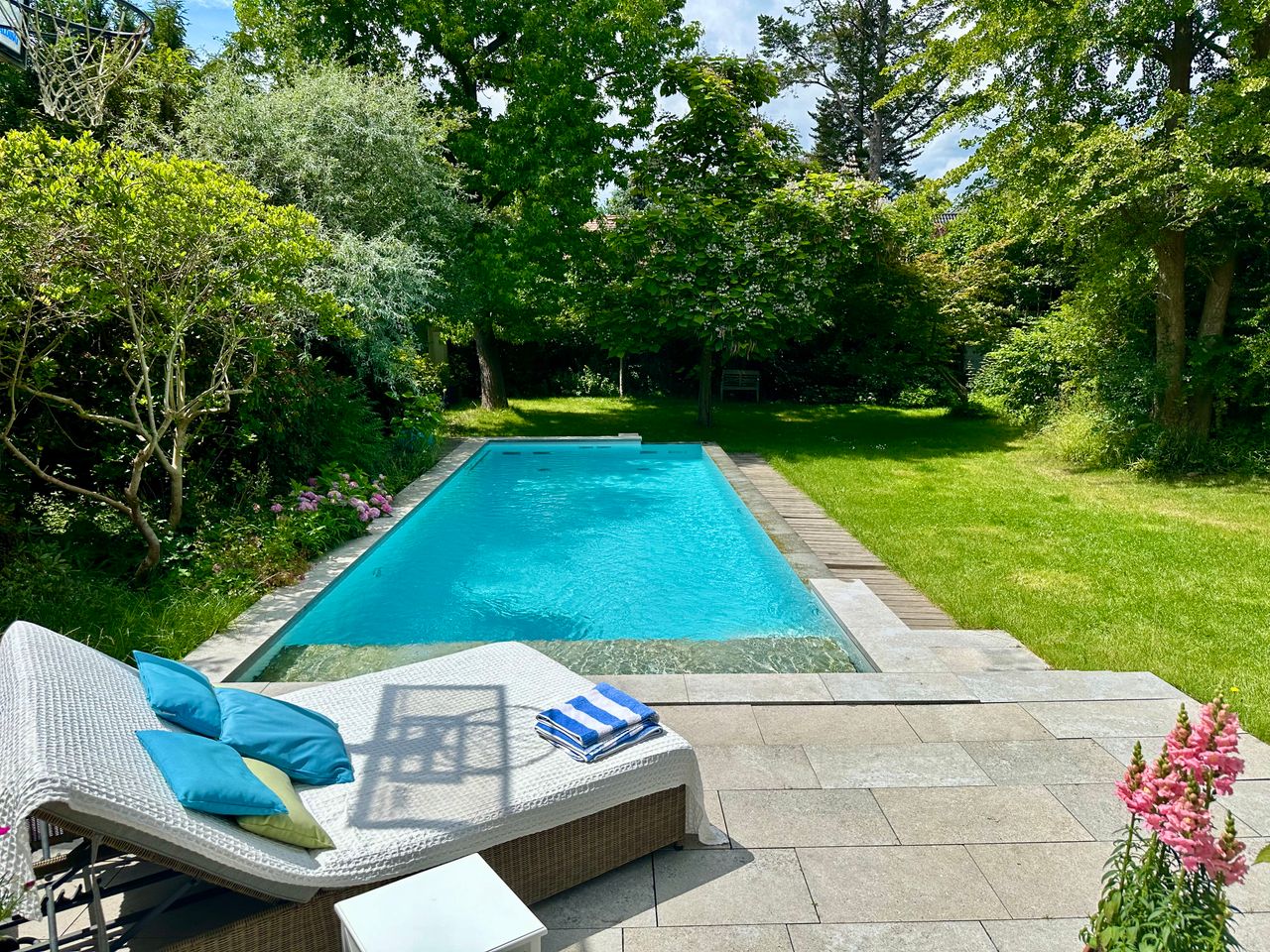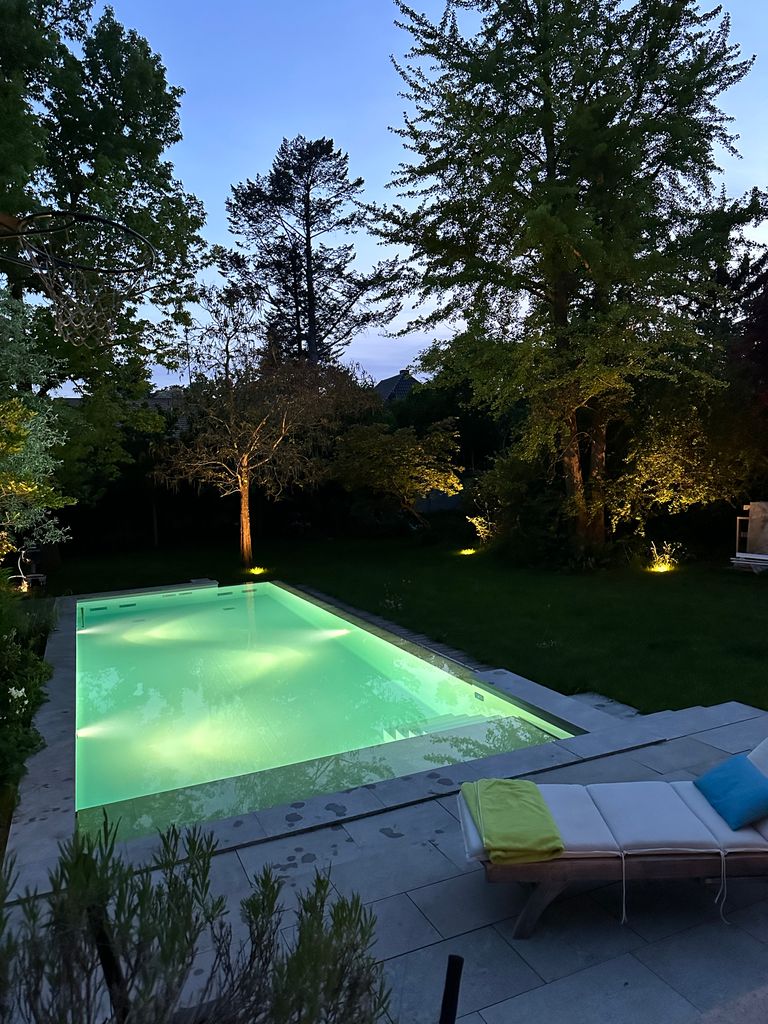 • Moderner Pool: Der Pool fügt sich harmonisch in die grüne Umgebung ein und bietet eine stilvolle Atmosphäre für Außenaufnahmen.