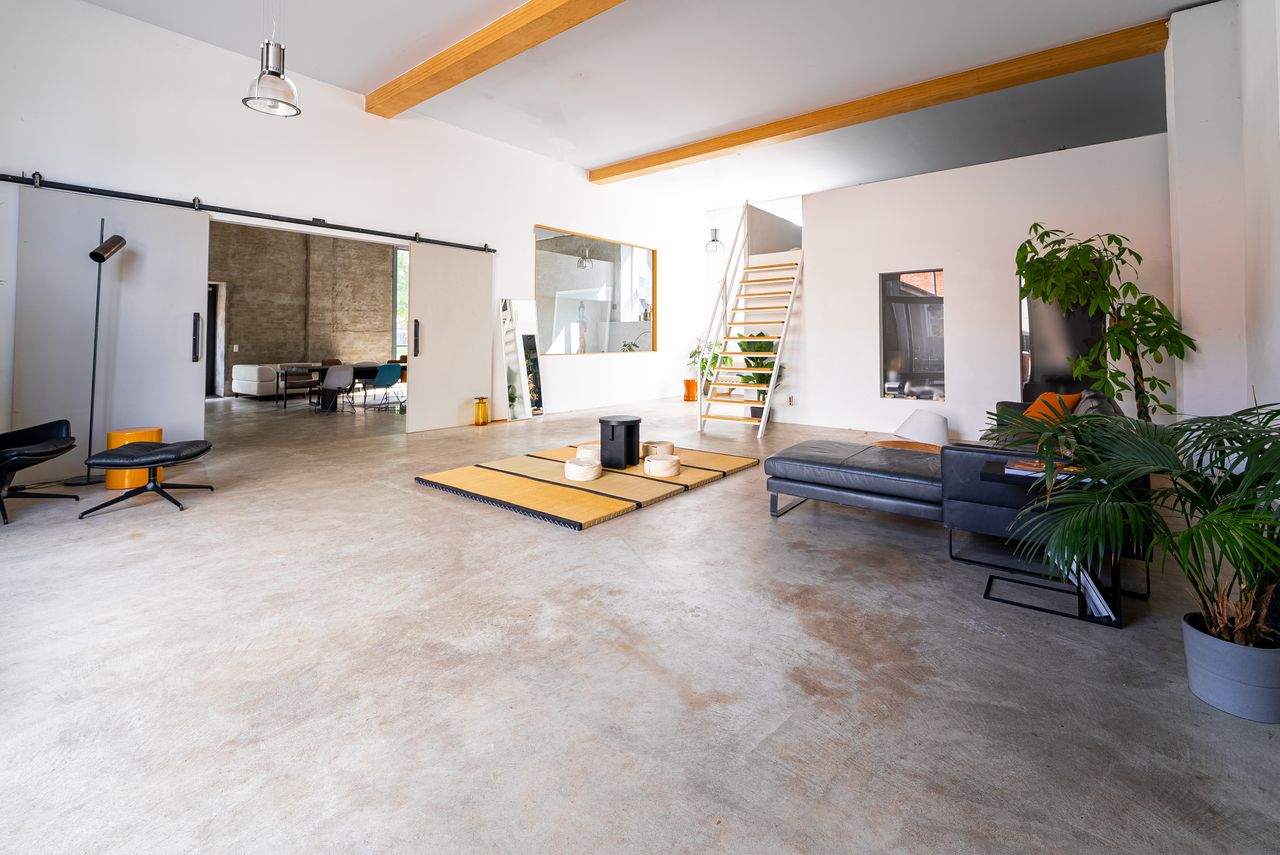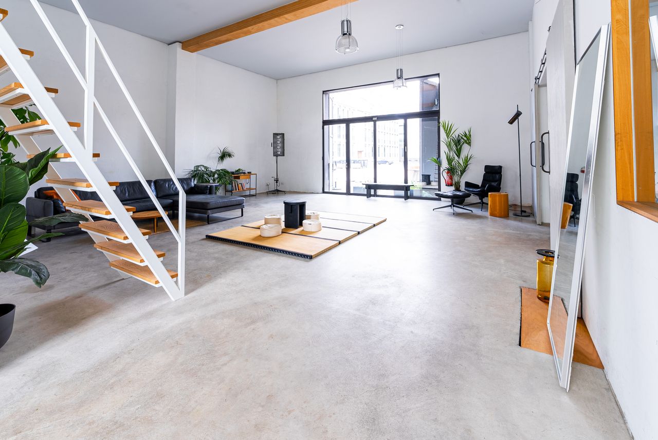 2 große Räume a 100 qm, hohe Decken, viel Flair. Viele Möbel im Fundus. Sehr flexibel. Große Schiebetür nach draußen, direkt zu beladen.