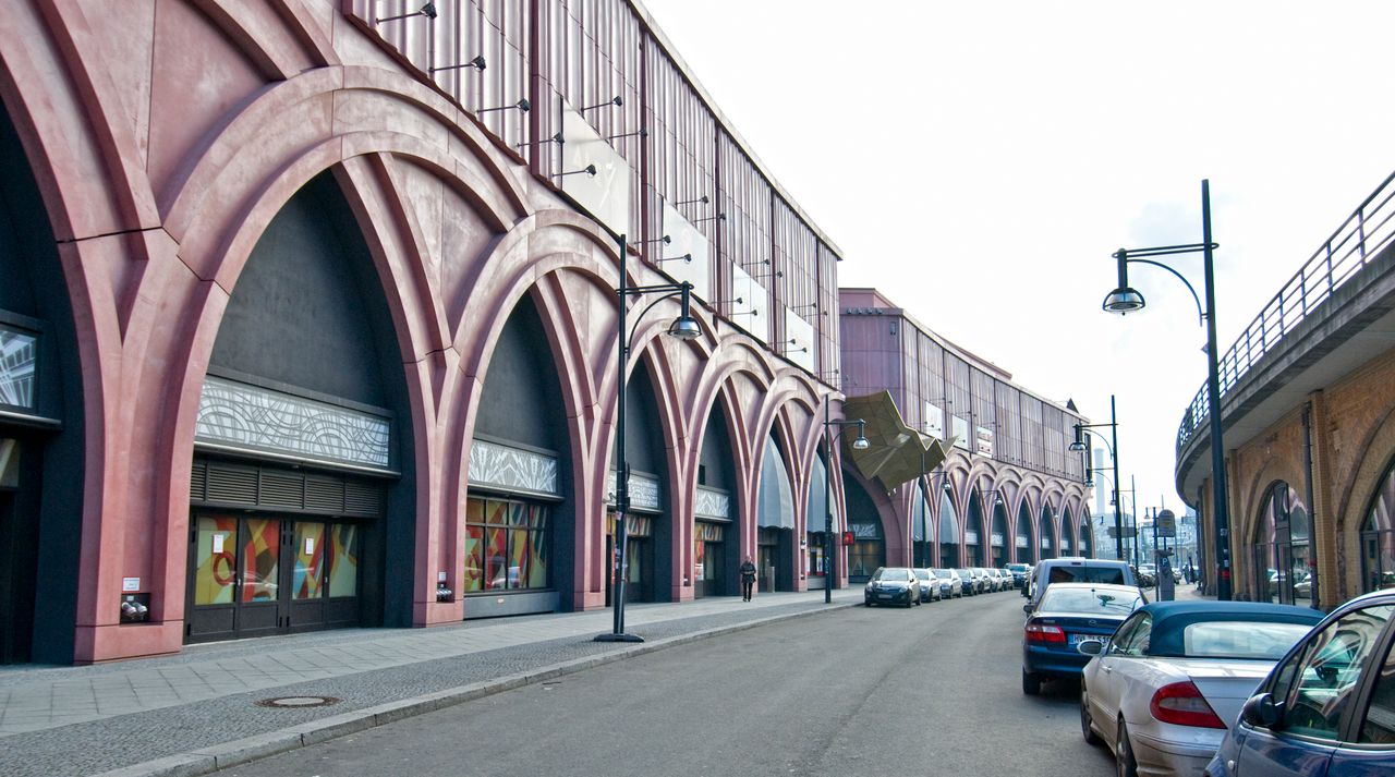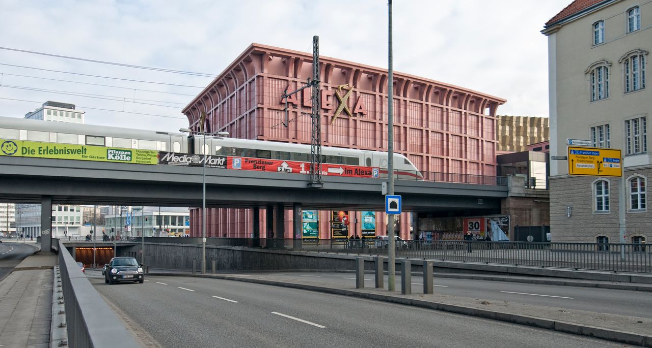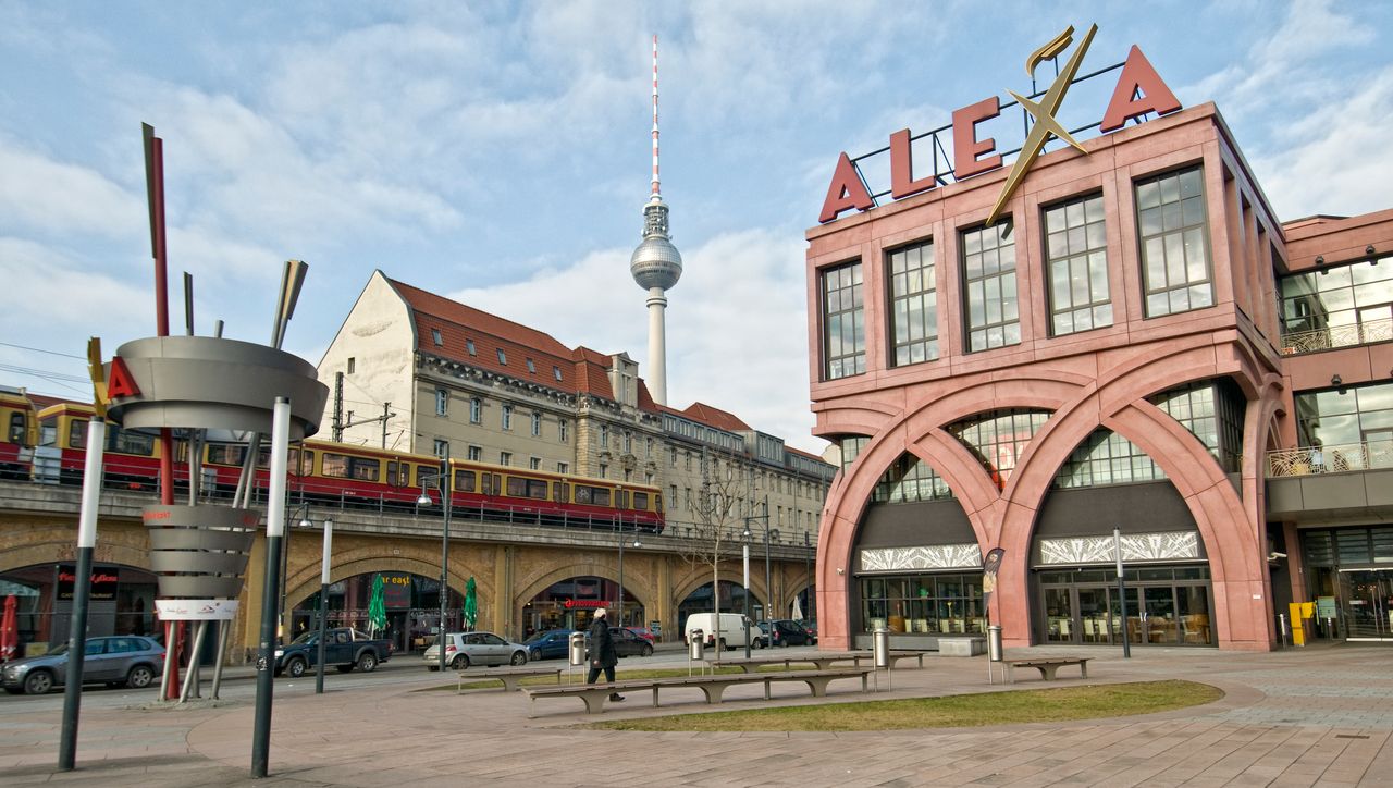 Großes Shoppingcenter am Alexanderplatz, rote Fassade, teilweise große Fensterfronten