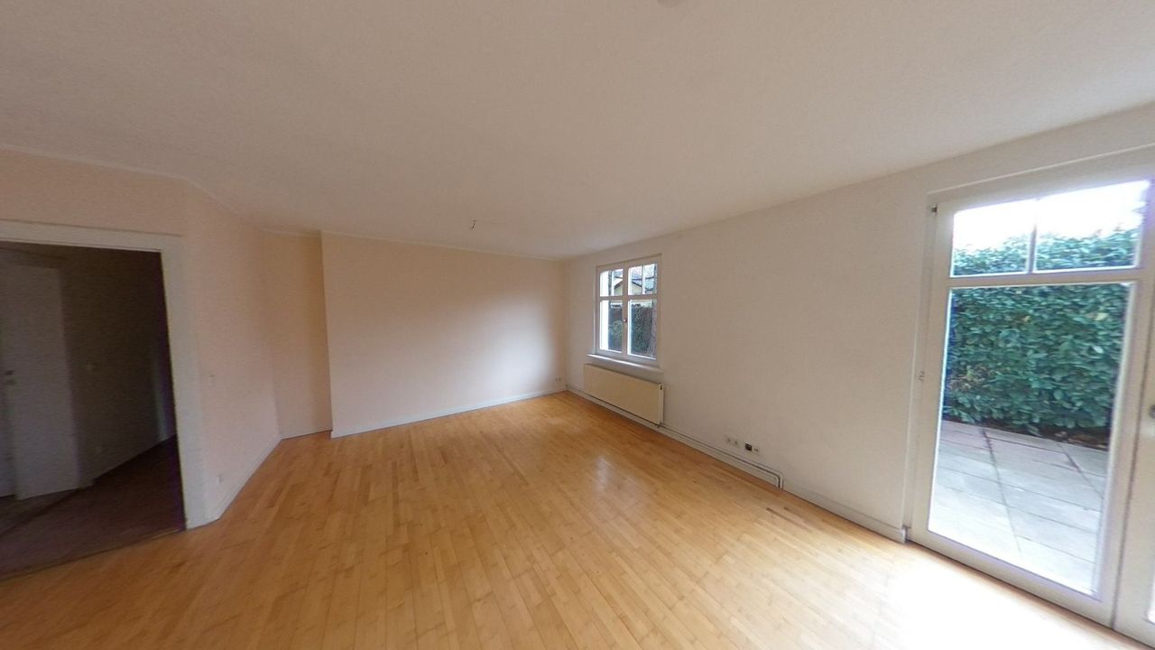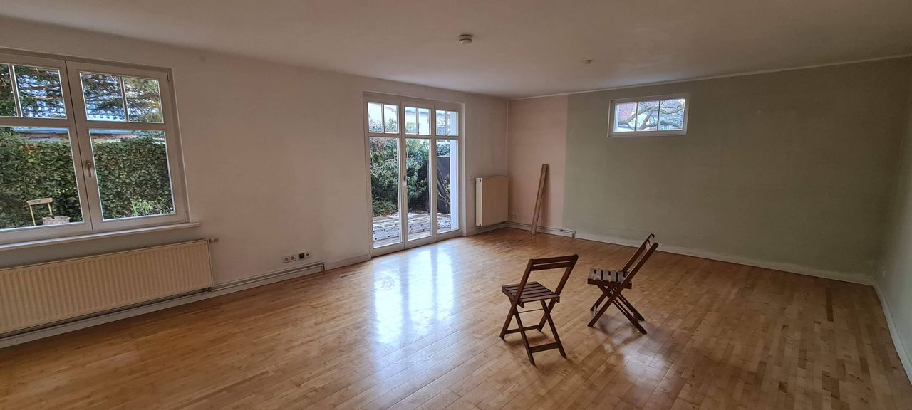 40 qm großes Wohnzimmer, insgesamt 5,5 Zimmer auf 2 Etagen mit 2 Terrassen, 2 Bädern und Küche.