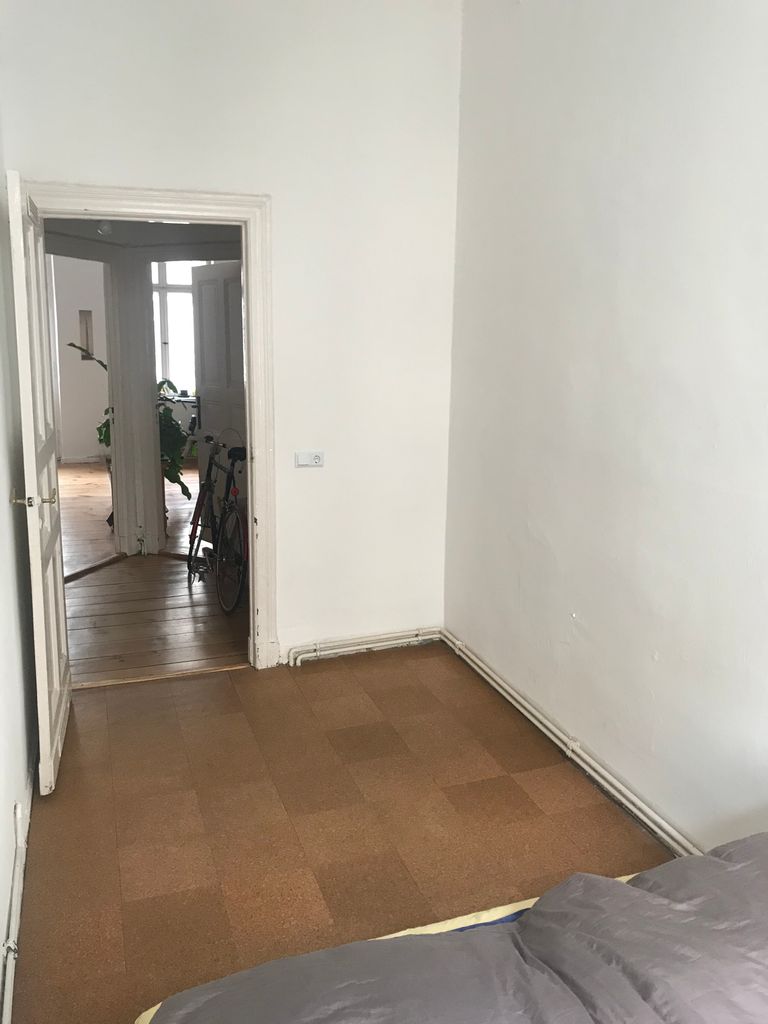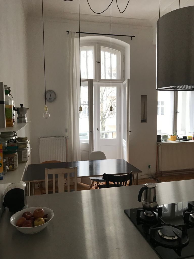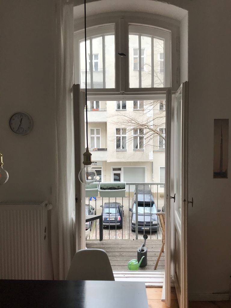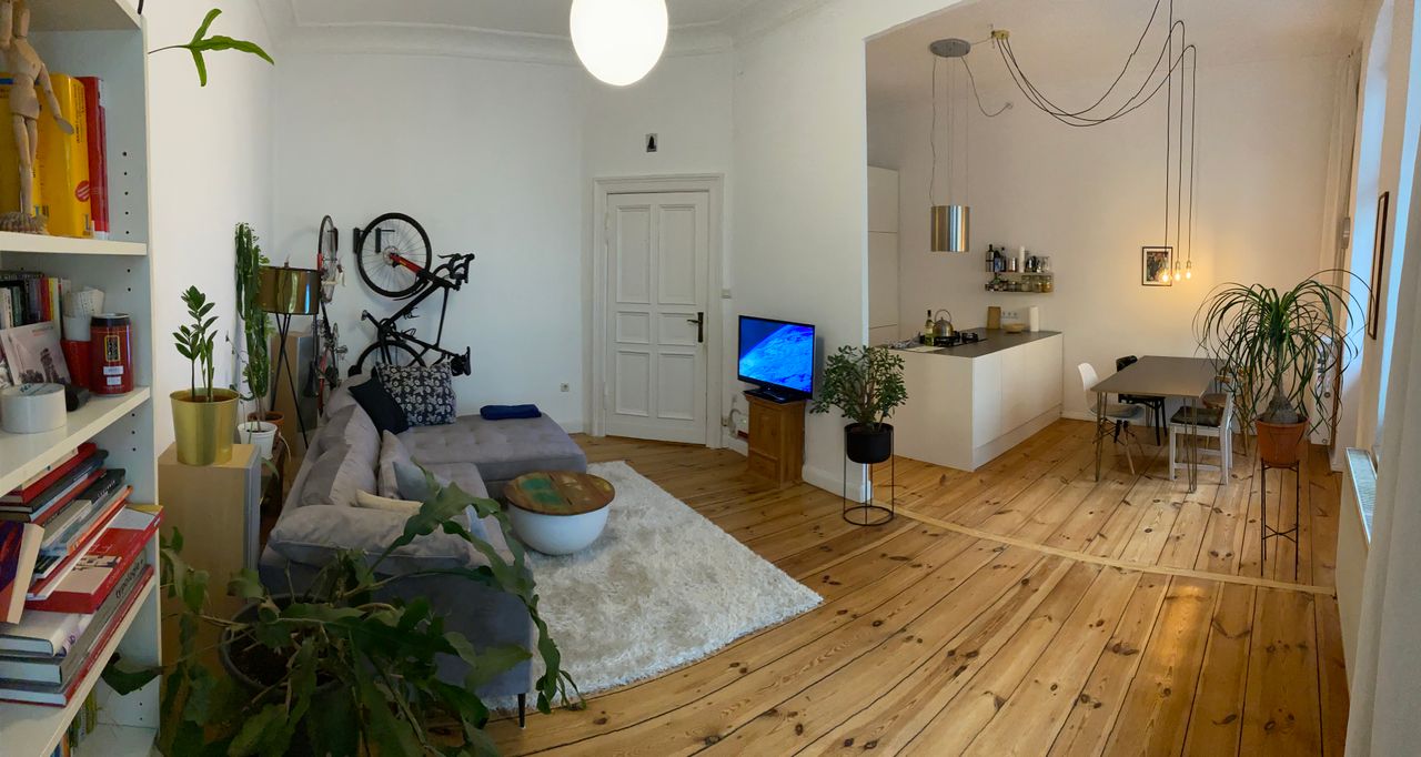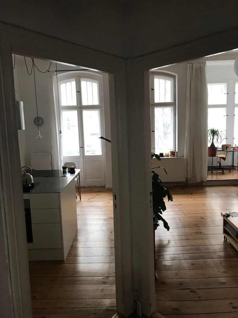 Die Wohnung befindet sich im 1. OG in einem typischen Berliner Altbau von 1908 mit abgezogenen Dielenboden, schönen Stuckdecken und moderner Küche. Die Wohnküche ist mit dem Wohnzimmer durch einen 3 m breiten Durchbruch verbunden und an das Wohnzimmer schließt sich ein kleiner Erker an. Alle Wände sind weiß gestrichen. Die Wohnung liegt in einer ruhigen Seitenstraße mit Kopfsteinpflaster im Bezirk Wedding und verfügt über einen 4,5 m² Balkon zur Straßenseite. Ich bin flexibel in der Vermietung und die Möbel können bei Bedarf umgeräumt bzw. ausgetauscht werden. Vor dem Haus und in den Seitenstraßen bestehen viele Parkmöglichkeiten.