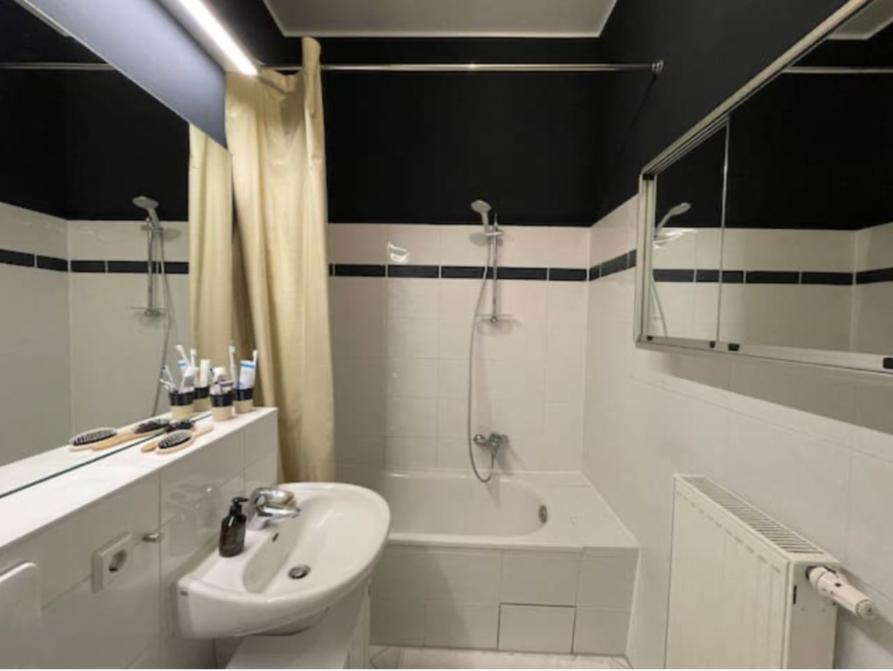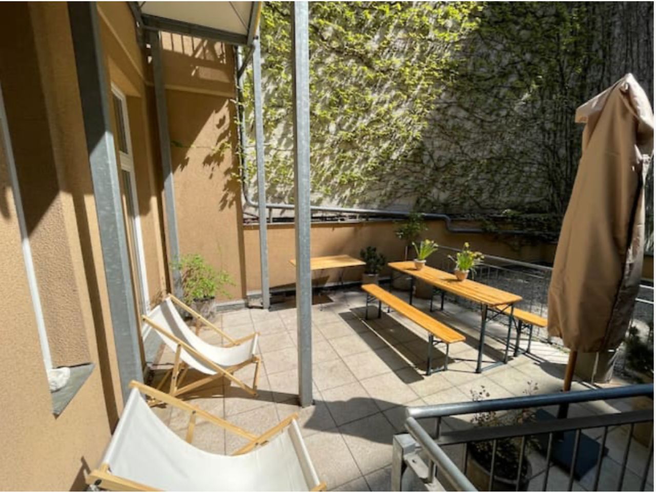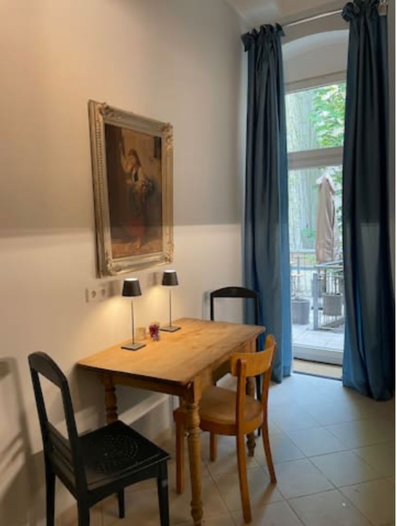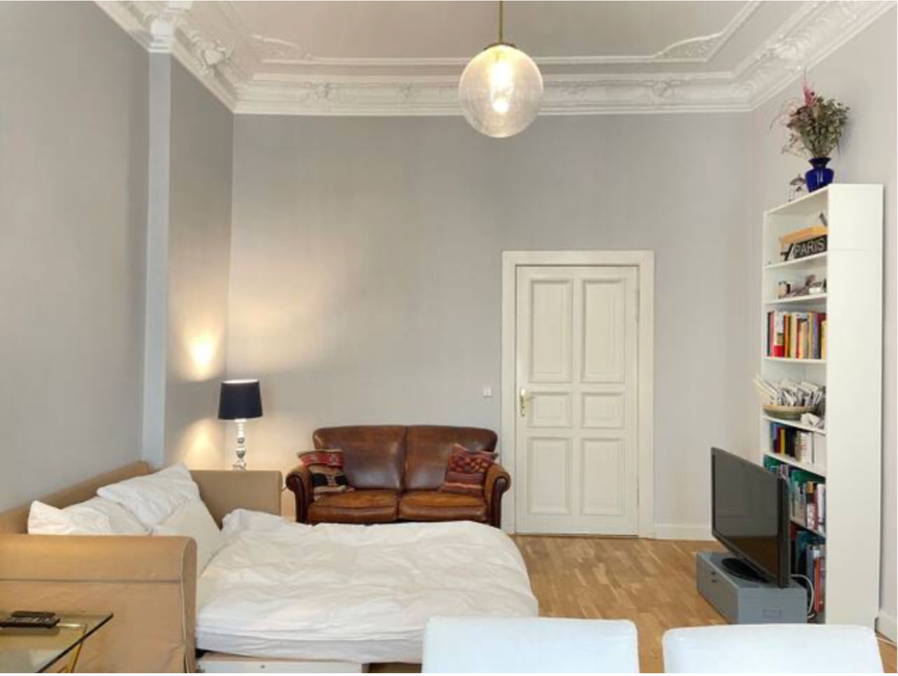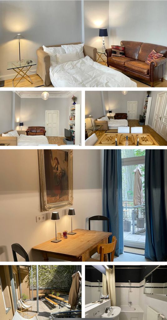 Ein kleines Arbeitszimmer mit Balkon und ein angrenzendes Wohnzimmer sind nach vorne, in Richtung Tieckstraße, ausgerichtet. Beide sind mit einer Doppelflügeltür verbunden und verfügen über Parkett und alte Stuckdecken. Das Wohnzimmer umfasst zwei Sofas, eines davon ein Schlafsofa und einen Essbereich mit 6 Stühlen. In der Küche befindet sich eine weiße Einbauküche und ein kleiner Essbereich. Die Küche und das Schlafzimmer blicken beide auf den Hinterhof und verfügen jeweils über eine Tür, die auf eine Terrasse (ca. 5qm) führt. Die Terrasse befindet sich im 1. Stock des Innenhofs und blickt auf eine große Kastanie. Das Bad verfügt über eine Waschmaschine und Badewanne.