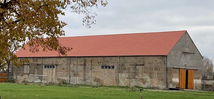 Die Scheune ist ein altes Objekt mit teils zugemauerten Bereichen in den Seitenwänden. Das Dach und die 2 Tore sind neu. Das original Gebälk ist offen sichtbar. Zum Objekt gehört ein 18.000 Quadratmeter großes Grundstück, das als Wiese angelegt ist. Um das gesamte Gelände ist eine 3 meter hohe Mauer und dadurch nicht einsehbar.