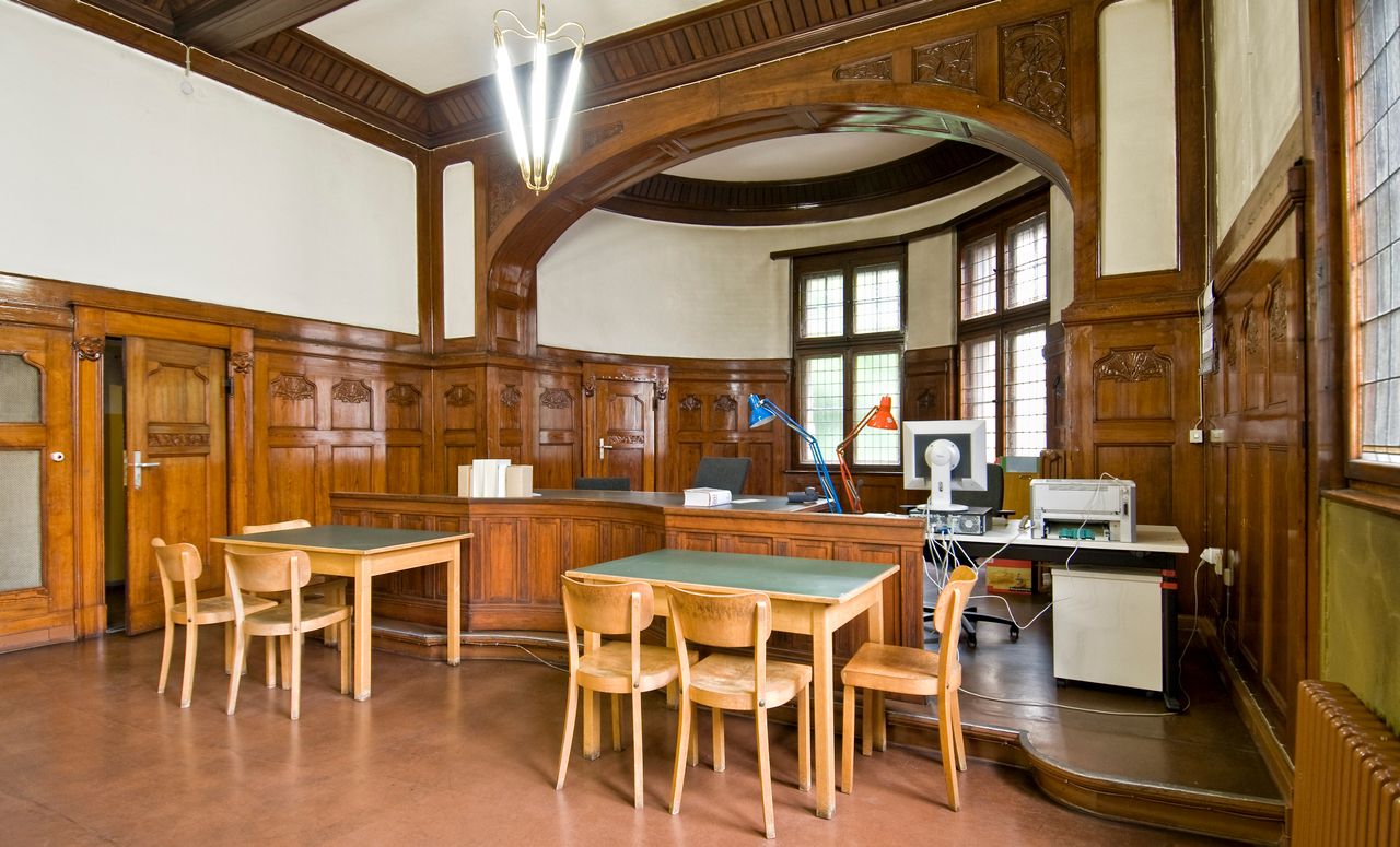 Das Gerichtsgebäude wurde 1899-1901 an zentraler Stelle der Karl-Marx-Straße erbaut. Der Architekt Paul Thoemer entwarf einen repräsentativen Eingangsbereich, der mit einem verzierten Giebel und beiderseitigen runden Türmchen versehen wurde. Die Ausformung dieses Schmuckgiebels deutet auf den Stil der deutschen Renaissance hin. Für die sich an den Eingangsbereich anschließenden Gebäudeflügel wurden unterschiedlich gestaltete Fensterformen ausgewählt, die die Fassade auflockern.