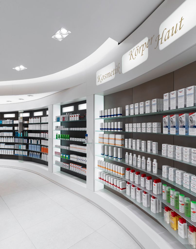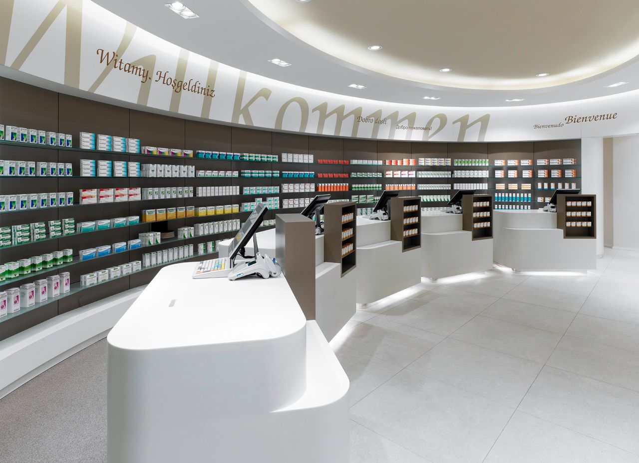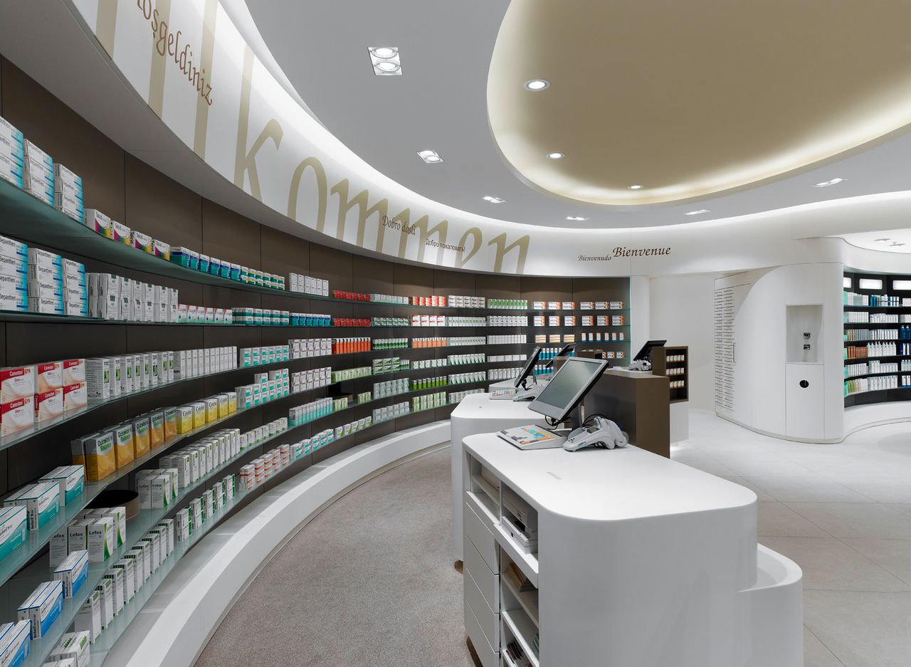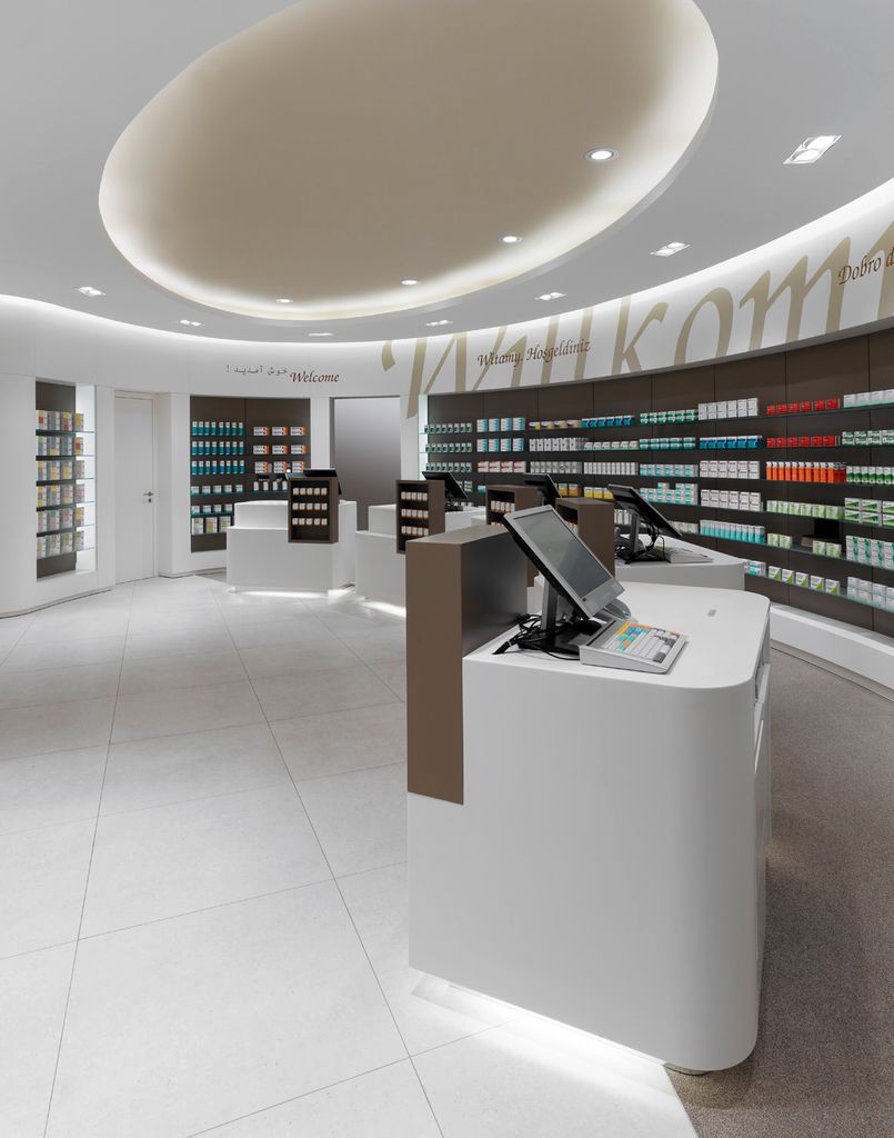 Helle und freundliche Apotheke in Berlin. großzügig gestaltete Verkaufsfläche mit hochwertigen Materialien, organischen Formen und warmen Farben. 7 Kassenarbeitsplätze.