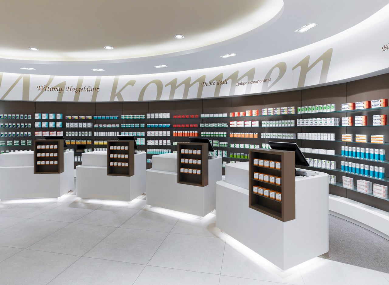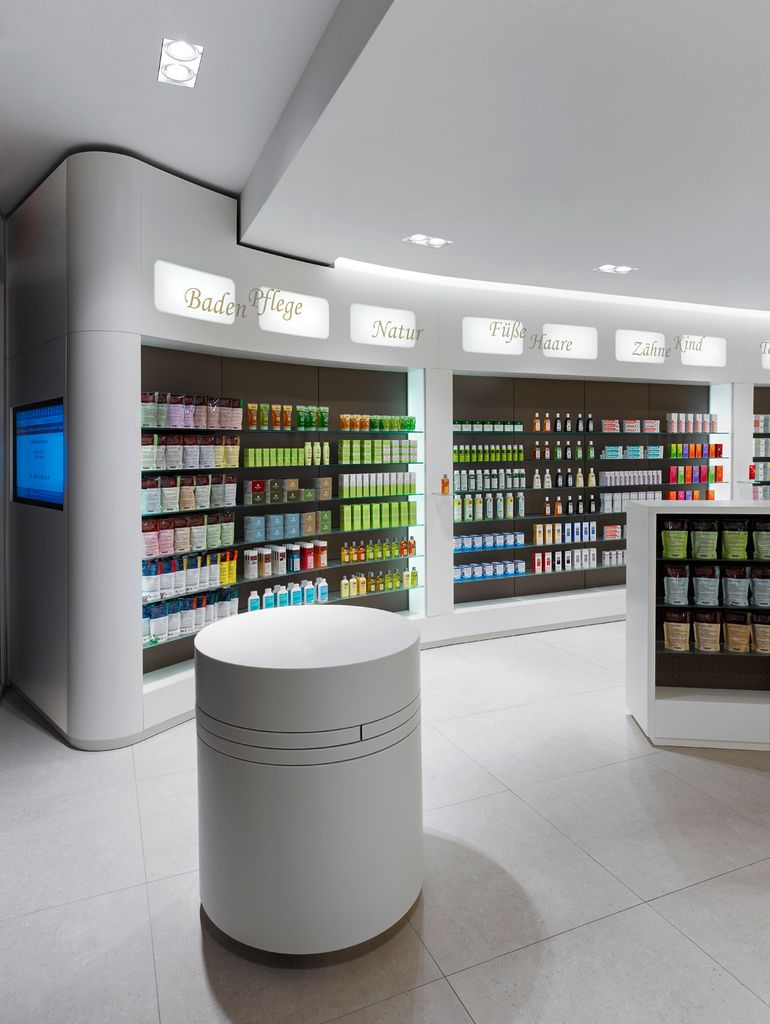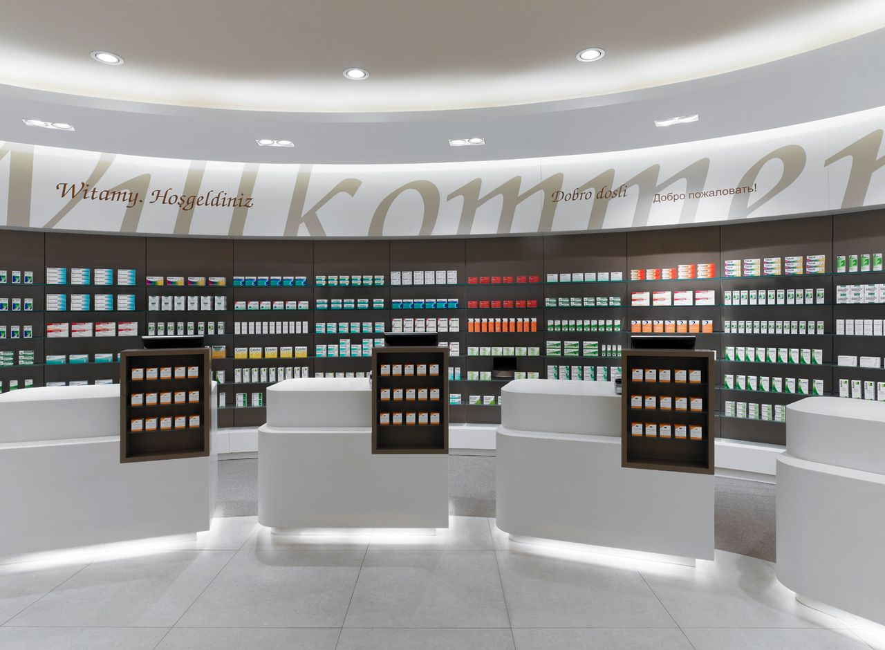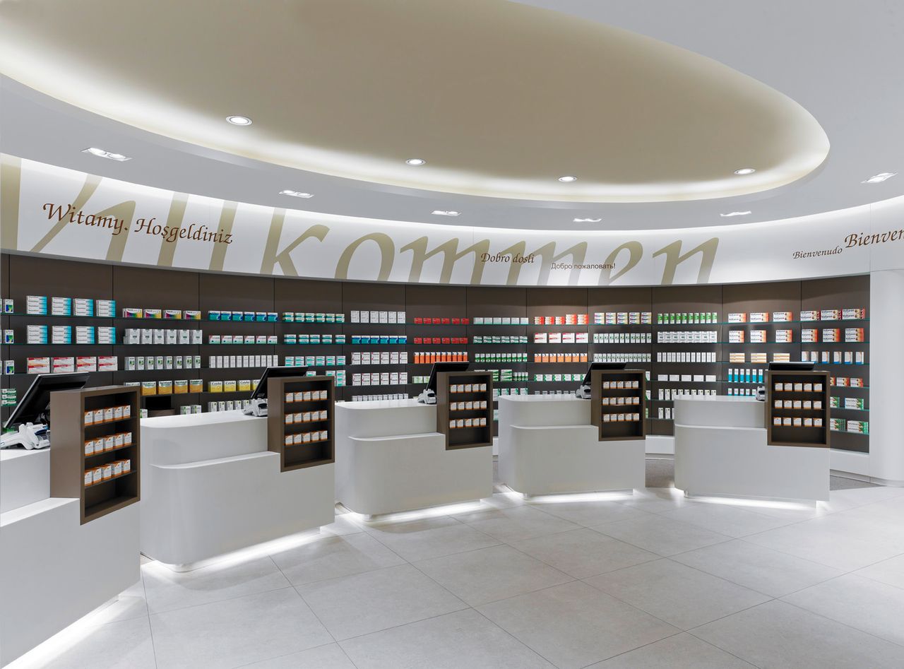 Helle und freundliche Apotheke in Berlin. großzügig gestaltete Verkaufsfläche mit hochwertigen Materialien, organischen Formen und warmen Farben. 7 Kassenarbeitsplätze.