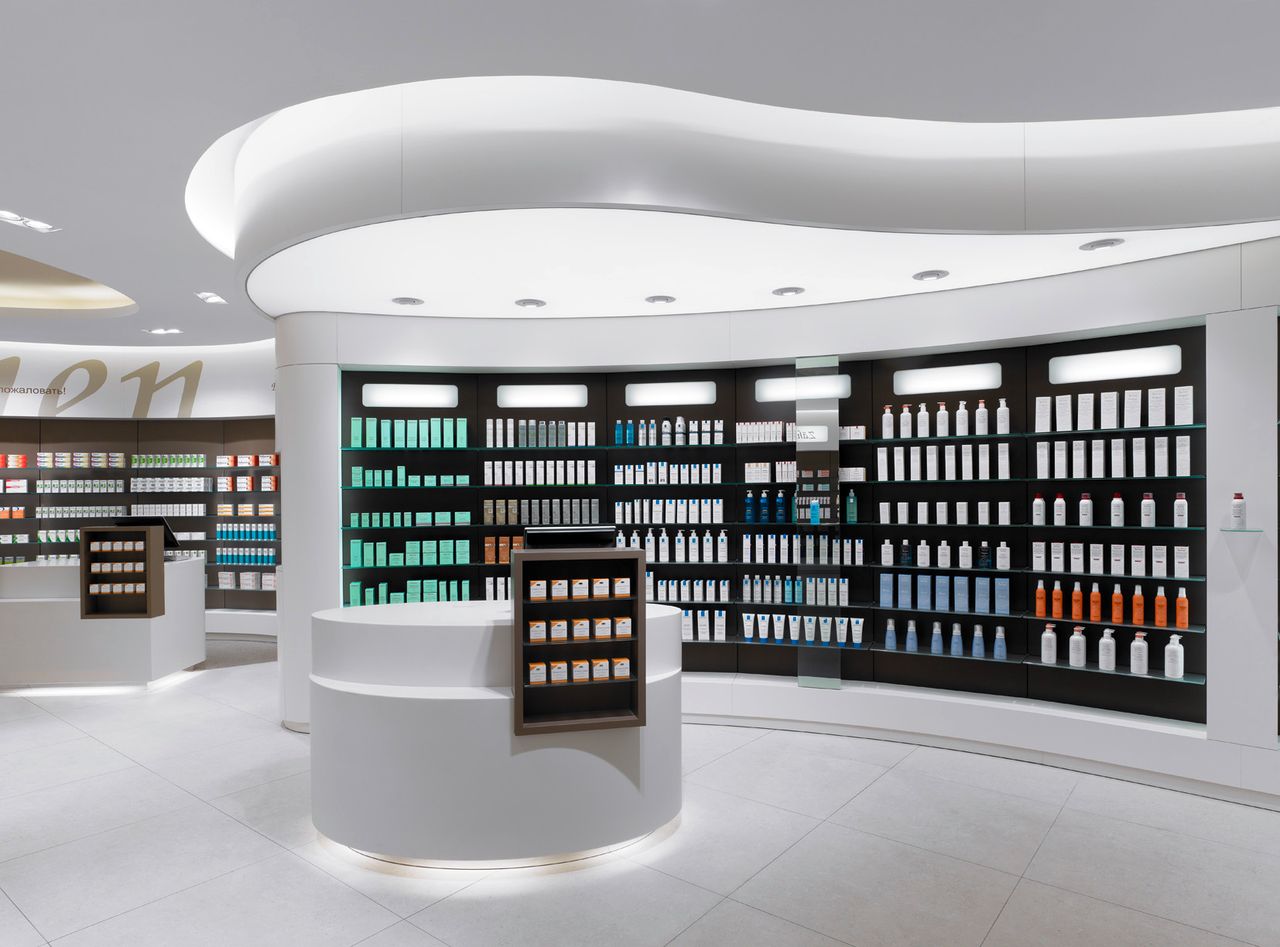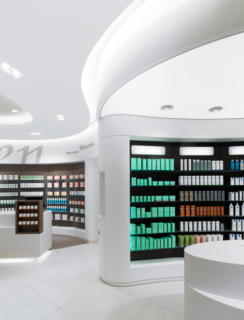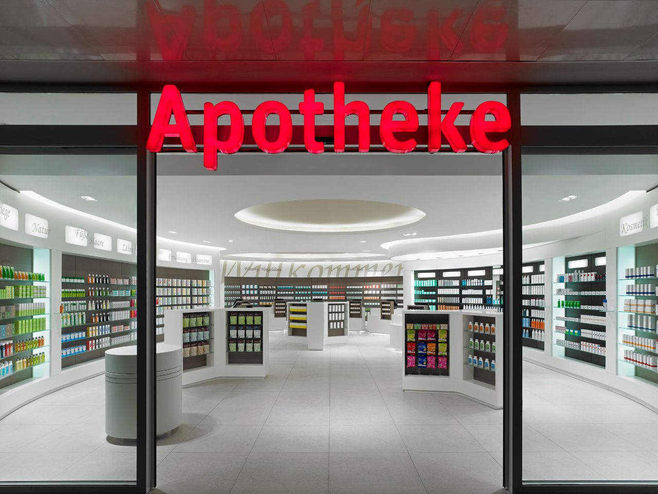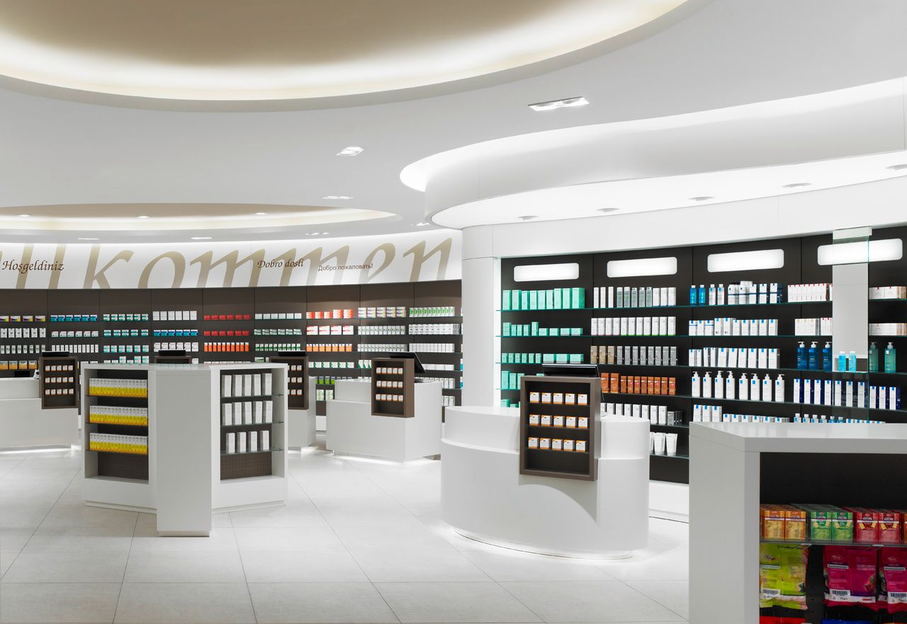 Helle und freundliche Apotheke in Berlin. großzügig gestaltete Verkaufsfläche mit hochwertigen Materialien, organischen Formen und warmen Farben. 7 Kassenarbeitsplätze.