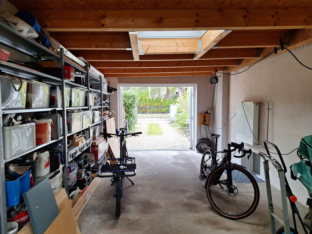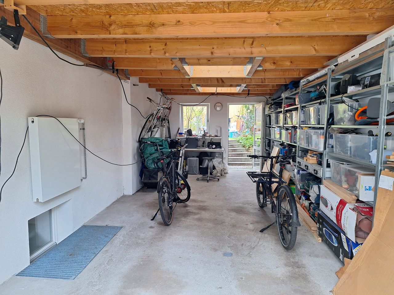 An das Haus anschließend befindet sich die ebenfalls sehr helle Garage, bzw. der Hobbyraum. Durch die Oberlichter und einem zweiflügligen Glas-Tor zur Straße, bzw. der Glastür und dem Fenster zum Garten sind hier verschiedene Nutzungen möglich.