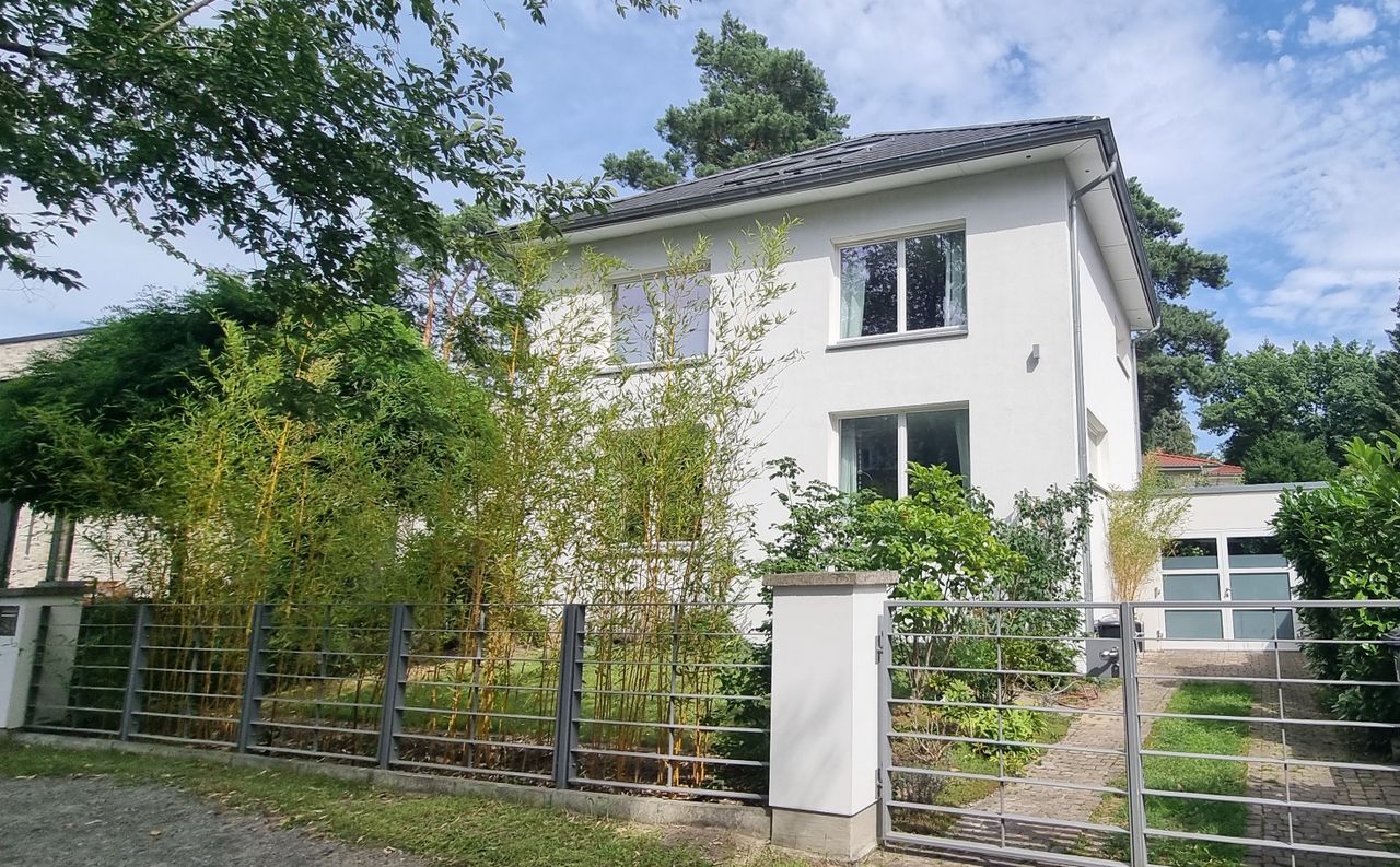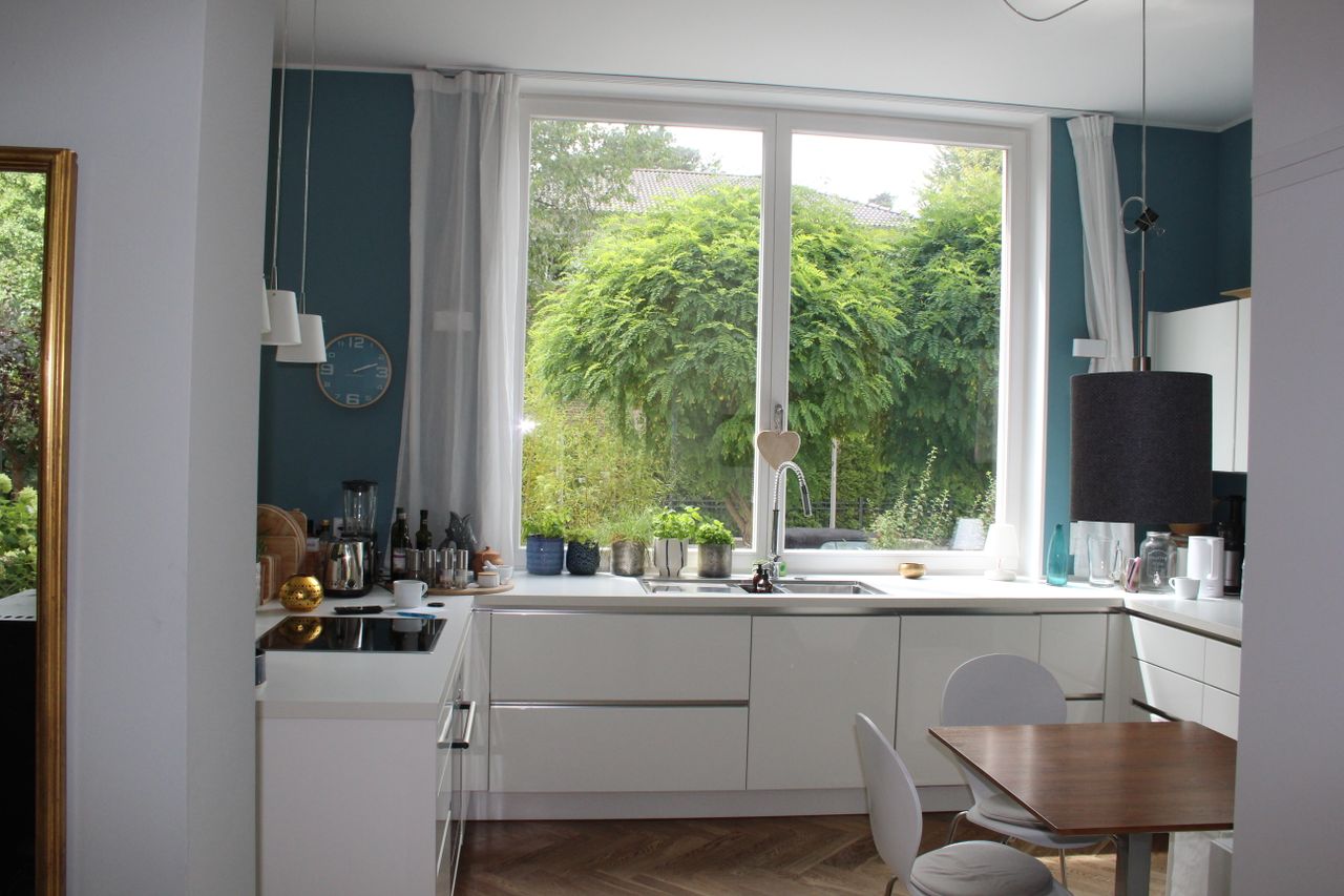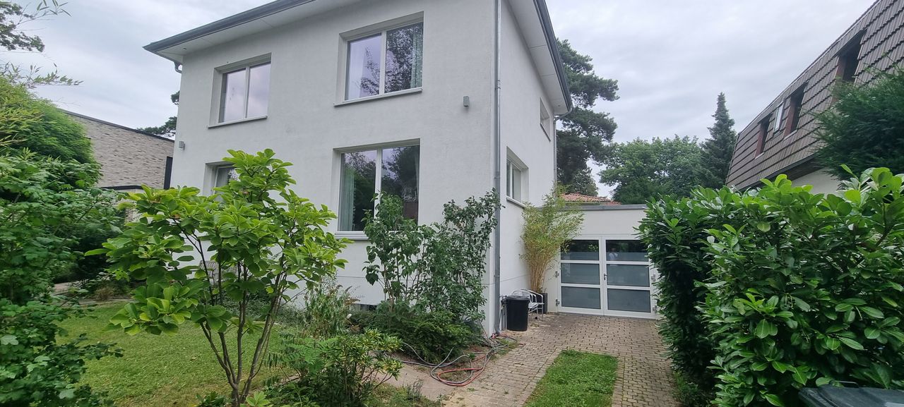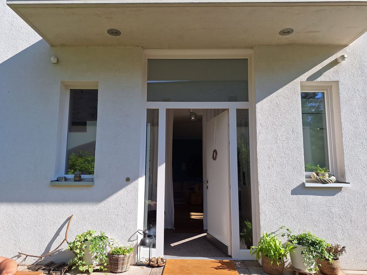 Offenes lichtdurchflutetes helles Haus von Architektenfamilie mit umlaufenden Garten