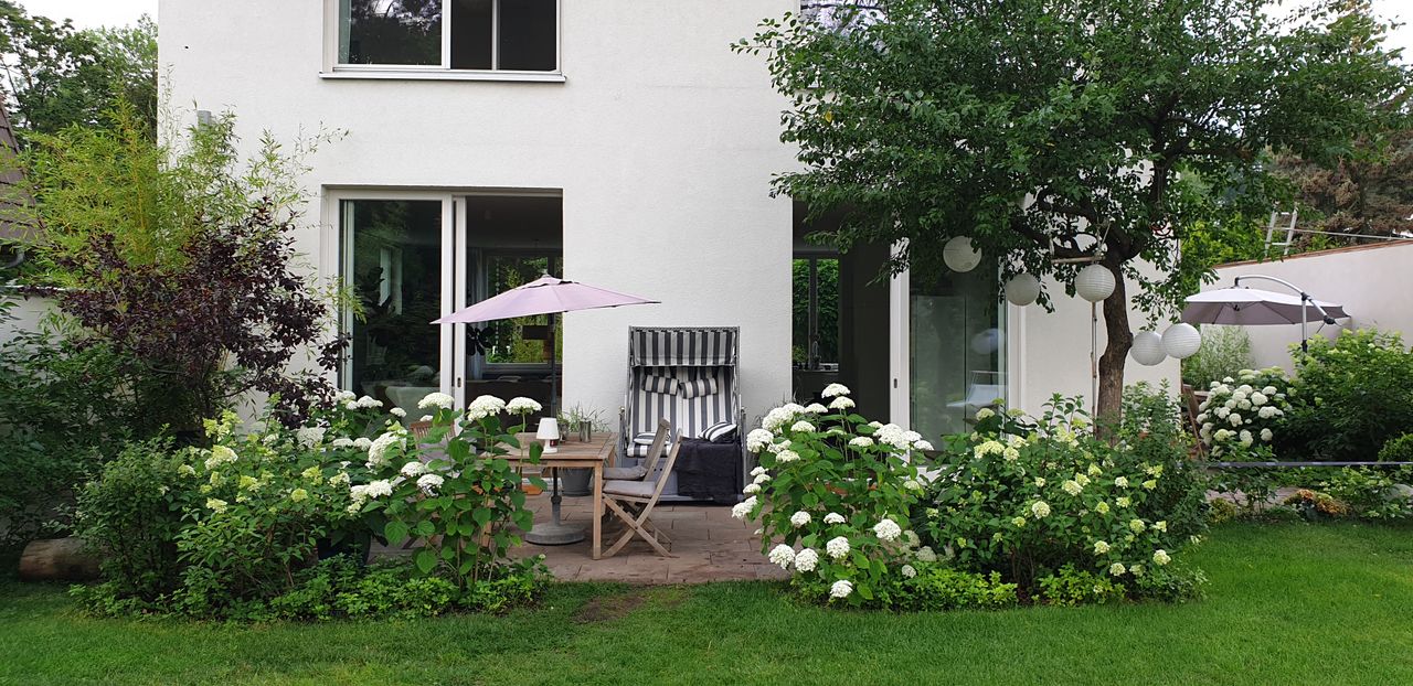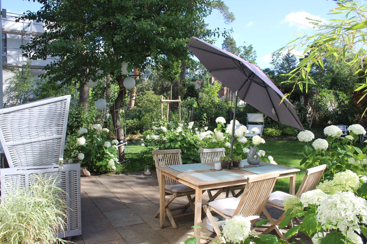 Der Garten bietet diverse Bereiche, separate Ost- und Westterrasse, sowie Ecken und Mäuerchen für vielfältige und unterschiedliche Gartenszenen.