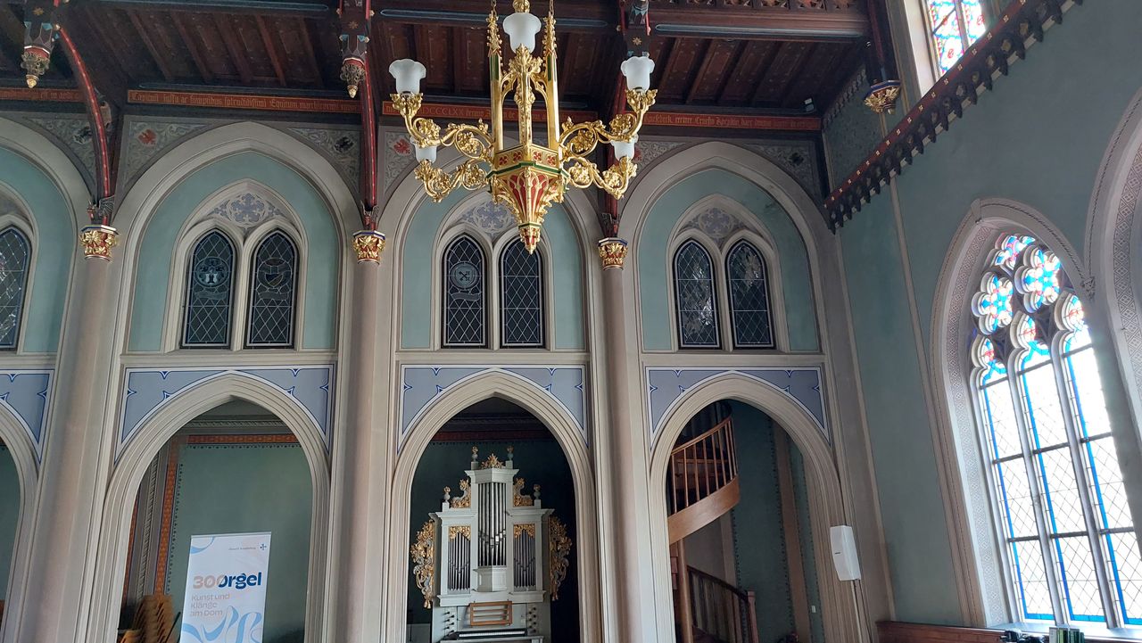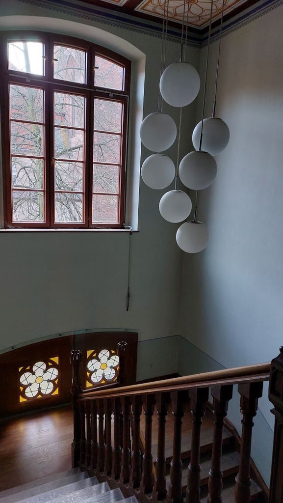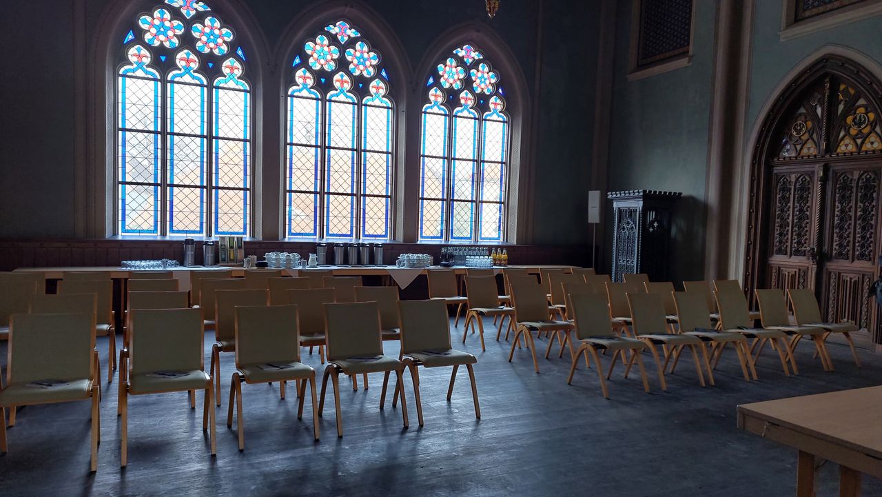 Neben der aufwändig dekorierten Holzdecke fallen besonders die beiden sechsarmigen Kronleuchter mit einer Höhe von 2,1 m und einem Durchmesser von 1,6 m ins Auge. Doch auch die großen Fenster aus Buntglas verleihen dem Saal eine einzigartige Atmosphäre. Hier lassen sich Veranstaltungen, Empfänge und Feierlichkeiten von 40 bis 120 Personen durchführen." (zietiert nach: domevents.de)