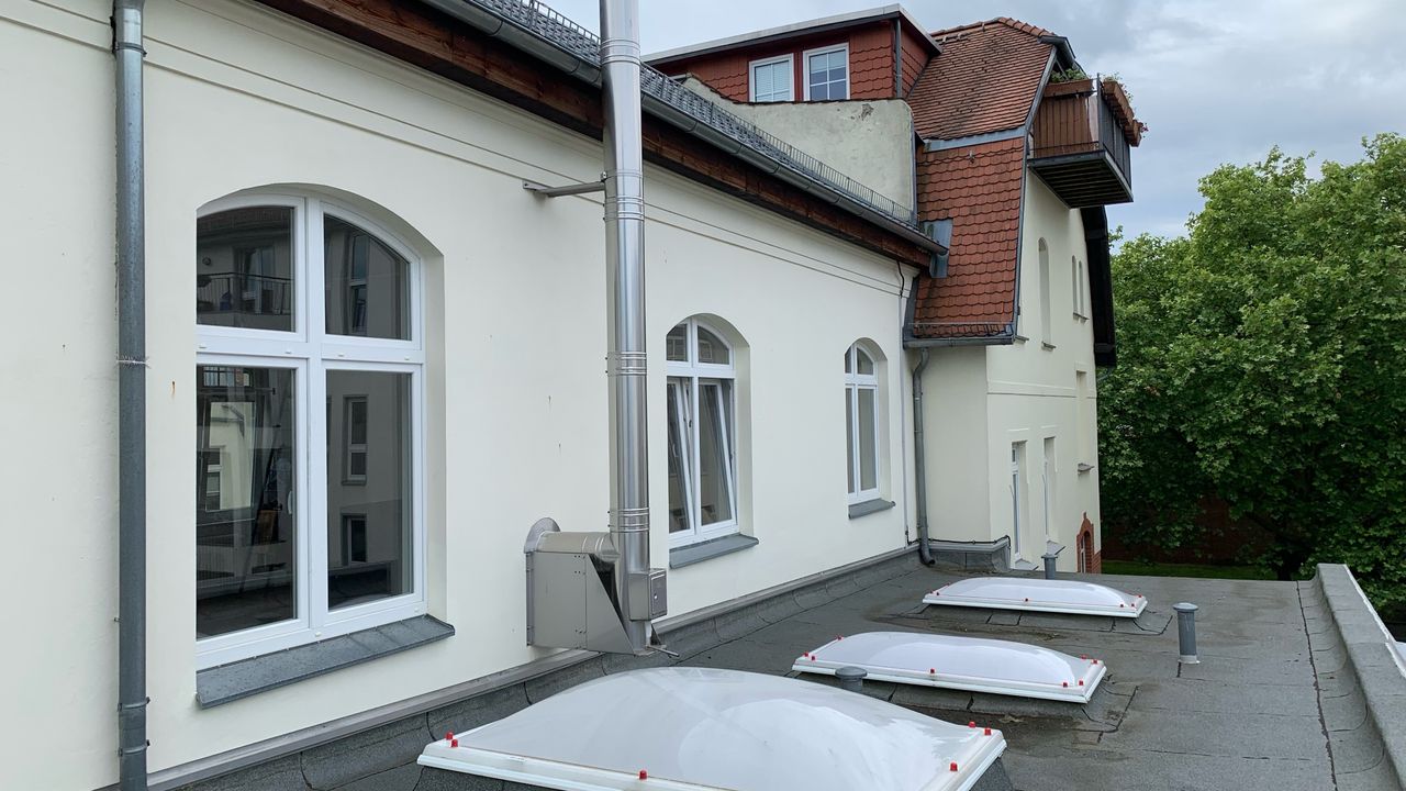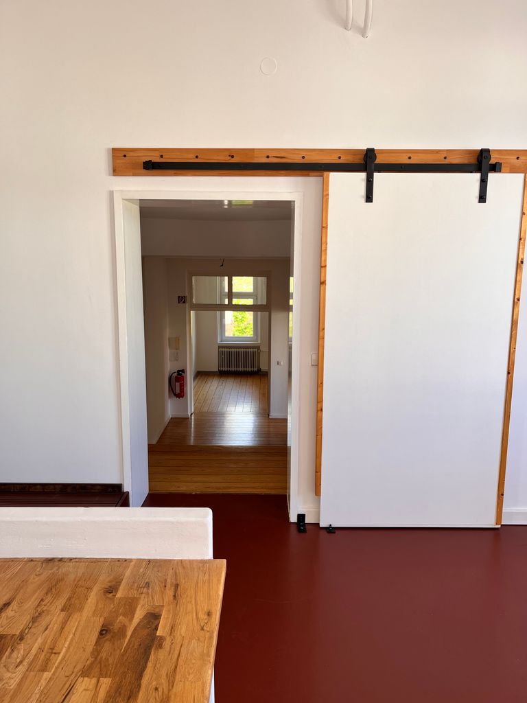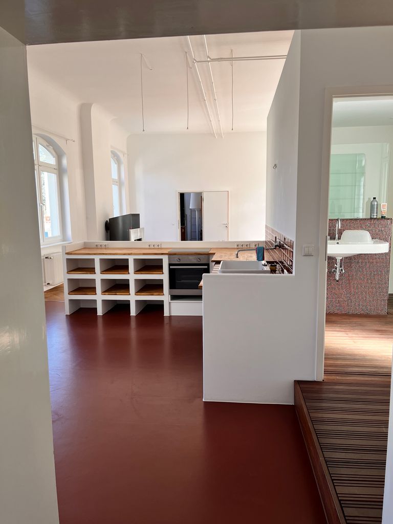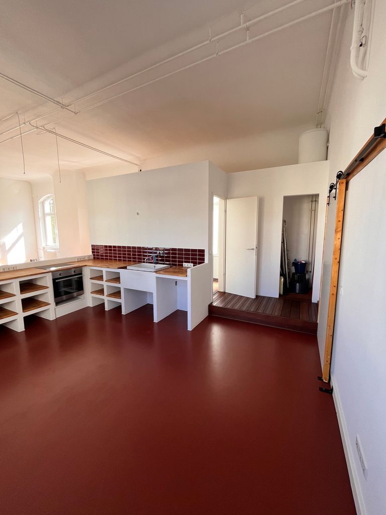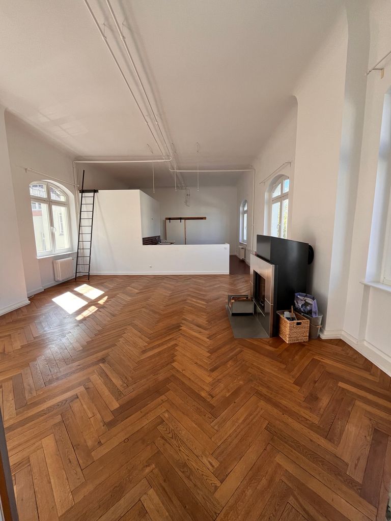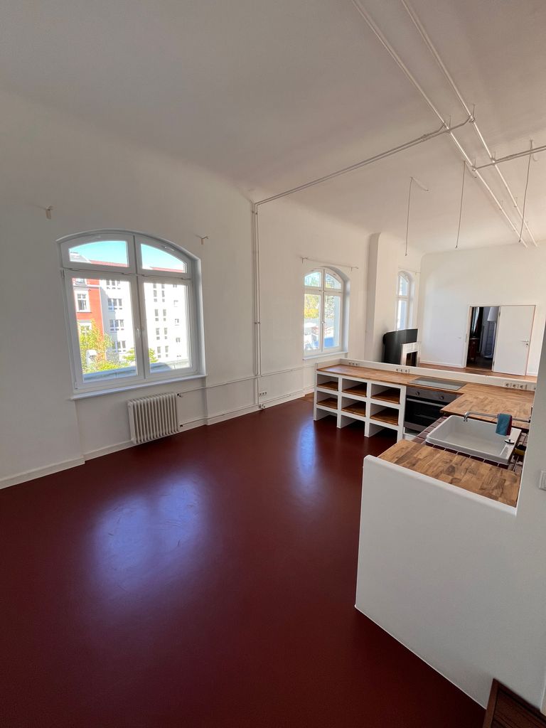 Loft 120qm | Lounge für die Kunden der "Ballsaal-Studios "| 1 großer Raum mit integrierter Küche und einem Bad-Würfel | Raumhöhe ca. 3,90m | 1 Zimmer (25-30qm) | große Fenster, schallisoliert | 2 Toiletten, 1 begehbare Dusche | auf einer Seite ist ein Vorbau mit Stellmöglichkeiten für Scheinwerfer, Stative, etc. | im weiteren Verlauf der Loft befindet sich ein Tonstudio, Raum-in Raum gebaut, so dass sich niemand in die Quere kommt. Kann evtl. auch mit genutzt werden | Fotos vorhanden