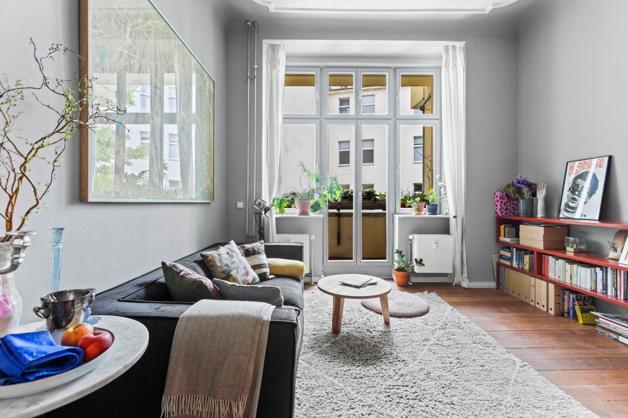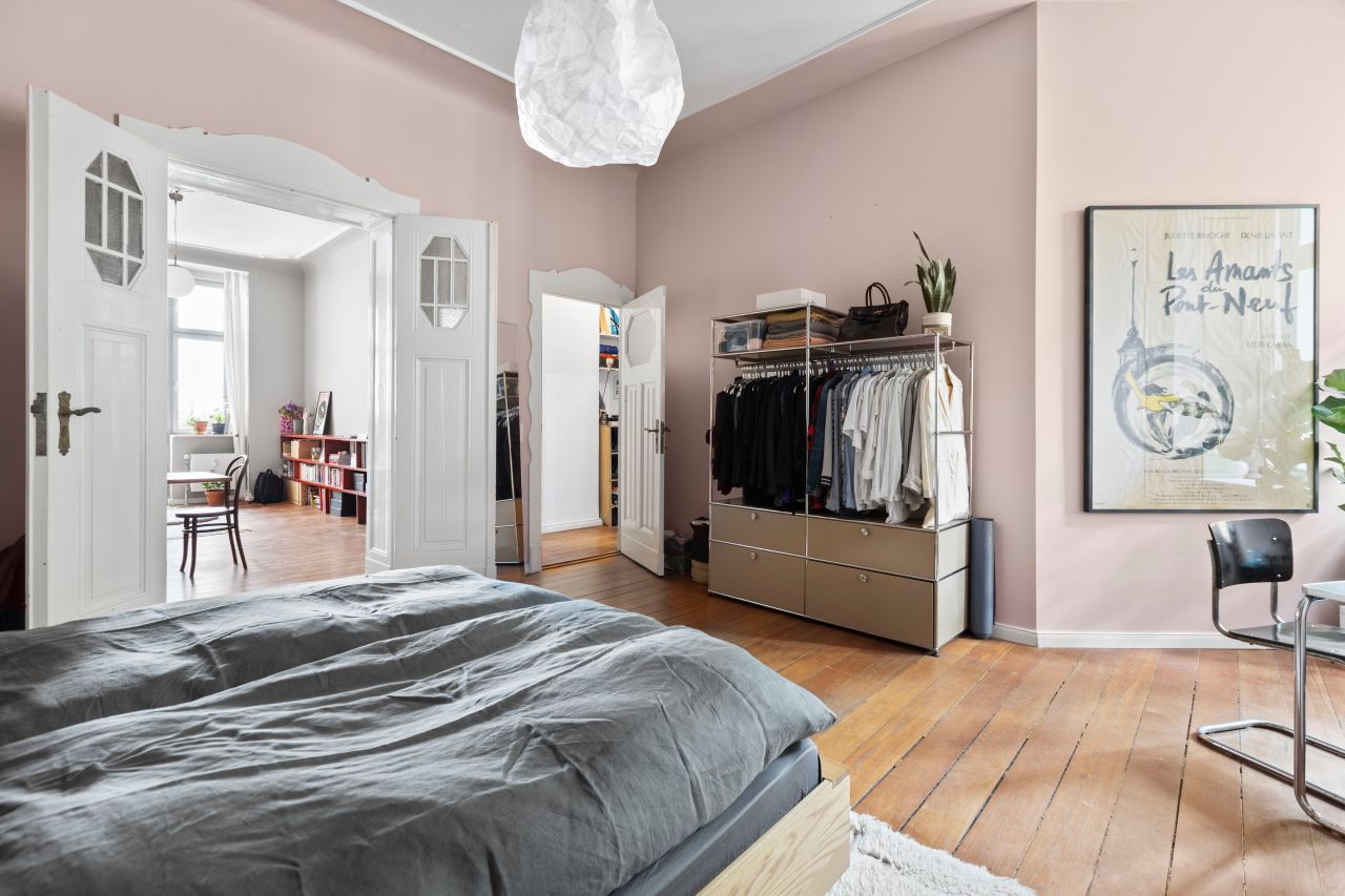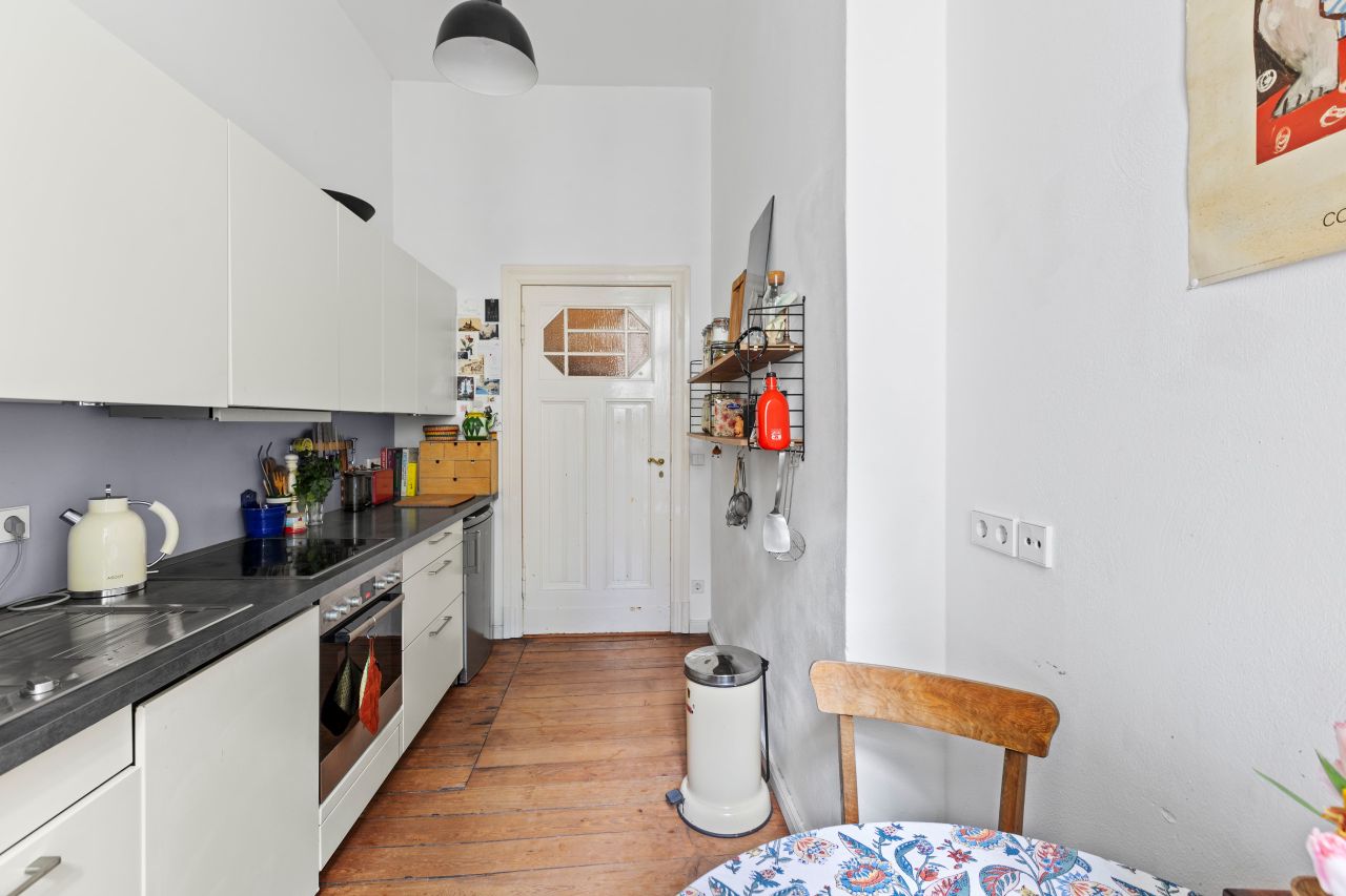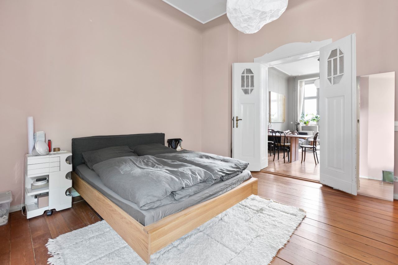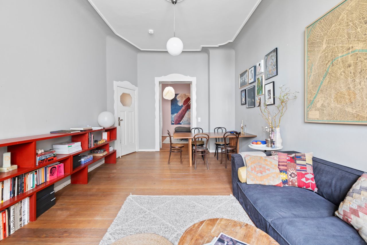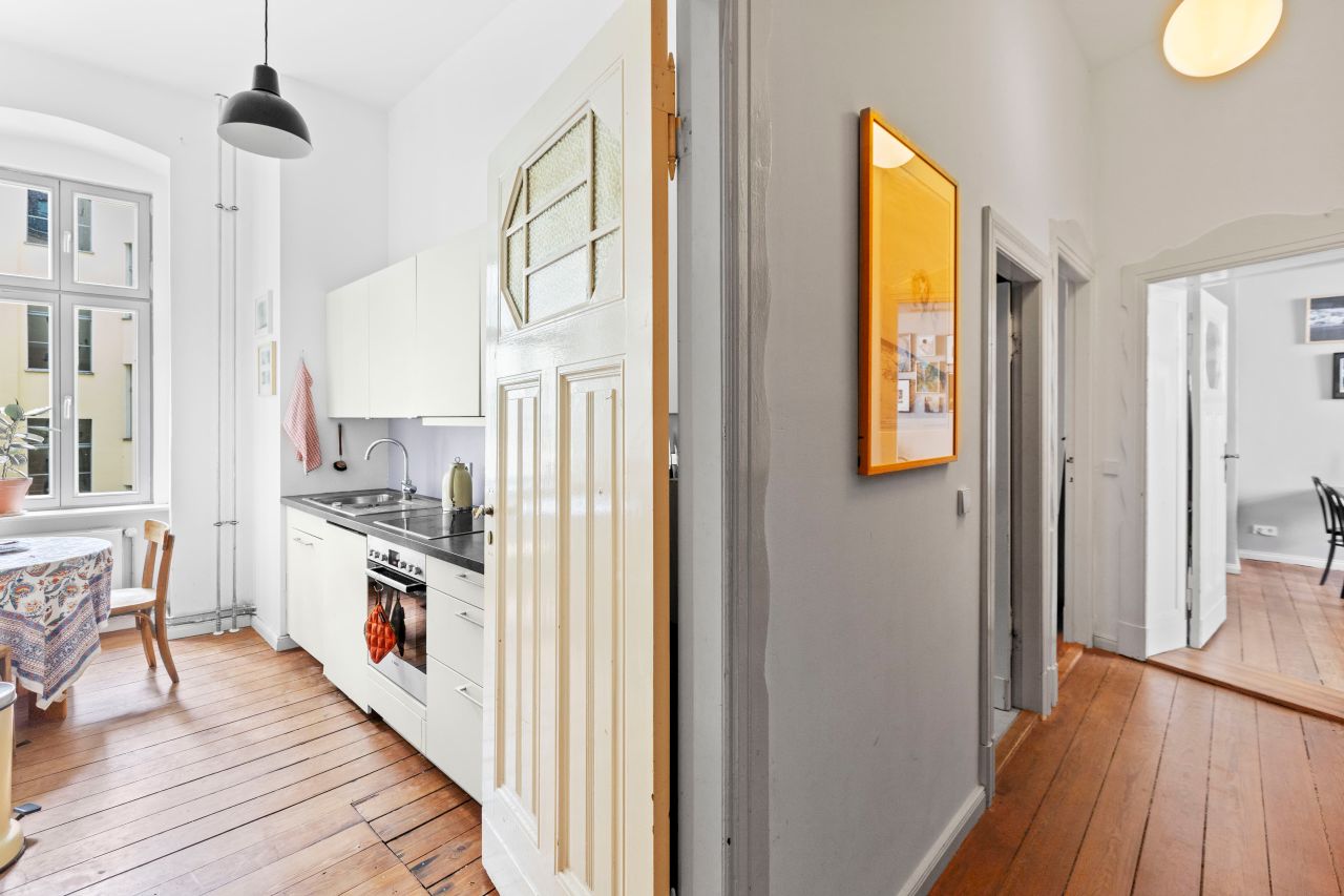 Schöne freundliche Berliner Altbauwohnung mit dekorativen Türelementen, Flügeltür, üppigem Balkon und Dielenboden.