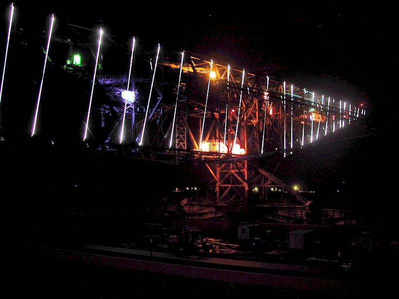 Die Licht-Klang-Installation besteht aus weißen Lichtstreifen und farbigen Lichtpunkten und hat eine elektrische Leistung von 27 Kilowatt. Licht und Stahl, Farben und geheimnisvolle Geräusche verschmelzen zu einer fast mystischen Kulisse für den nächtlichen Rundgang. An der Spitze, ca. 80 m über Grund, taucht man ein in die Stille der Nacht und blickt weit in die nächtliche Lausitzer Landschaft.