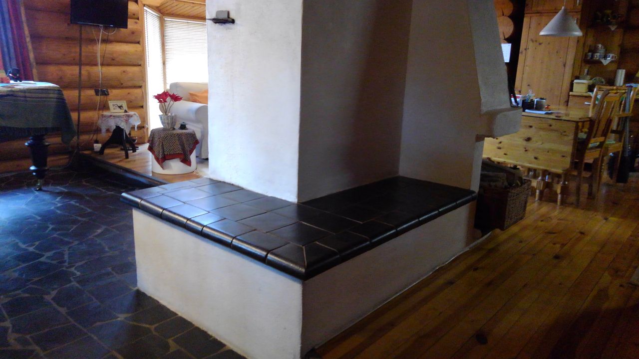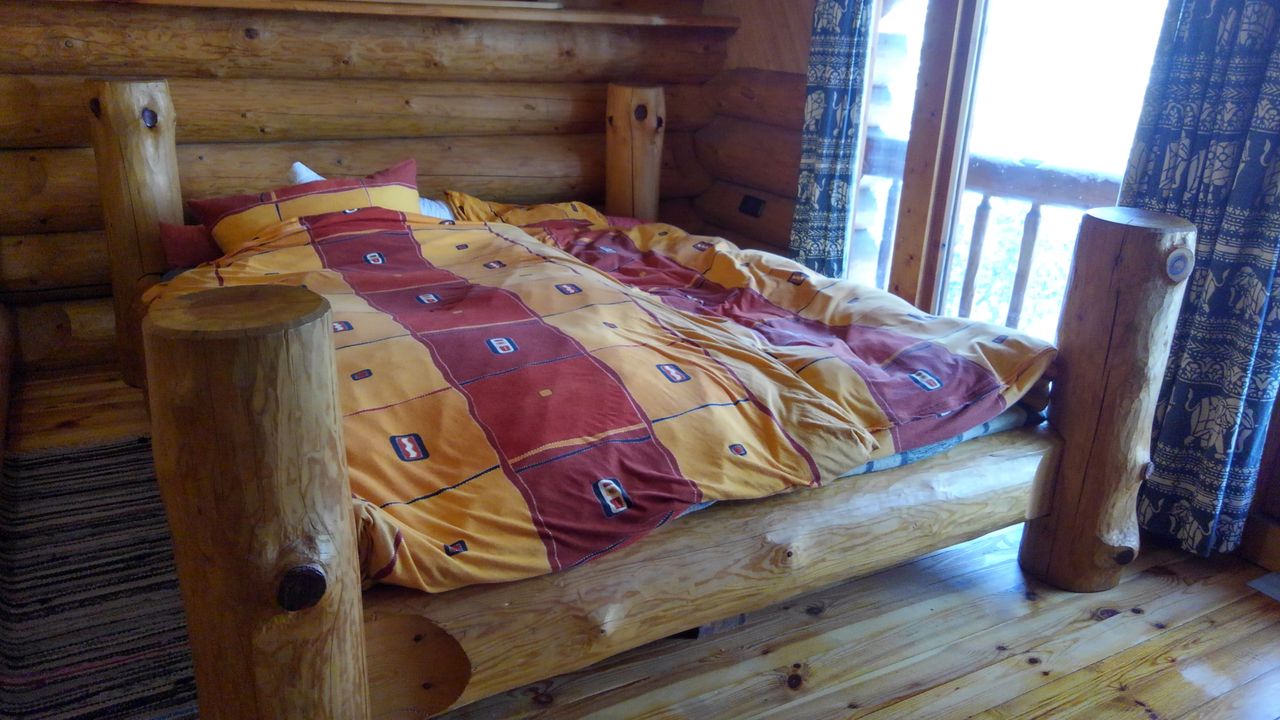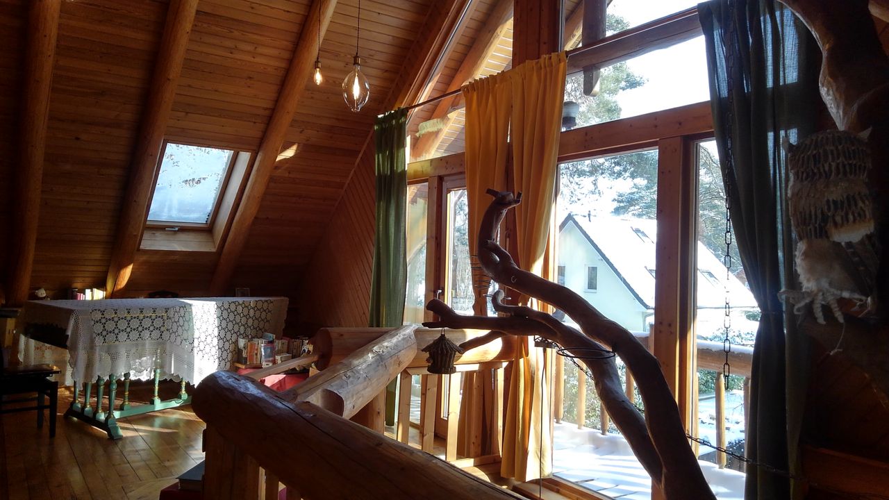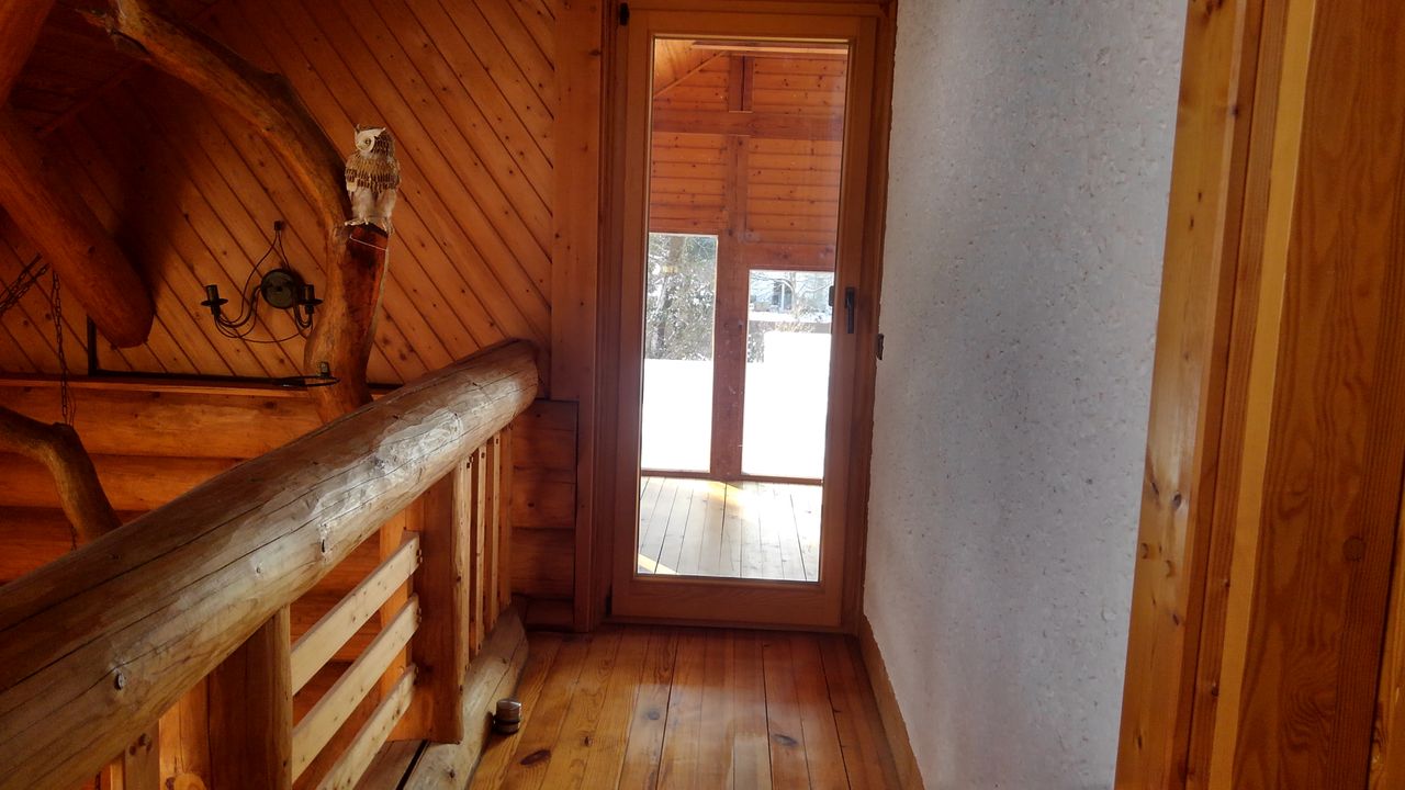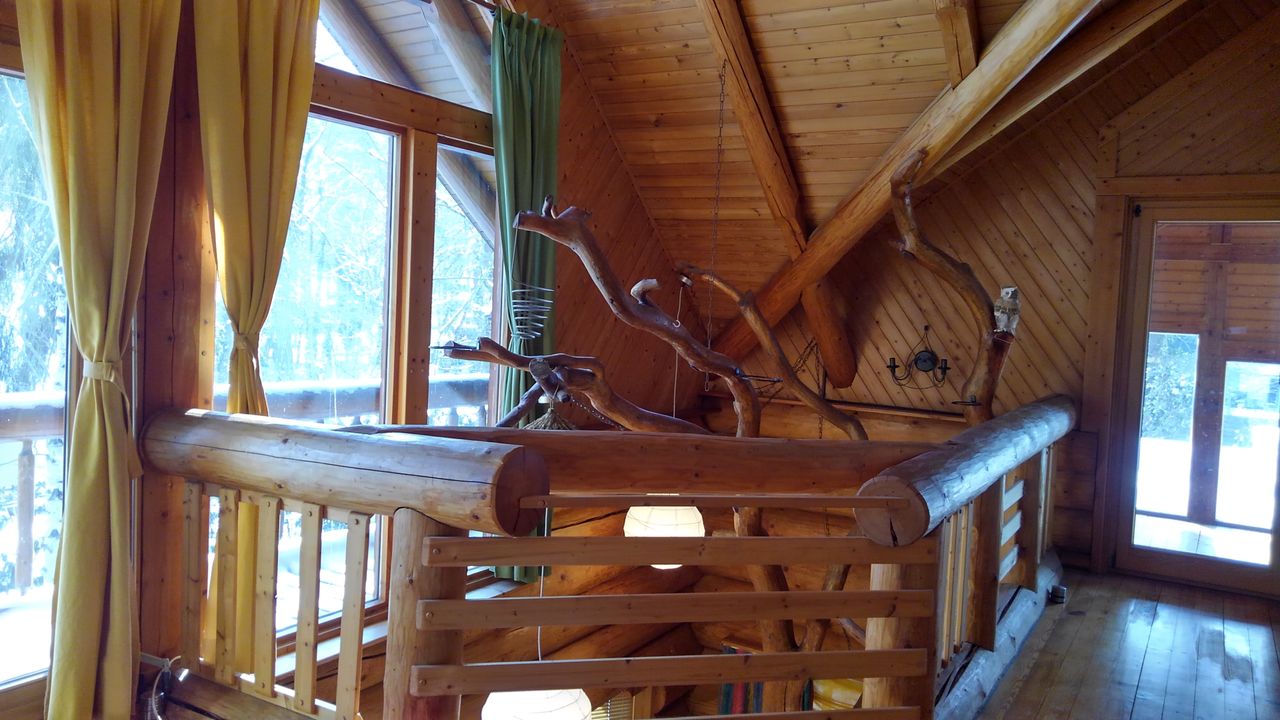 Erstens das sich um eine Ofenlandschaft mit offenem Kamin und warmer Ofenbank, mit Loft über zwei Stockwerke erstreckende Haupthaus im Blockhausbau.