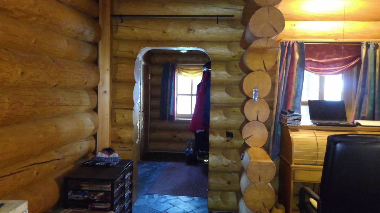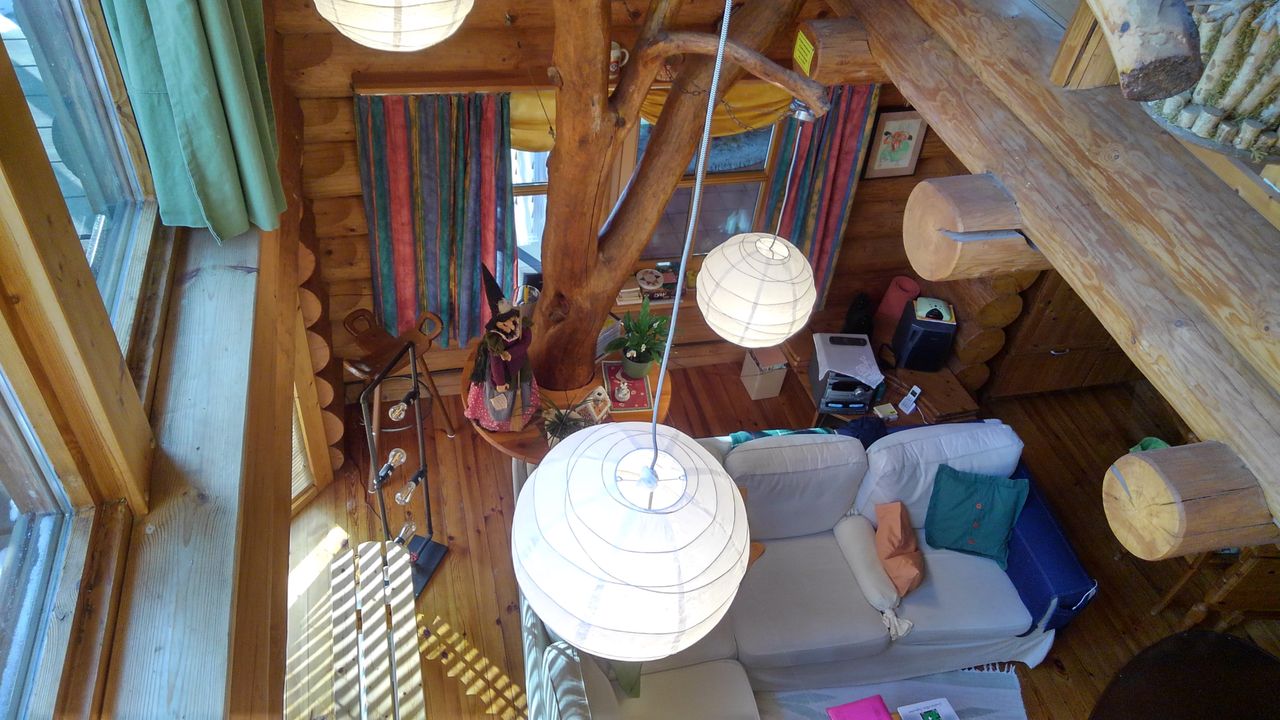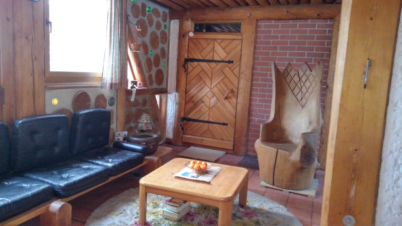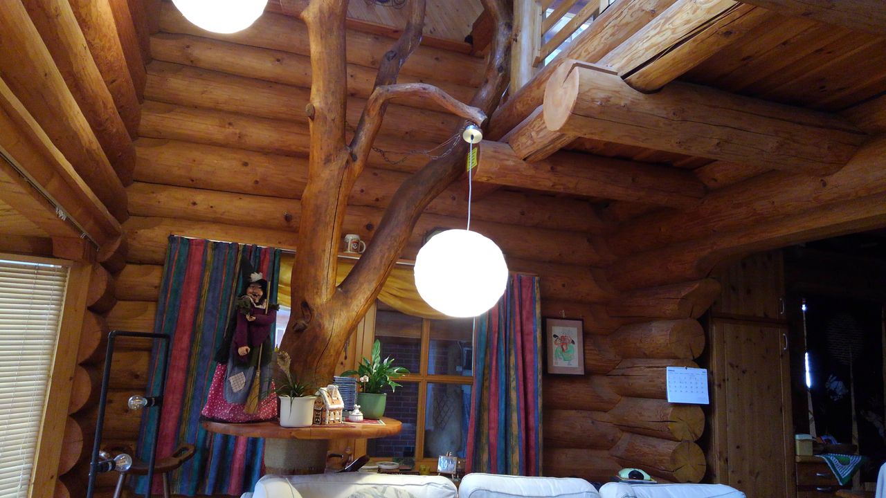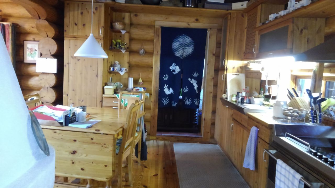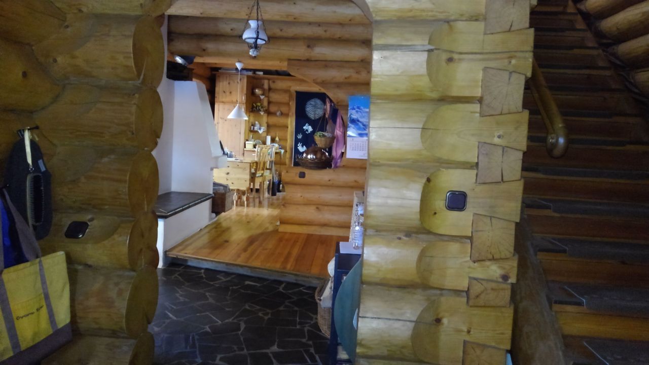 Erstens das sich um eine Ofenlandschaft mit offenem Kamin und warmer Ofenbank, mit Loft über zwei Stockwerke erstreckende Haupthaus im Blockhausbau.