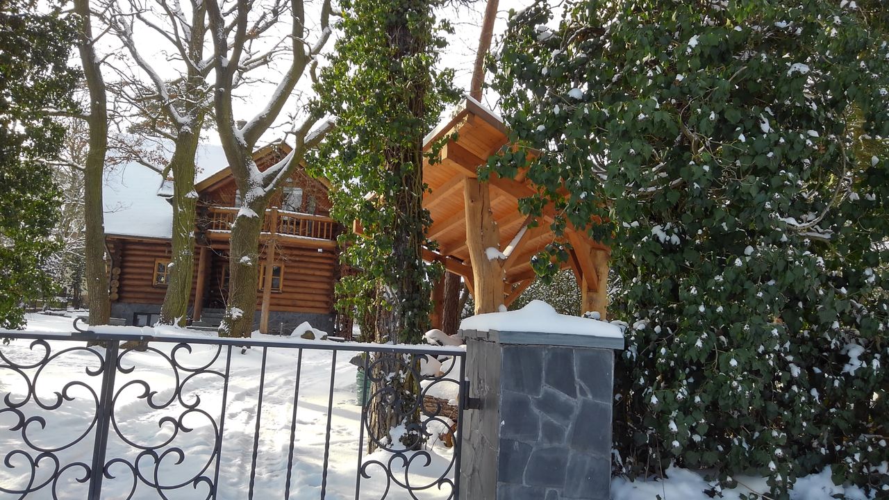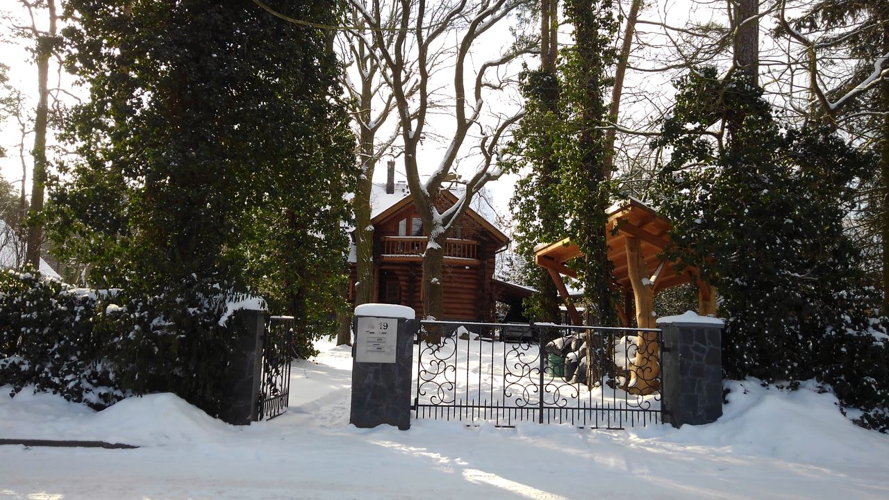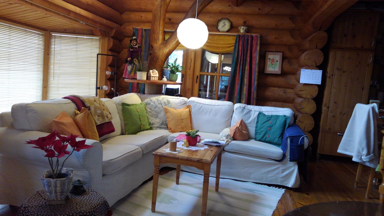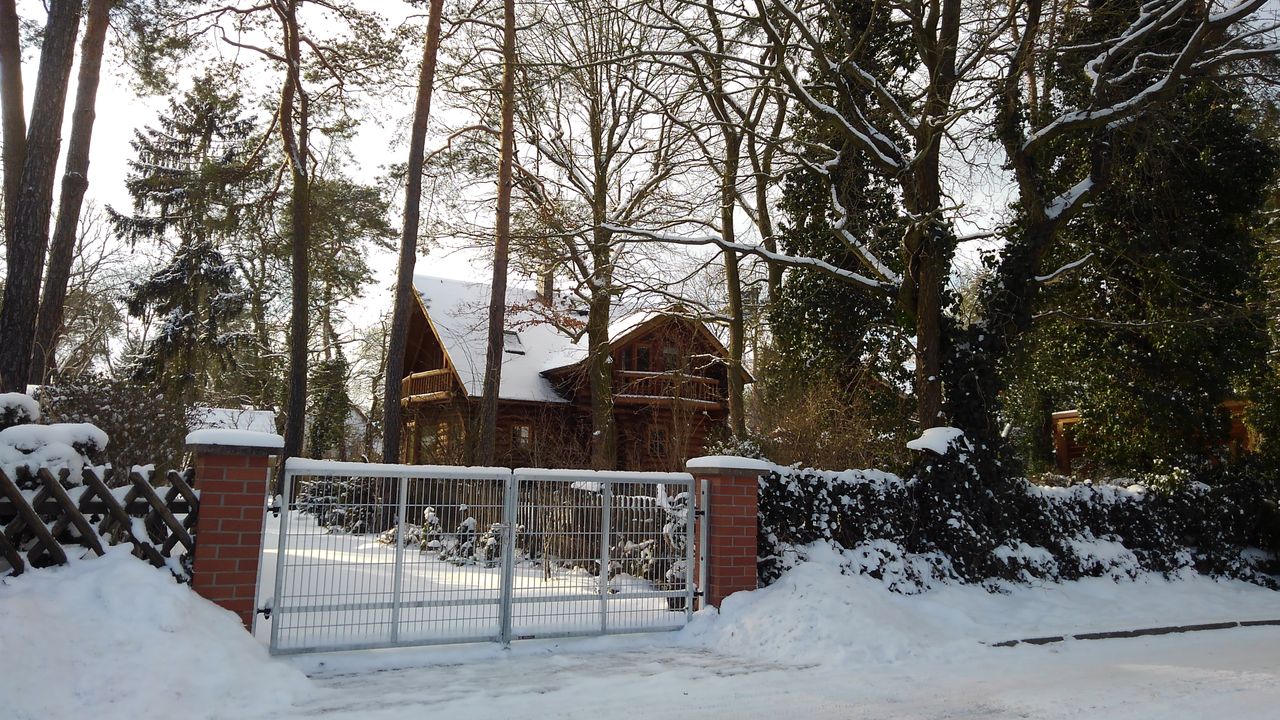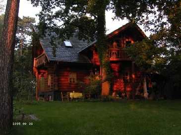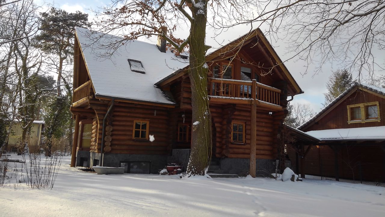 Unter hohen Eichen und Kiefern nur 2 km südlich der Babelsberger Filmstudios, Potsdam, steht auf einem Grundstück im englischen Gartenbaustil dieses handgefertigte Blockhaus. Handgefertigt weil nicht durch die Maschine geschickt und deshalb mit all seinen natürlichen Unförmigkeiten. Für den Laien daran erkenntlich, dass die Stämme an den Ecken immer abwechselnd Wurzel auf Spitze mit stark variierenden Durchmessern übereinanderliegen.