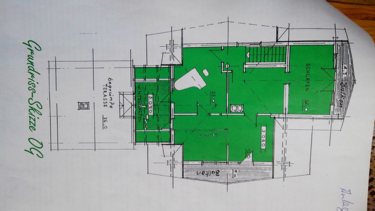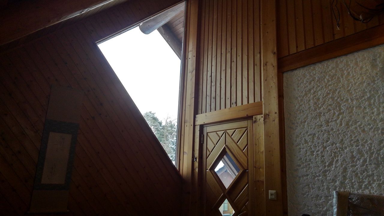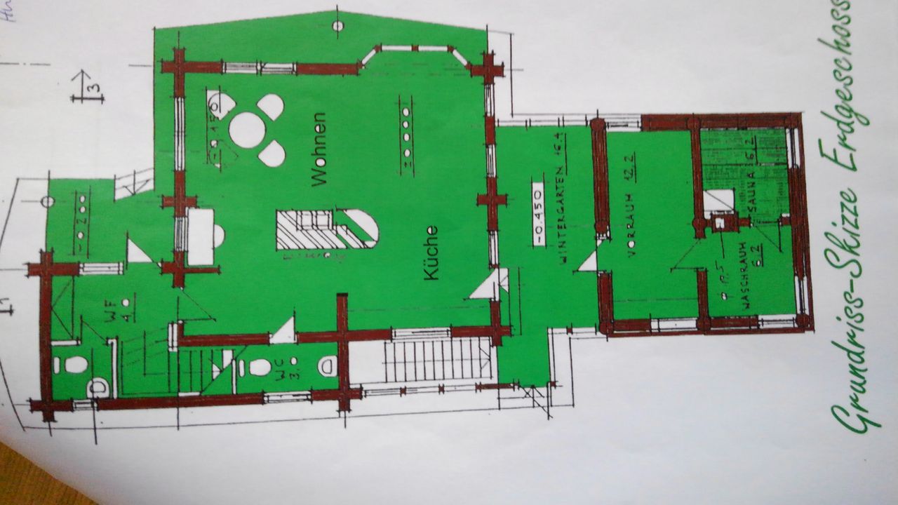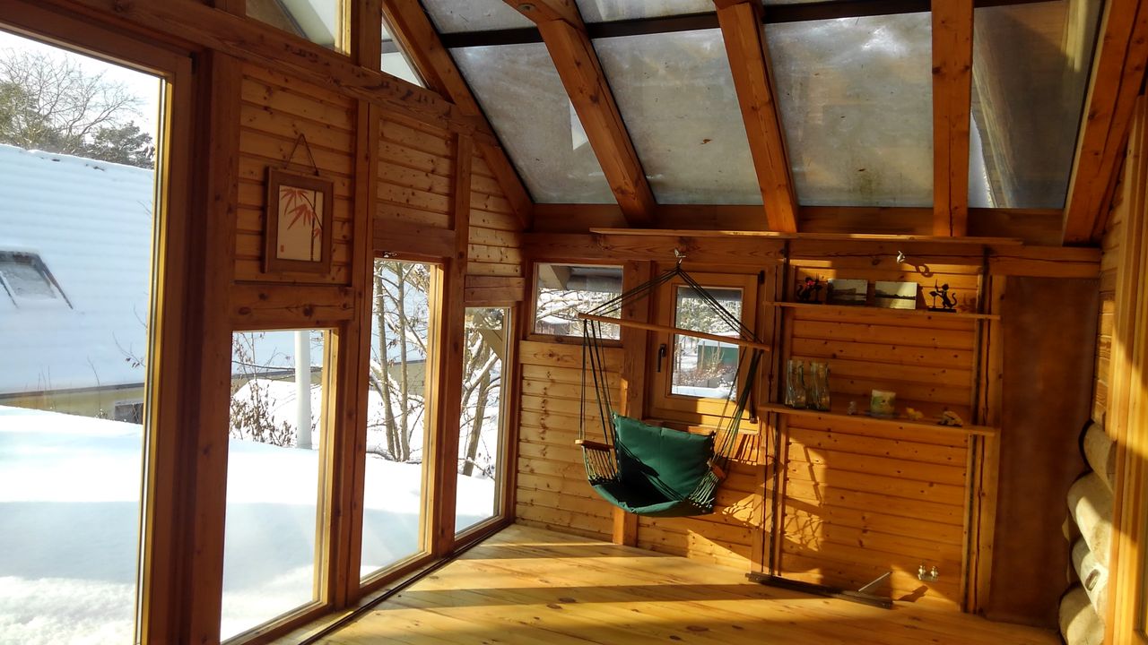 Und drittens, damit man nicht vom Haupthaus in die Sauna durch den Regen oder die Kälte muss, einen zwischen diese beiden geklemmten, zweistöckigen Wintergarten in Ständerbauweise.