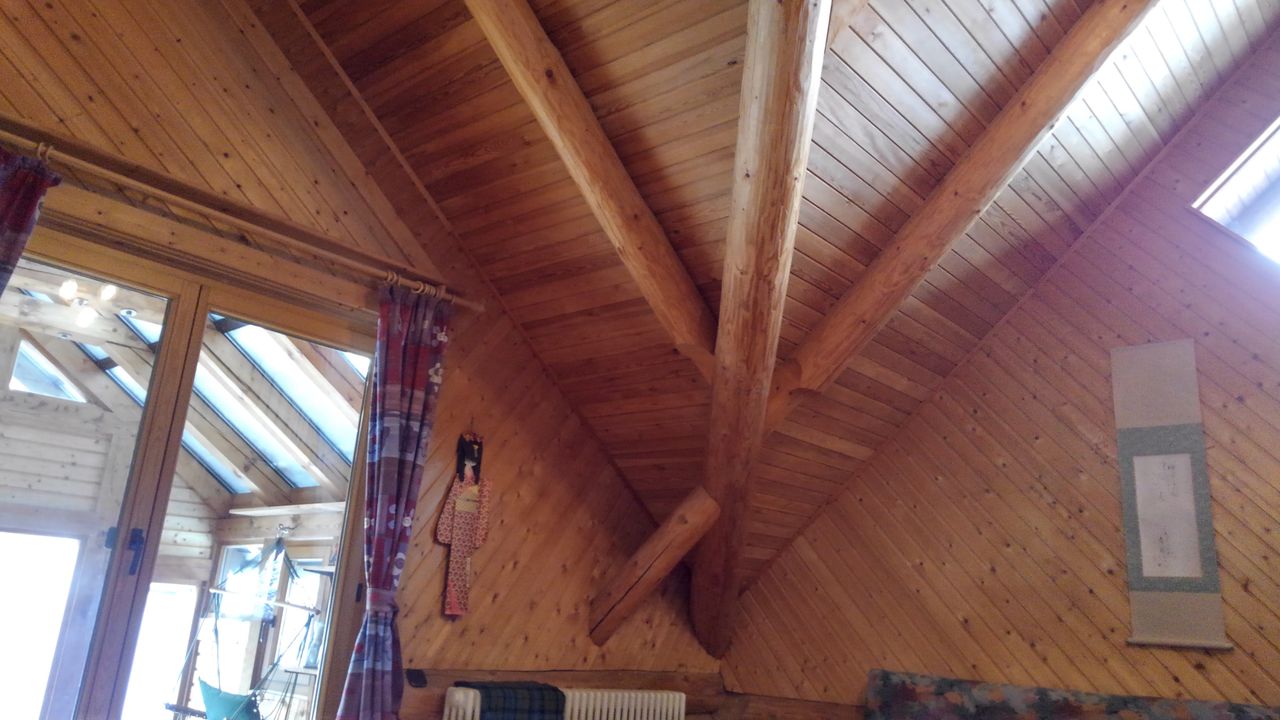 (Kanadisches) Blockhaus aus nur geschälten aber ansonsten in ihrer natürlichen Form belassenen Stämmen in der double-scribe shrink-fit Technik unter der Regie des Blockhausbaukünstlers Robert W. Chambers gebaut: