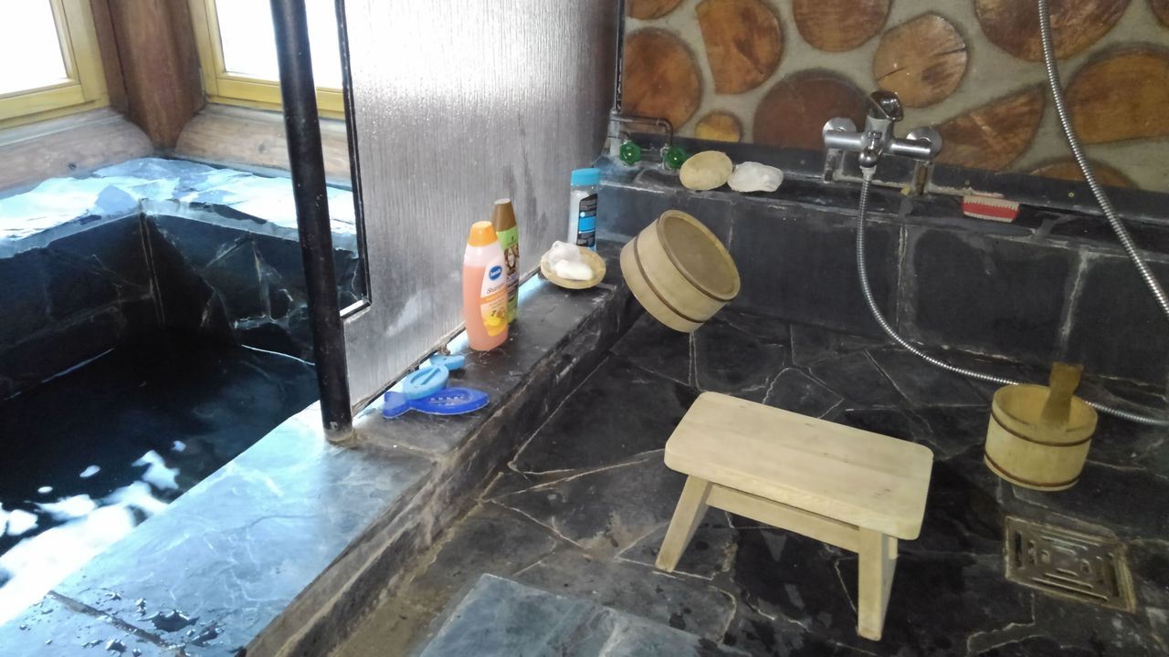 Zweitens das dahinter im Fachwerkstil einstöckig gebaute Saunagebäude mit großem Wellnessbereich und japanischem Felssteinbad (Iwaburo).