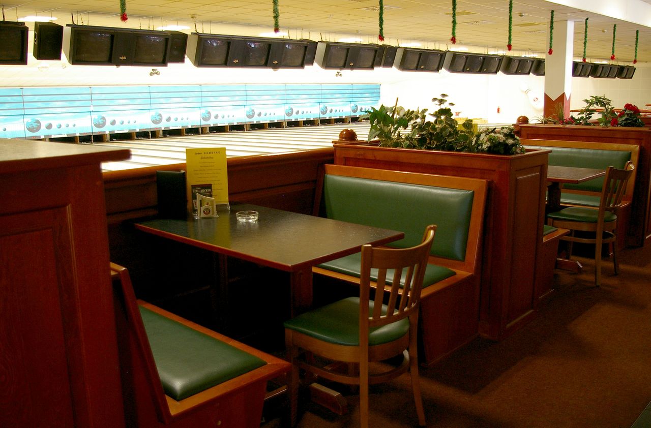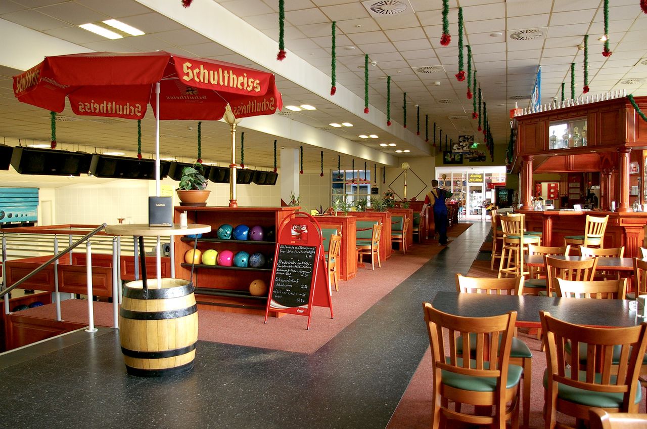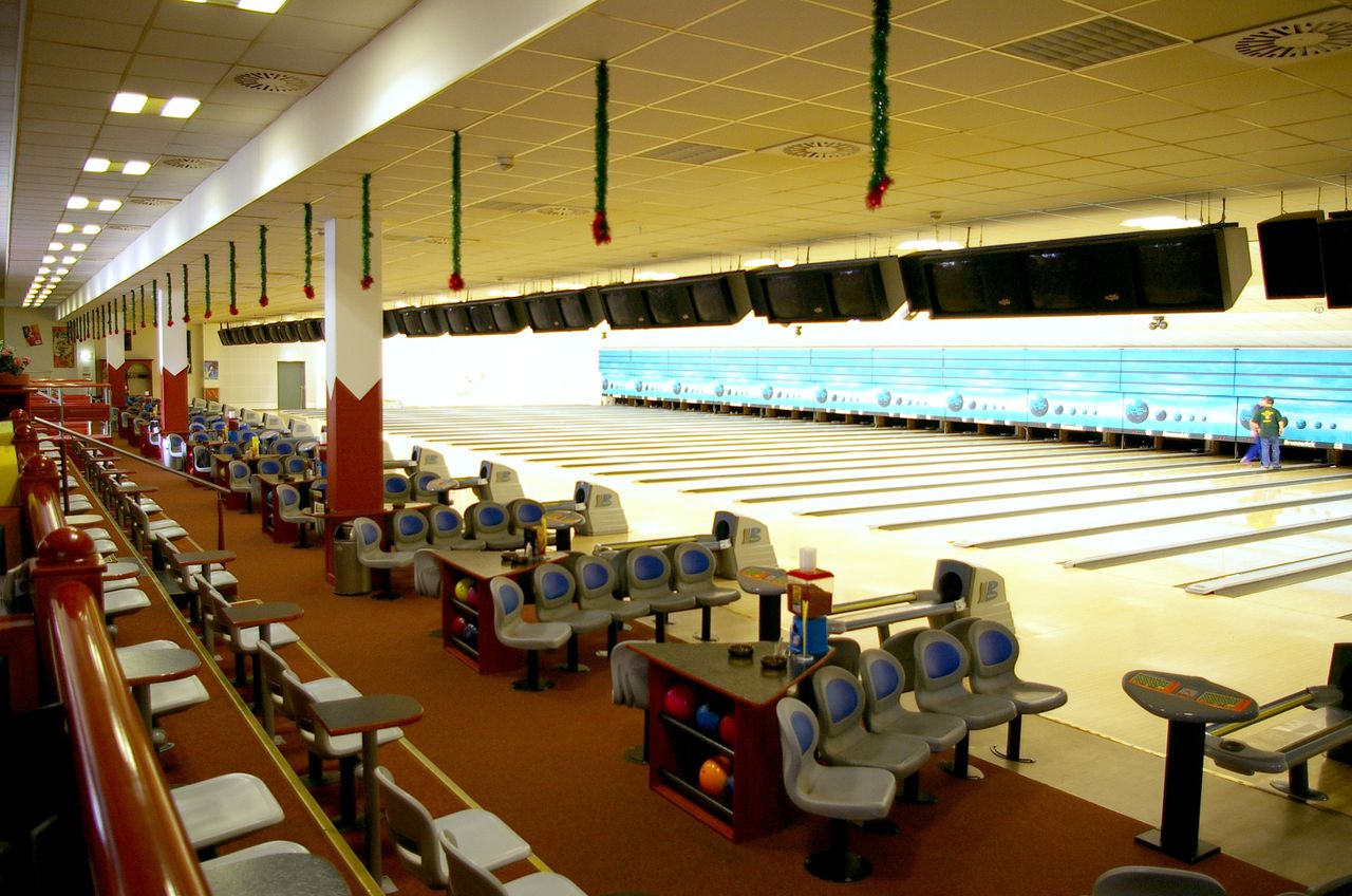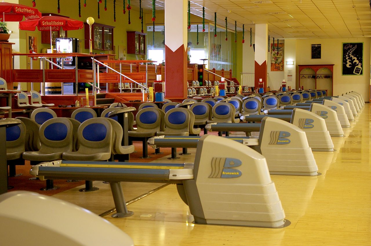 Große Halle mit Bowlingbahnen, Zuschauertribüne, Empfangstresen, und Kneipe / Restaurant