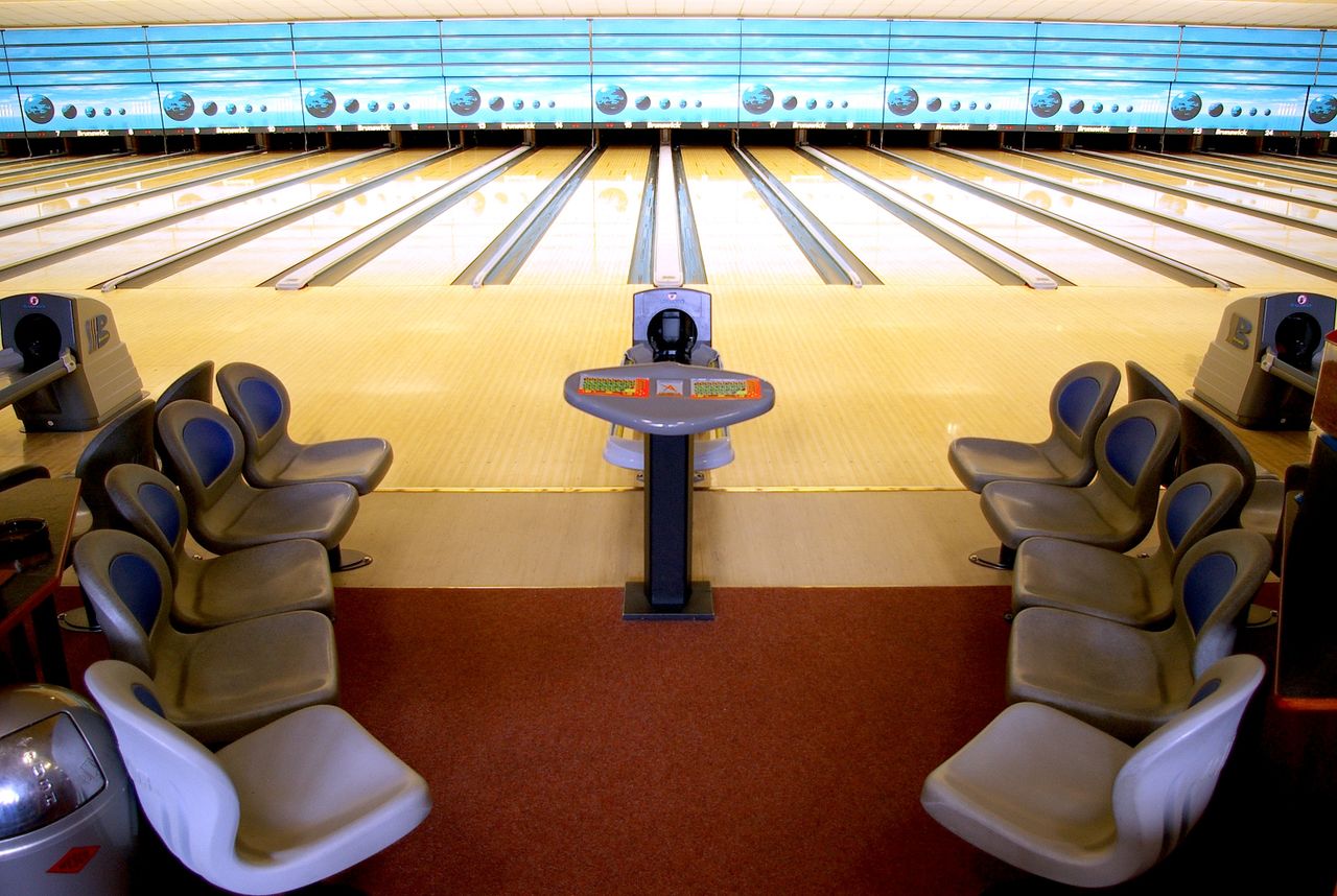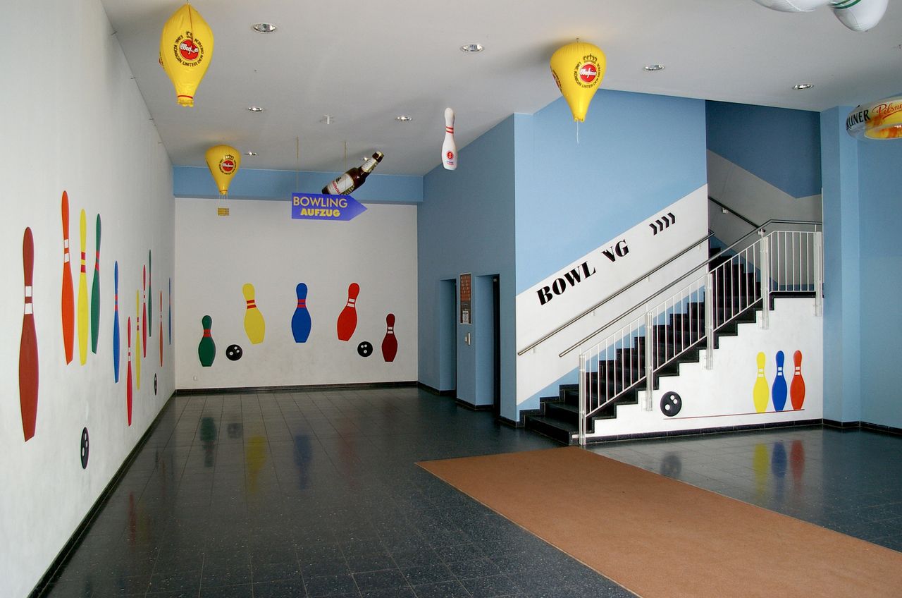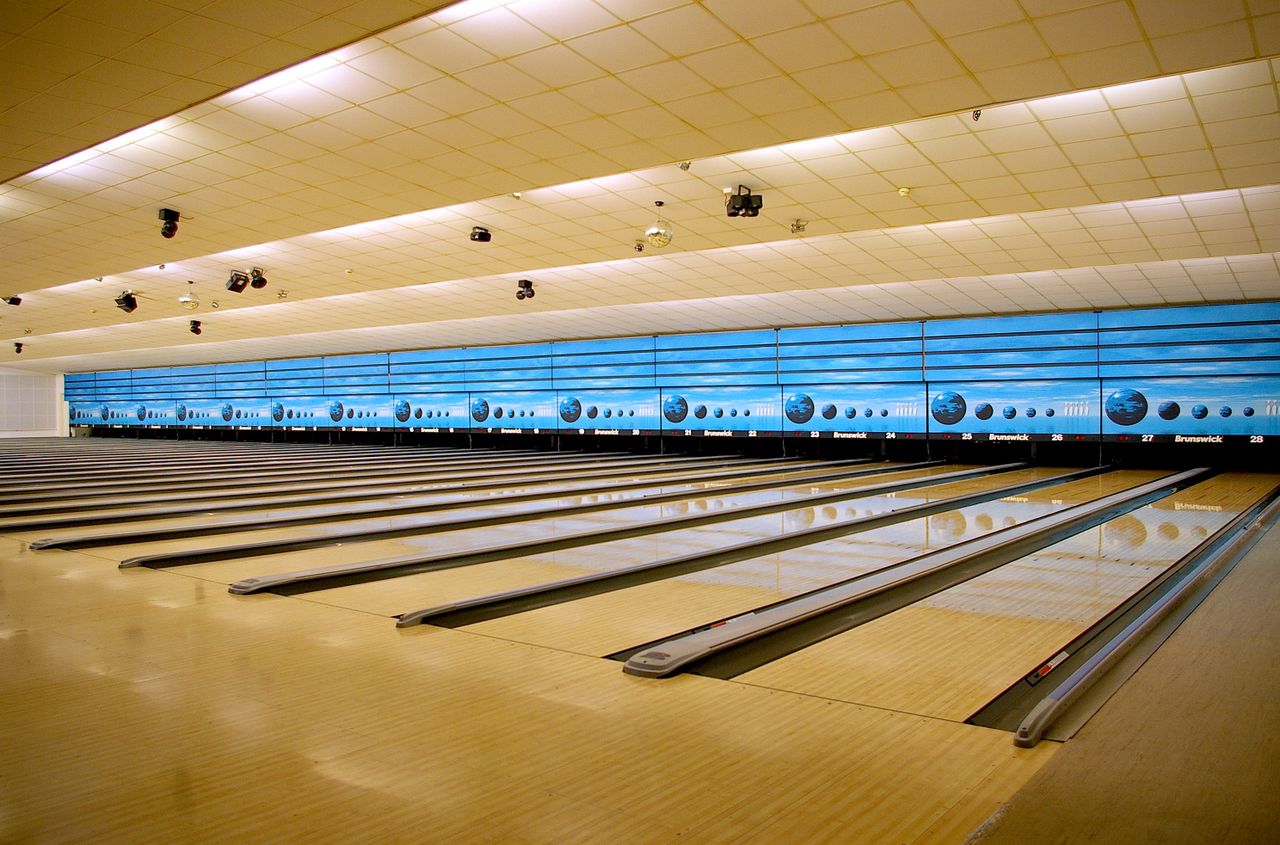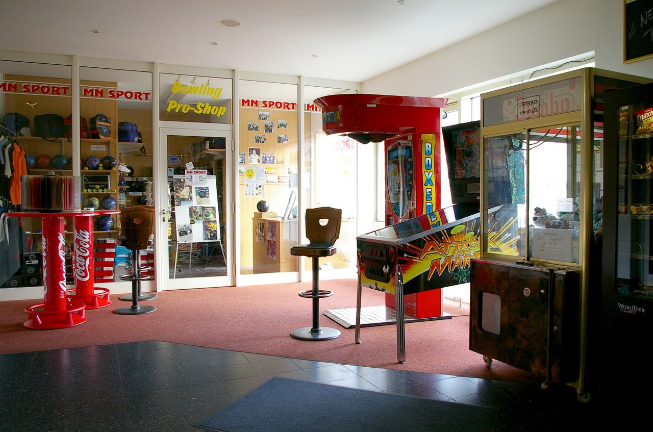 Große Halle mit Bowlingbahnen, Zuschauertribüne, Empfangstresen, und Kneipe / Restaurant