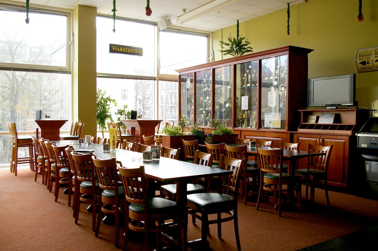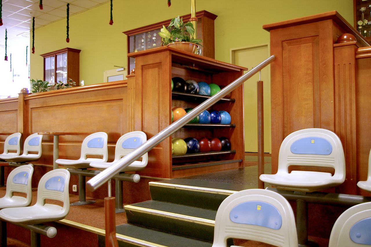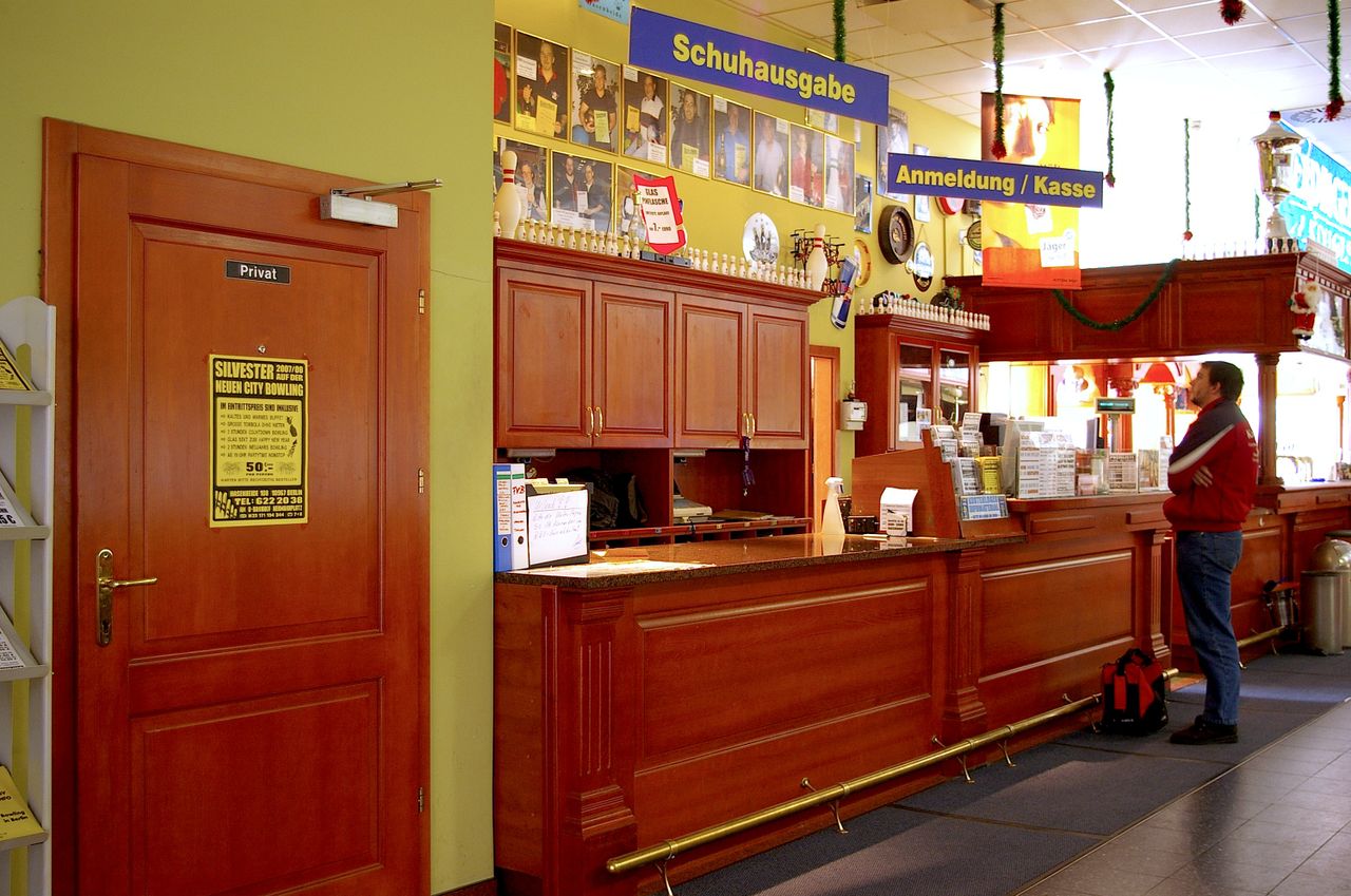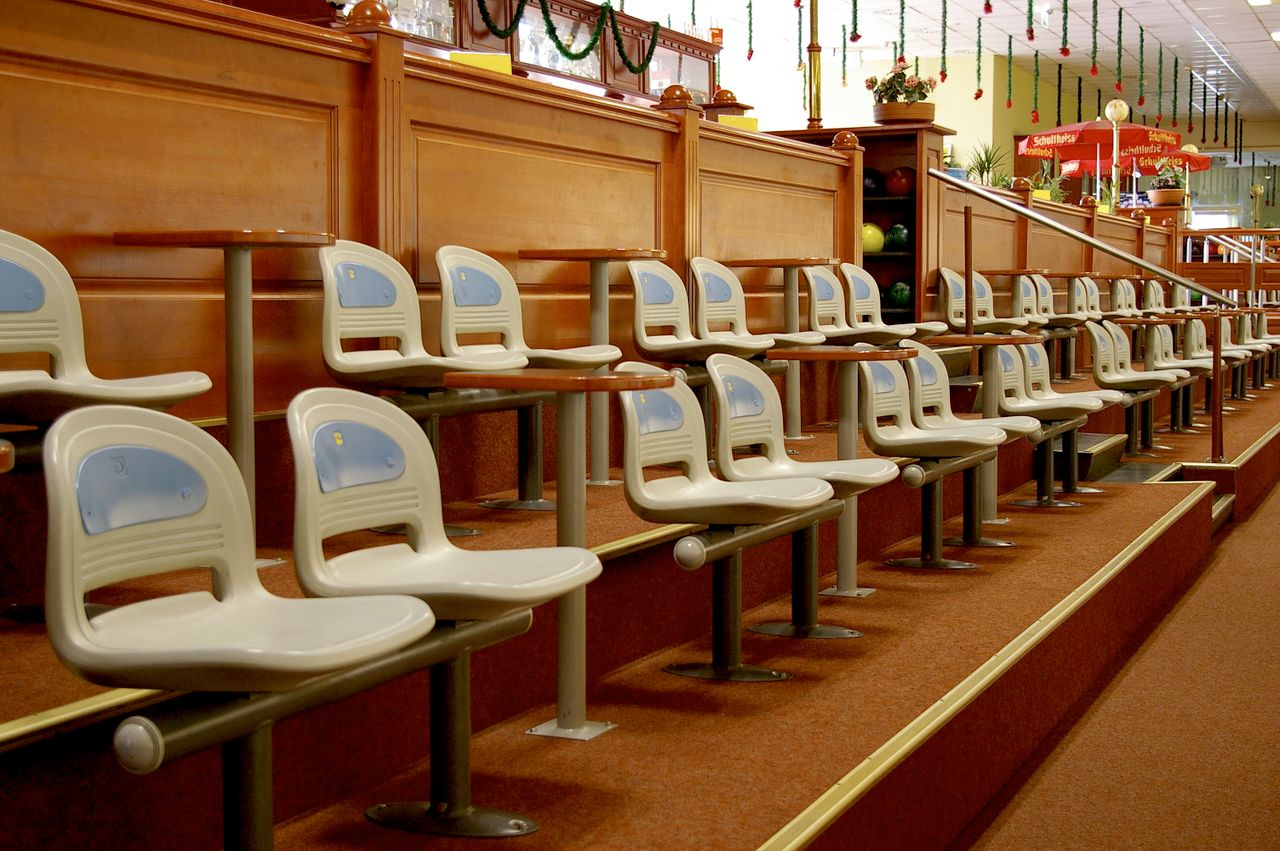 Große Halle mit Bowlingbahnen, Zuschauertribüne, Empfangstresen, und Kneipe / Restaurant