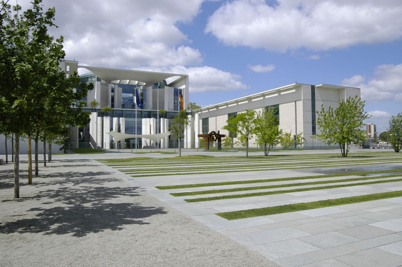 Das deutsche Bundeskanzleramt wurde von den Architekten Axel Schultes und Charlotte Frank entworfen. Im Zentrum des Gebäudes liegt ein 36 Meter hoher Kubus mit einem