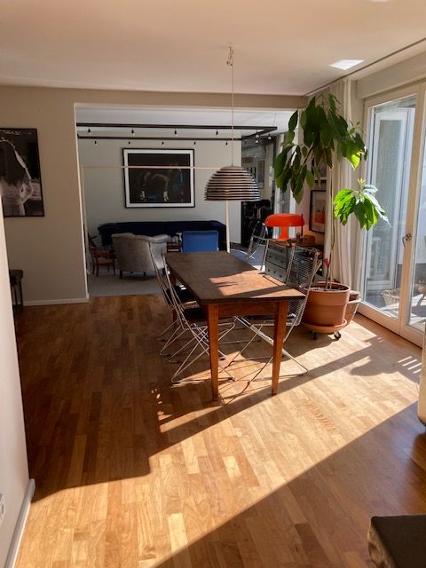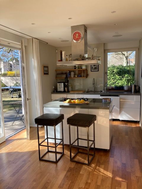 Ein sonniger Bungalow. Alle Fenster gehen bis zum Boden, so dass man ebenerdig raus und reingehen kann. Rundherum Garten. Ein großer Wohn/Essraum, offene Küche. Ein Schlaf- und ein Arbeitszimmer. Im Keller ein Billiardraum. Zwei Terassen. Holzboden oder Tretfort Teppich. Hochwertiges Mobilar. Gute Kunst. Im Wohn/Essraum sind Rolläden vorhanden, die es möglich machen die Räume abzudunkeln.