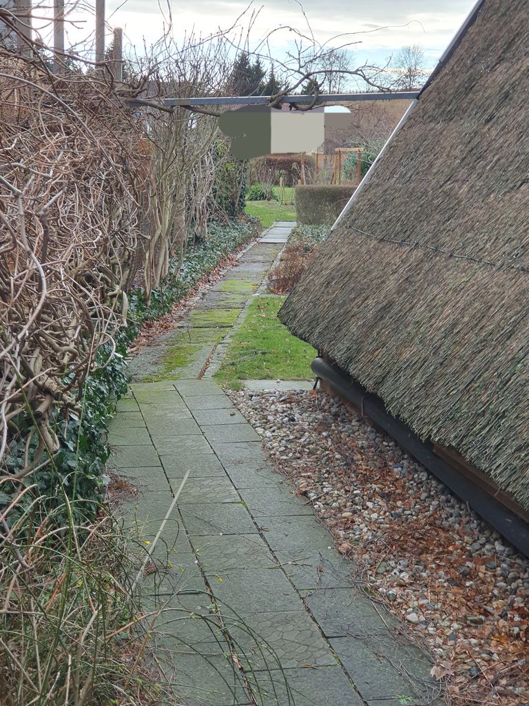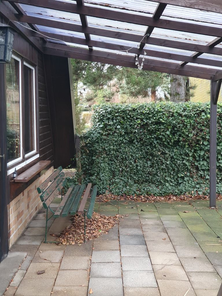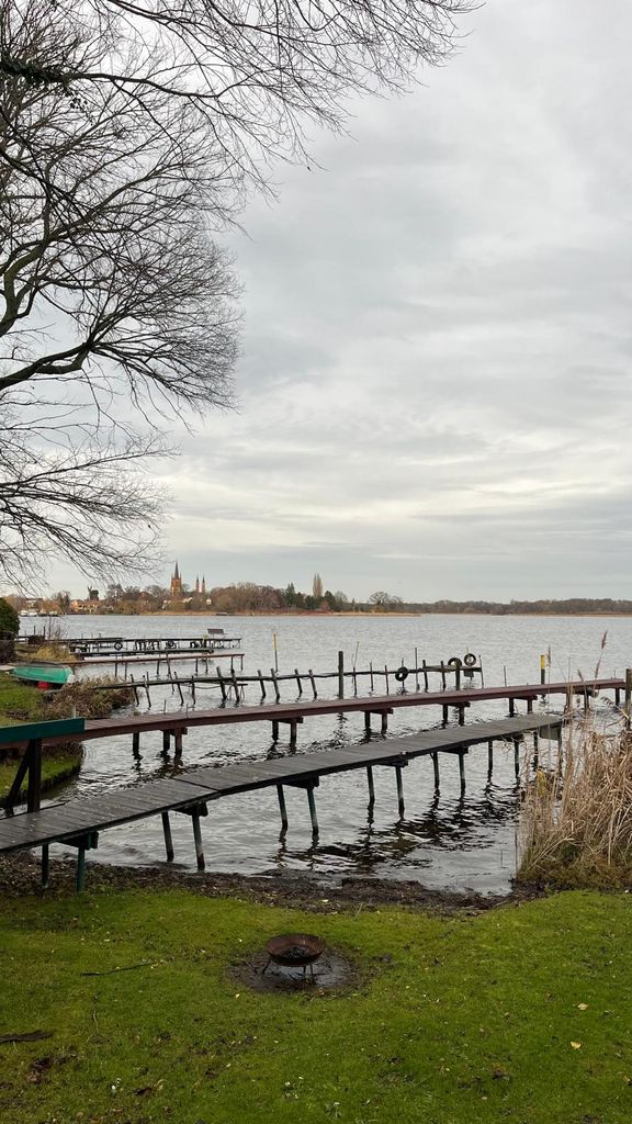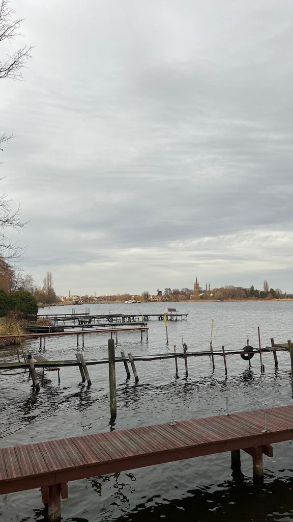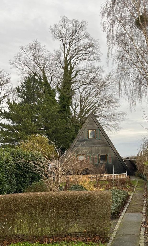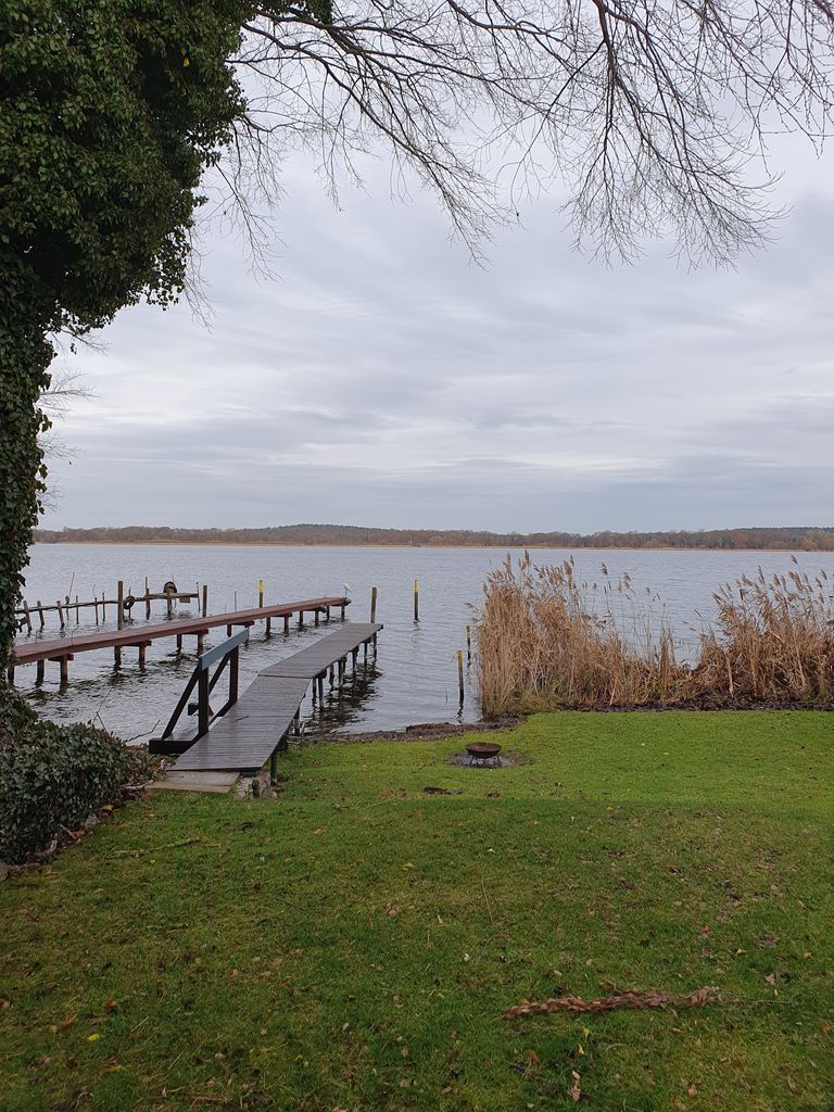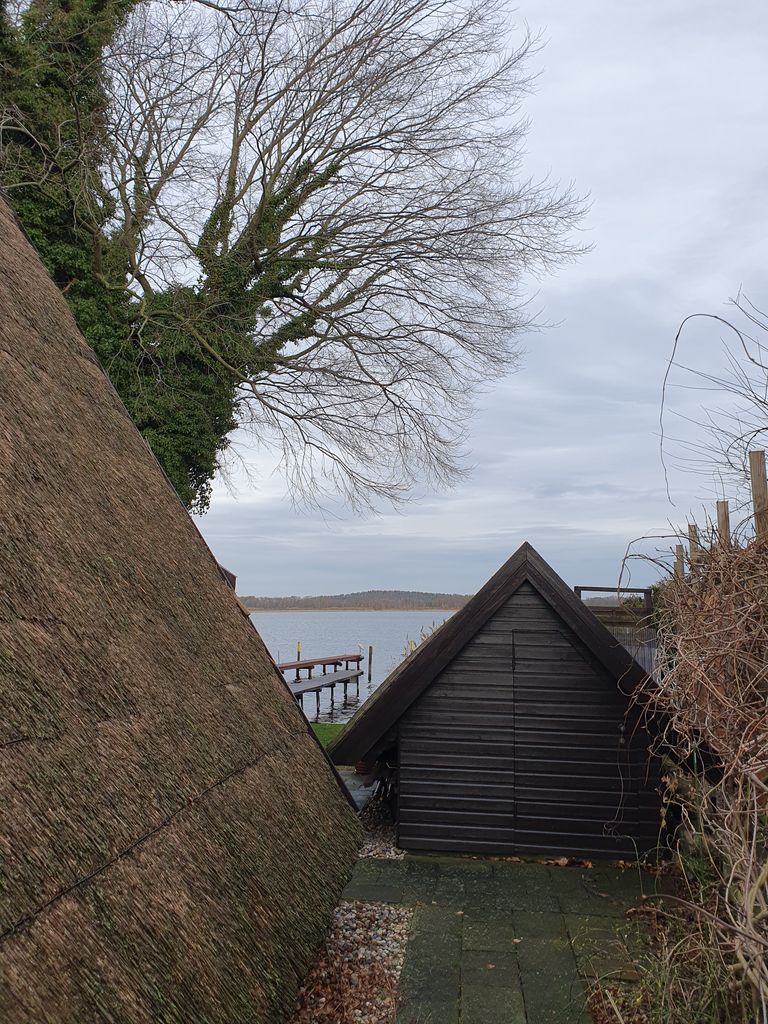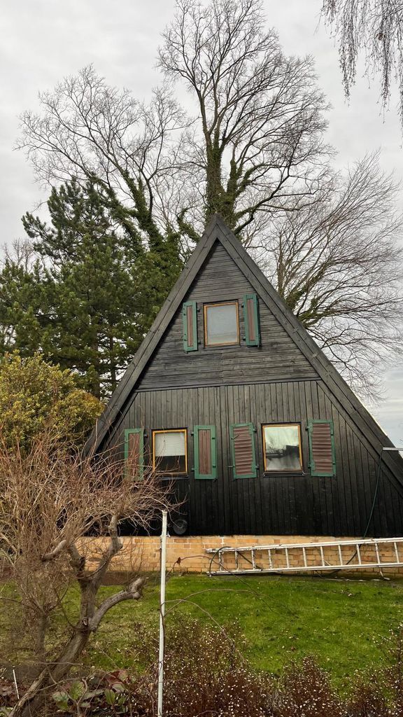 Kleiner Bungalow/Finnhütte mit Reetdach und Steg für ein kleines Boot an der Havel in Werder. Schöner Blick auf die Werder Insel.