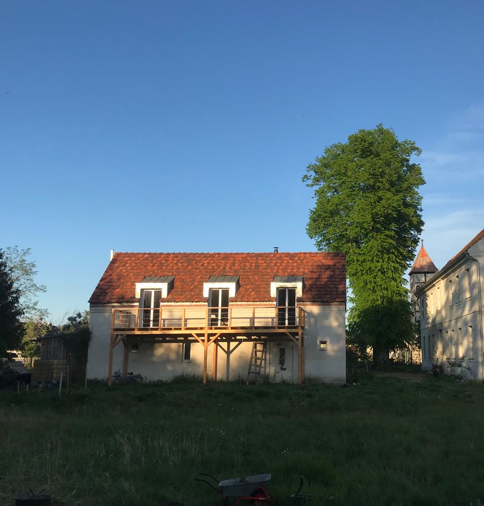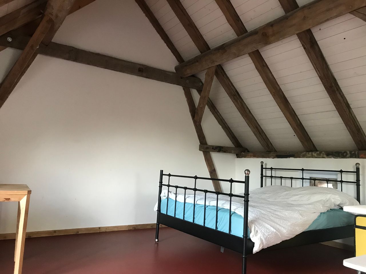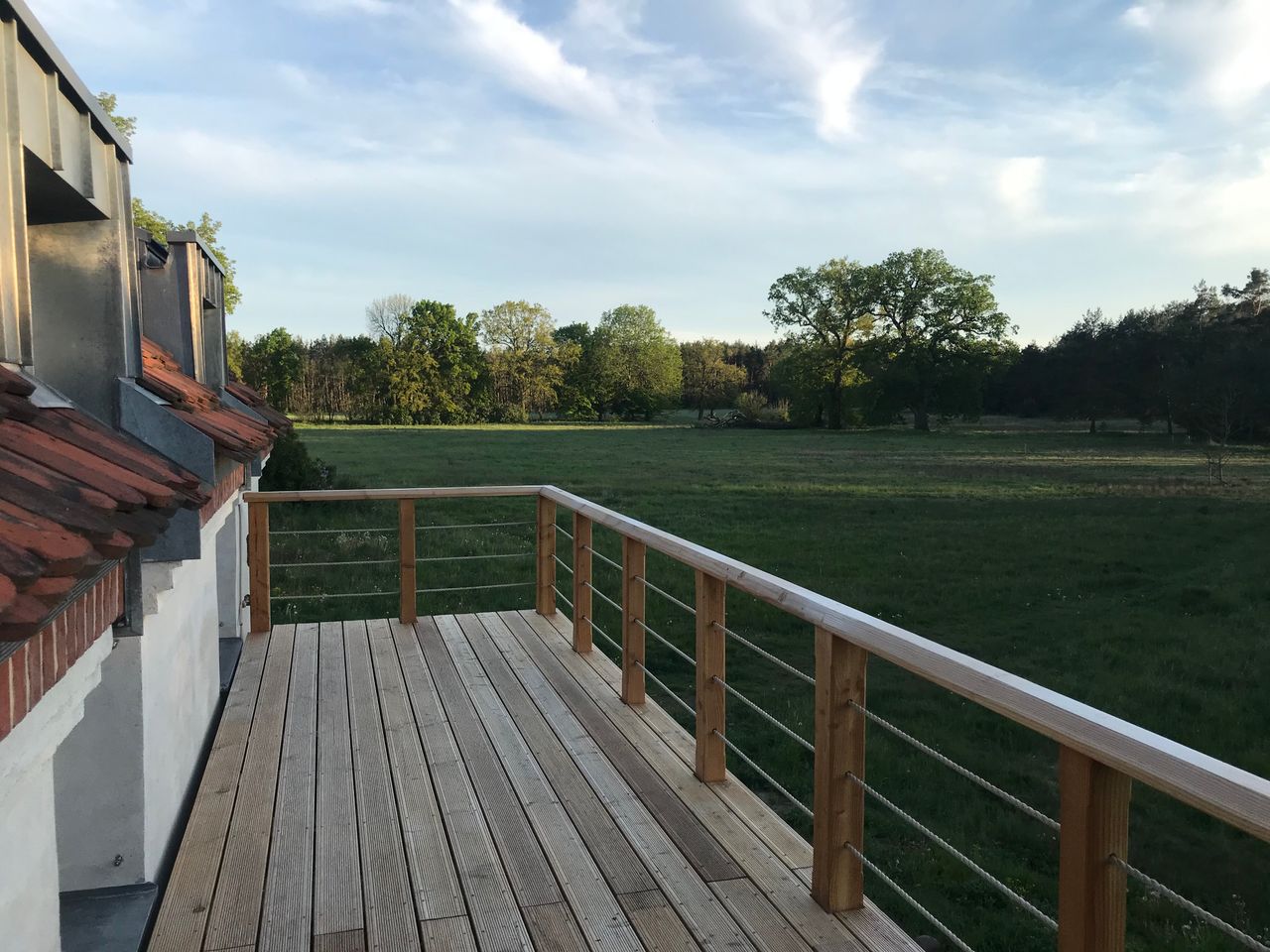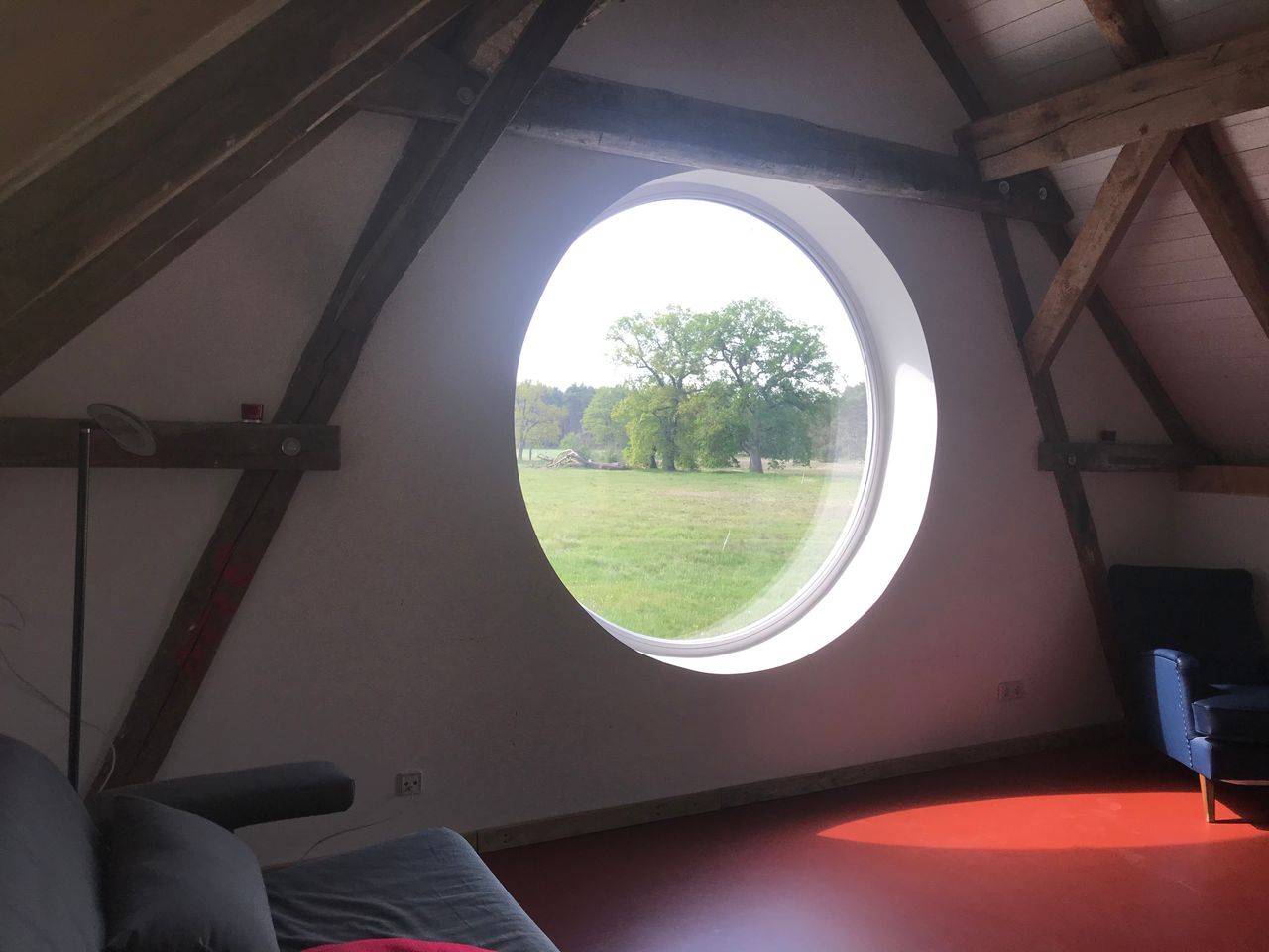 Im Dachgeschoss mit freiliegenden Dachbalken des alten Schafstalls öffnet sich überraschend ein einziger 70 m² großer Loft-Raum. Hier ist mehr als genug Platz für Wohnen und Arbeiten; denn W-LAN und schnelles Internet warten schon. Eye-catcher ist das große runde Südfenster zur Schlosswiese. Nach Westen geht es hinaus zum riesiggroßen Holzbalkon - das perfekte Frühstückszimmer (oder sundowner mit Blick zum Waldrand). Außerdem Wohlfühl-Fußbodenheizung und bullige Wärme durch den knuffigen Ofen mit Bratapfel-Platte.