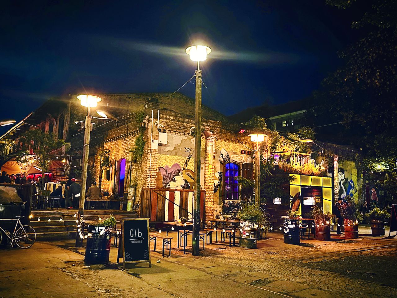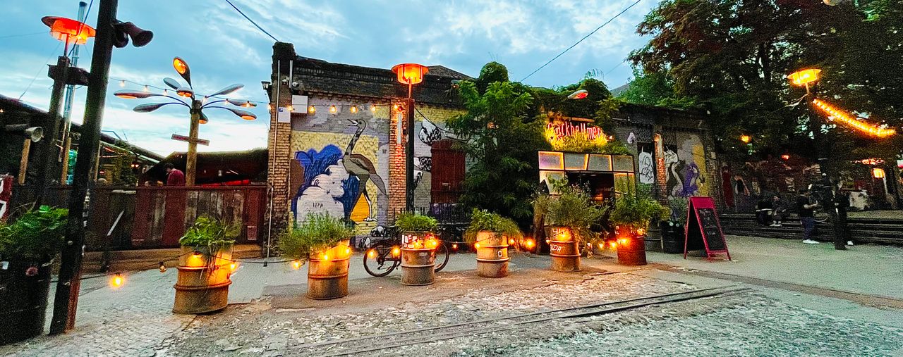 - Gebäude: Im luftigen, 200 Quadratmeter großen Backsteingebäude erwartet Sie ein hoher Tanzsaal mit moderner langer Bar. Die abgetrennte Lounge, ausgestattet mit Honeckers Kronleuchter und einem kleinen „Balkon“, ist von Holz und altem Giebelwerk eingerahmt und bietet eine einzigartige Szenerie.