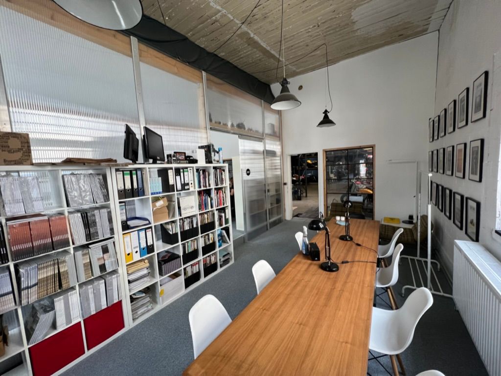 Showroom: 170qm, Motorradklassiker auf Regalen, Oberlicht, 3 vergitterte Fenster,
