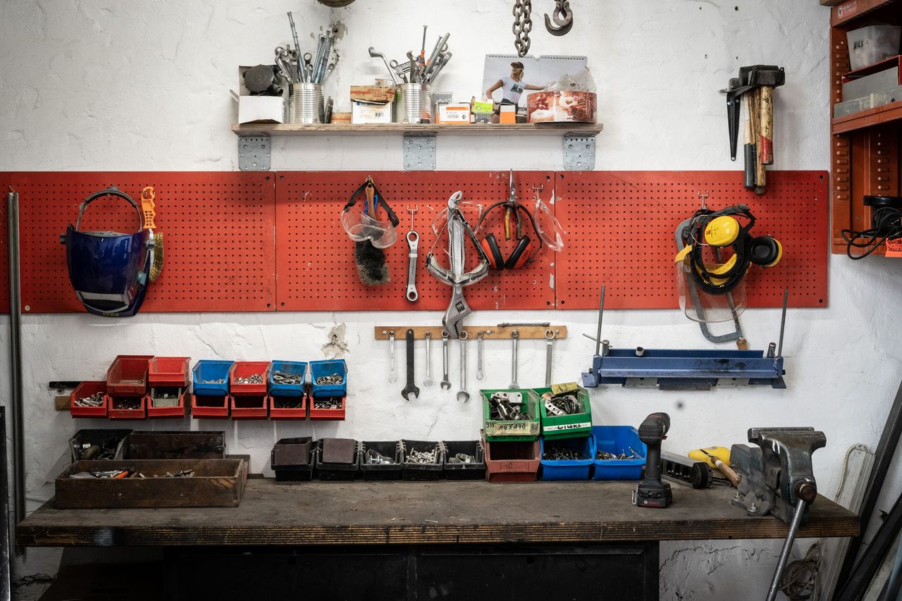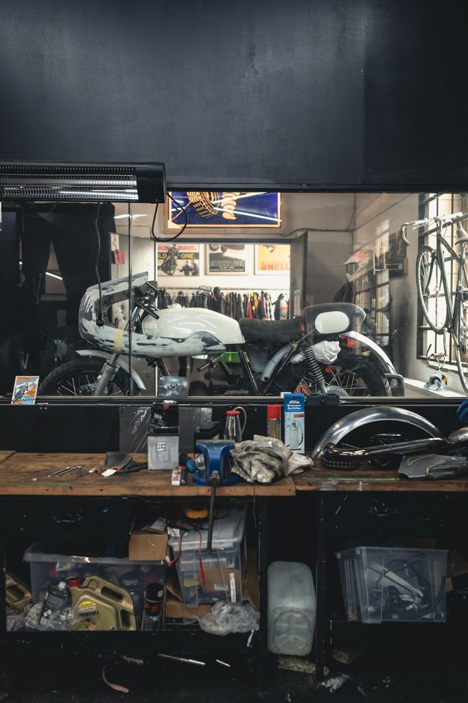 Werkstatt I: 80qm, 2 Motorrad-Arbeitsplätze, alte Struktur, große Fensterfront zwischen Kantine und Werkstatt, sieht alles gemütlich und oldschool aus