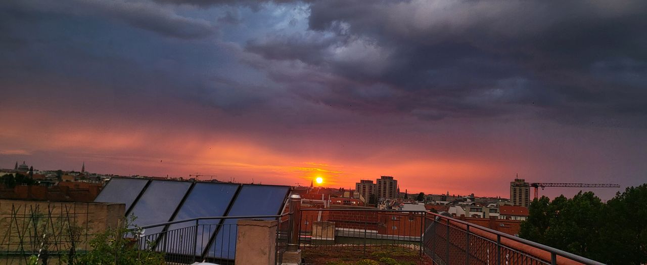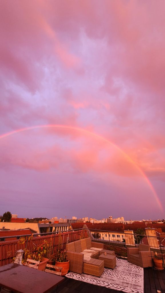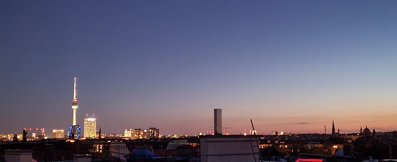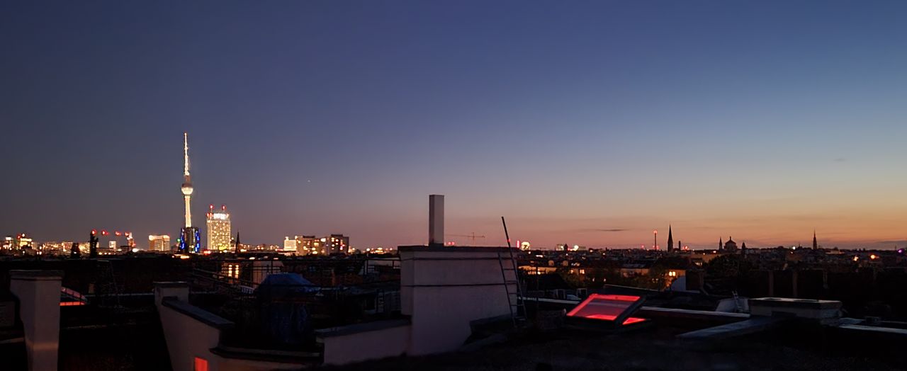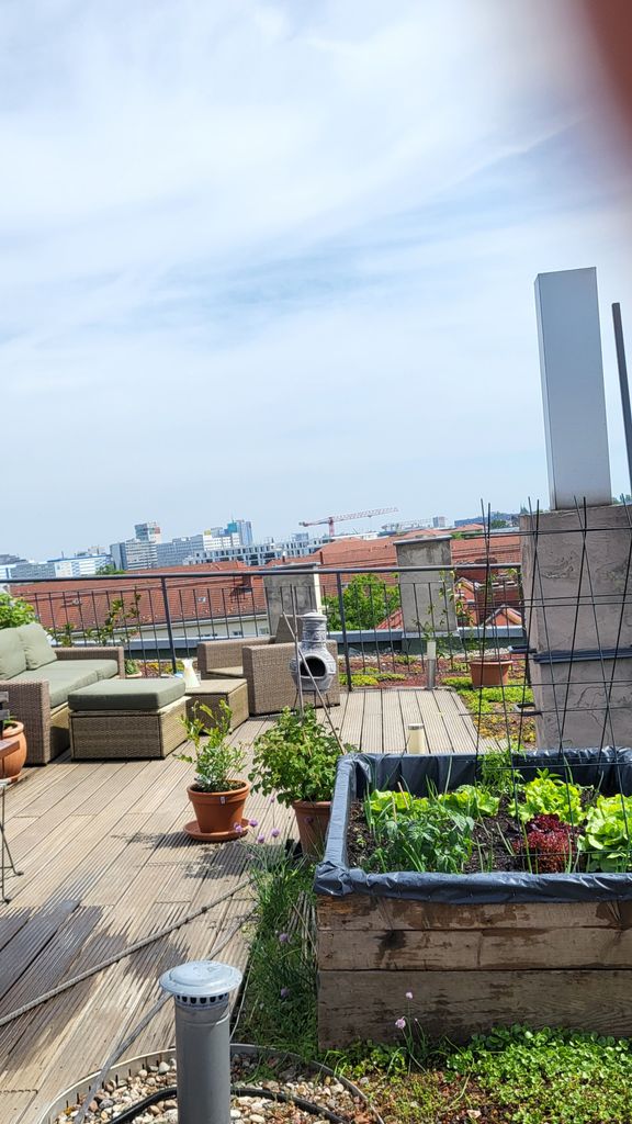 Die Dachterrasse ist ca. 40m2 groß und hat einen tollen Blick auf die Skyline mit Fernsehturm. Es gibt in der Umgebung kein höheres Gebäude, dass die 360°Aussicht stehlen könnte. Ein Fahrstuhl in den 5. Stock ist vorhanden und eine Wendeltreppe welche die untere Terrasse von der Dachterrasse trennt.