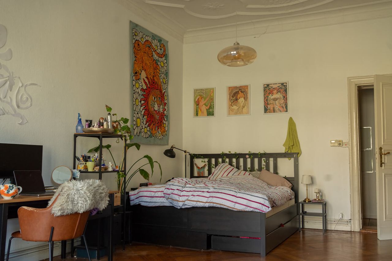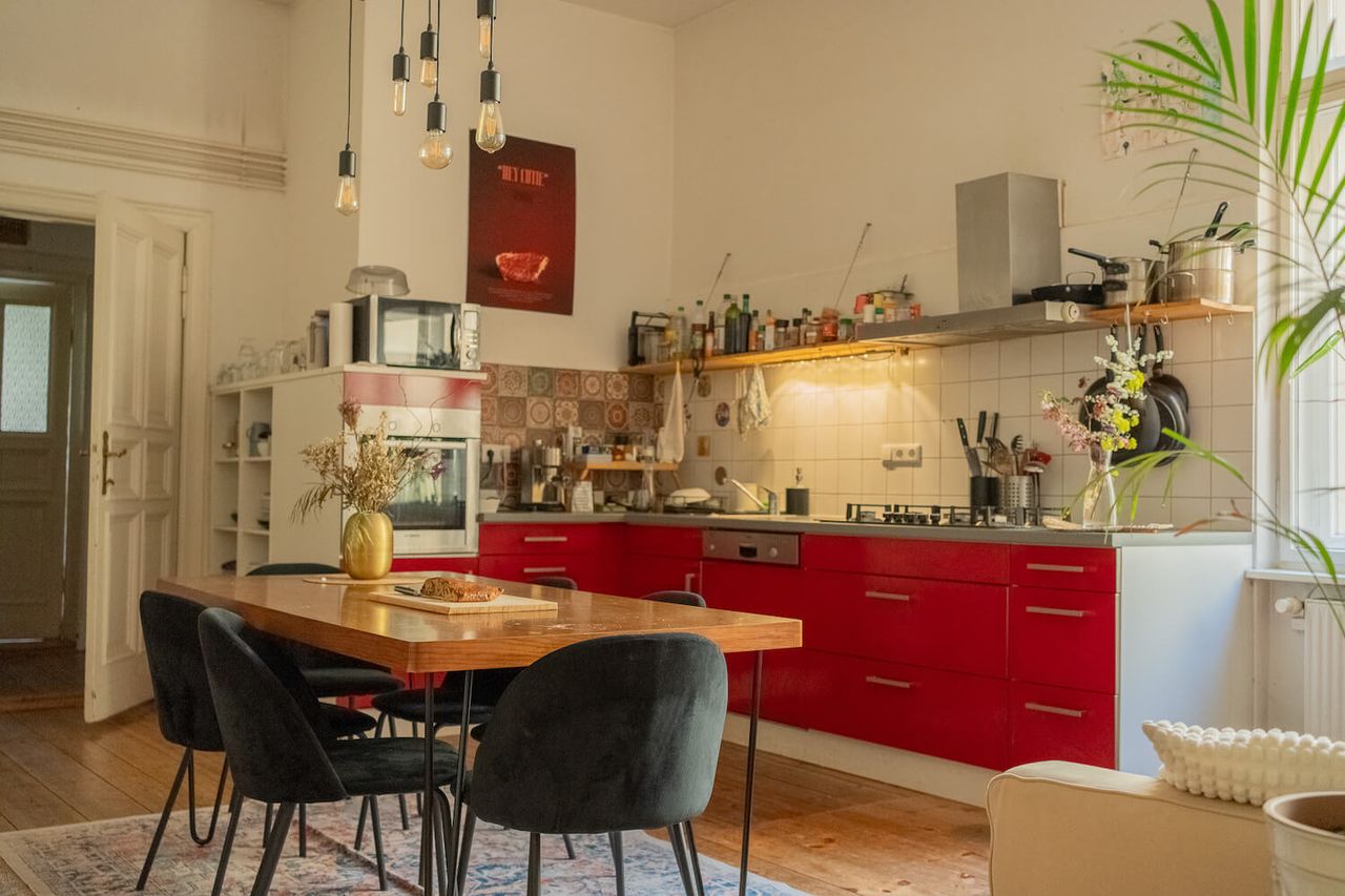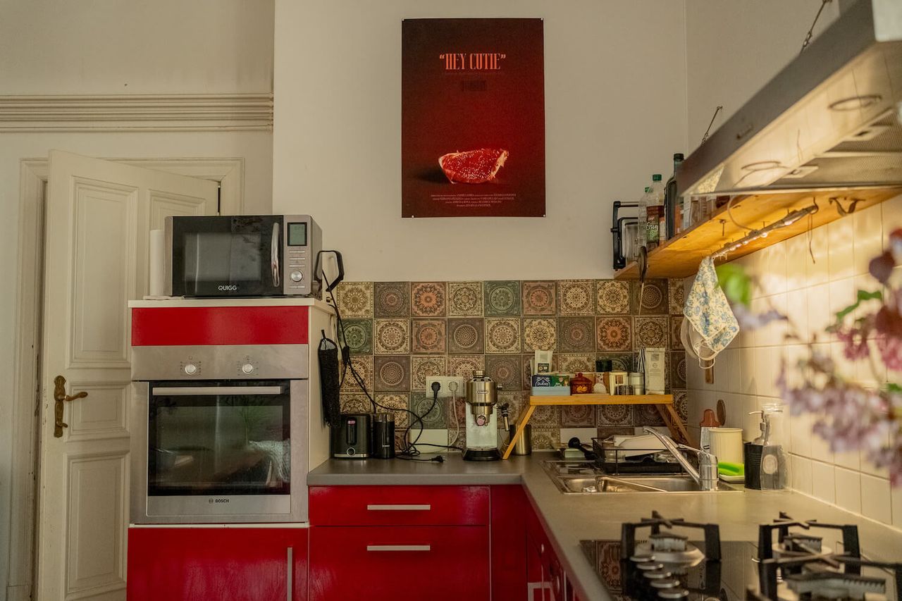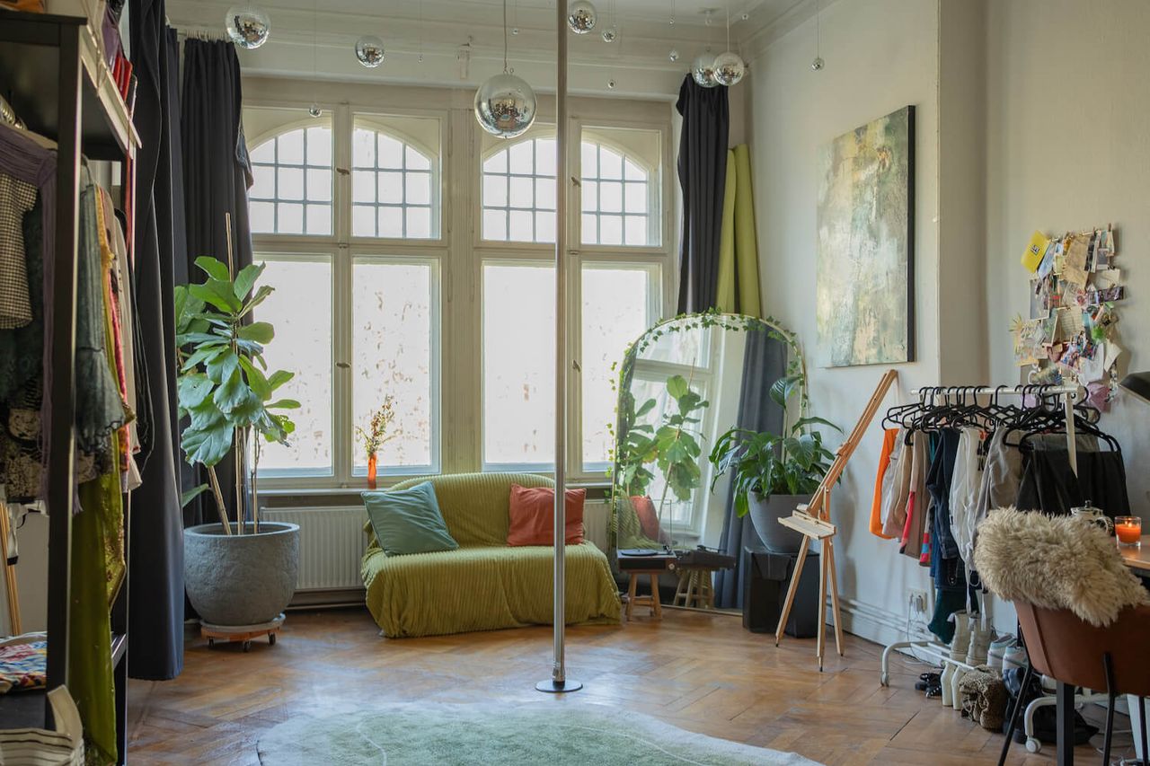 ENGLISH: Beautiful Altbau bones with a cheeky twist. This Home Studio is ideal for shoots that want a bit of character, a bit of attitude, and something that feels a little less… predictable. The bedroom is generously sized with soaring ceilings (high enough to have been fitted with a dancing pole), creating a bold and playful setting with plenty of room to work with. You’ll also have access to the open kitchen and dining area ~ a relaxed, lived-in space that works perfectly for more casual, lifestyle-style moments (or just a change of scene mid-shoot).