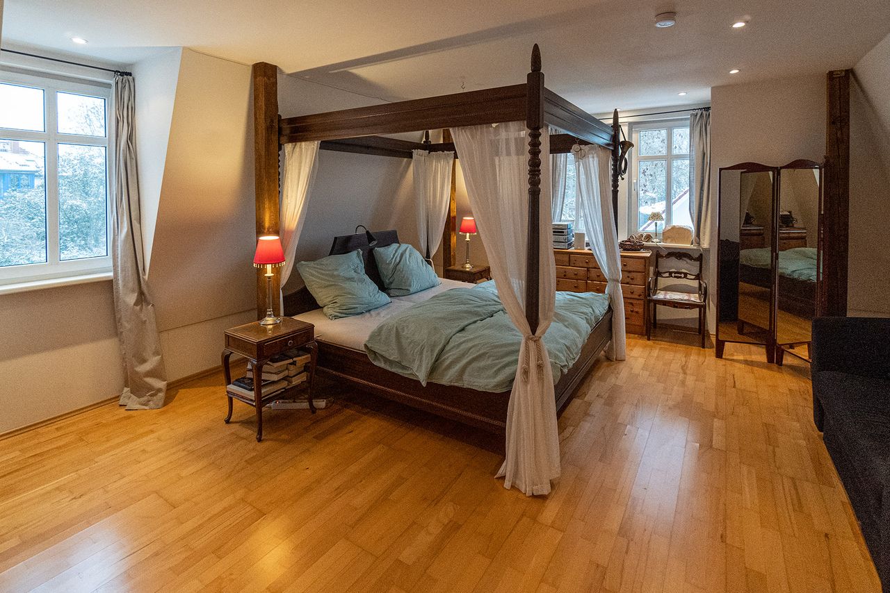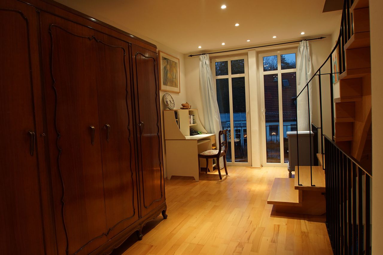 Einfamilienhaus, freistehend mit ca. 250 qm Fläche. Großzügige Räumlichkeiten im EG mit breiten Durchgängen (Türöffnungen). Die Terrasse ist an mehreren Stellen (7 Terrassentüren) erreichbar. Im OG befinden sich außer dem abgebildeten Schlafzimmer noch 2 weitere Zimmer. Das Grundstück hat eine Größe von ca. 800 qm.