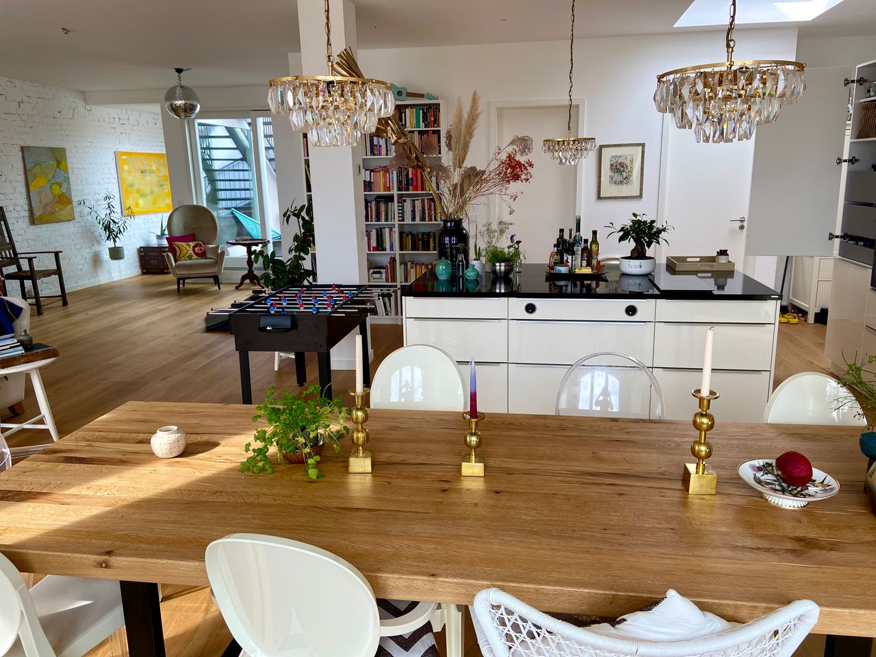 Die Einrichtung: Diskokugel, DJ Setup, Designermöbel, Kunst an den Wänden, Eichenfussboden, Bücherwand.