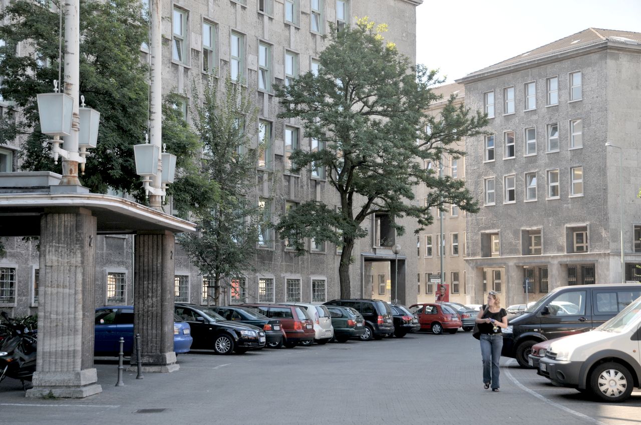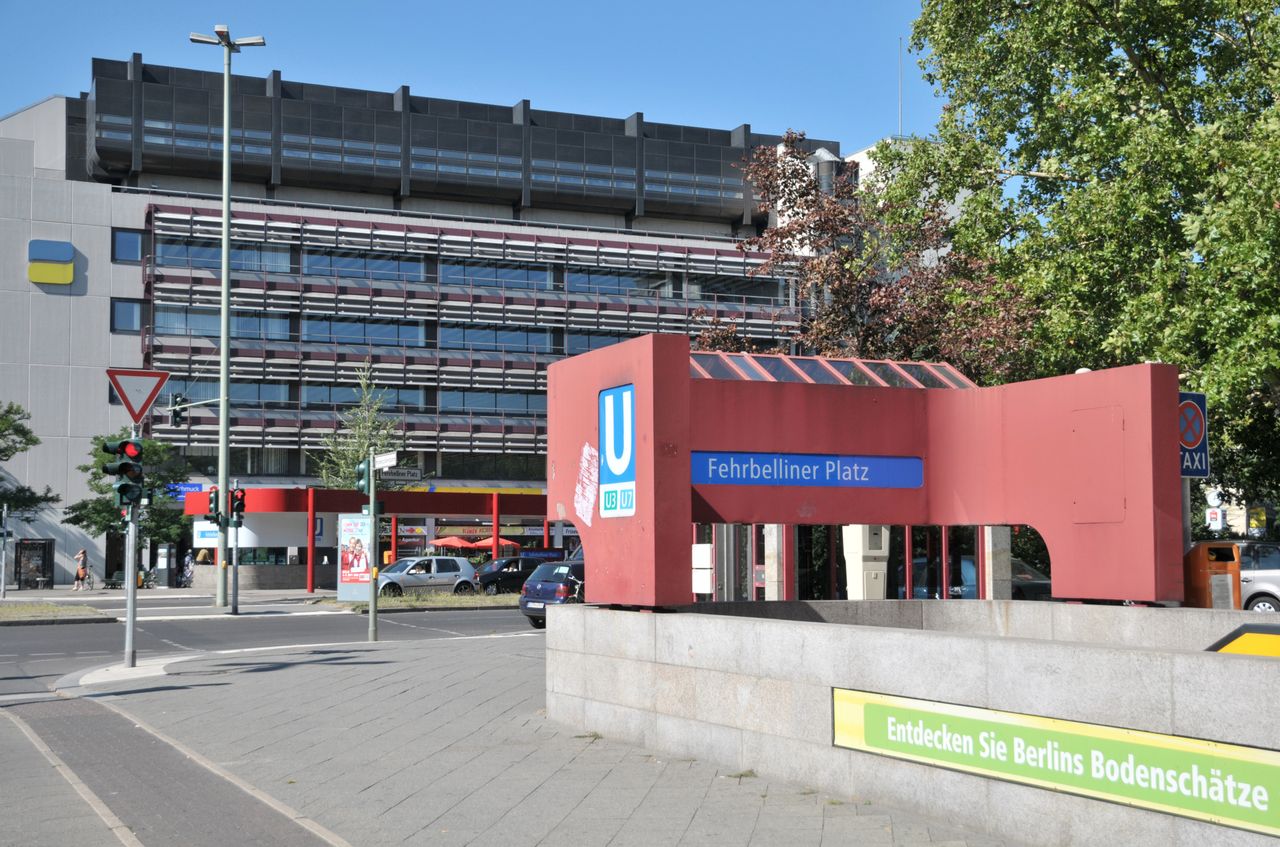 Stark befahrener Platz umsäumt von Ämtern und Wohnhäusern. Besonders auffällig sind das rot geflieste Eingangsgebäude zur U-Bahn Linie 7 und das Ratshaus Wilmersdorf